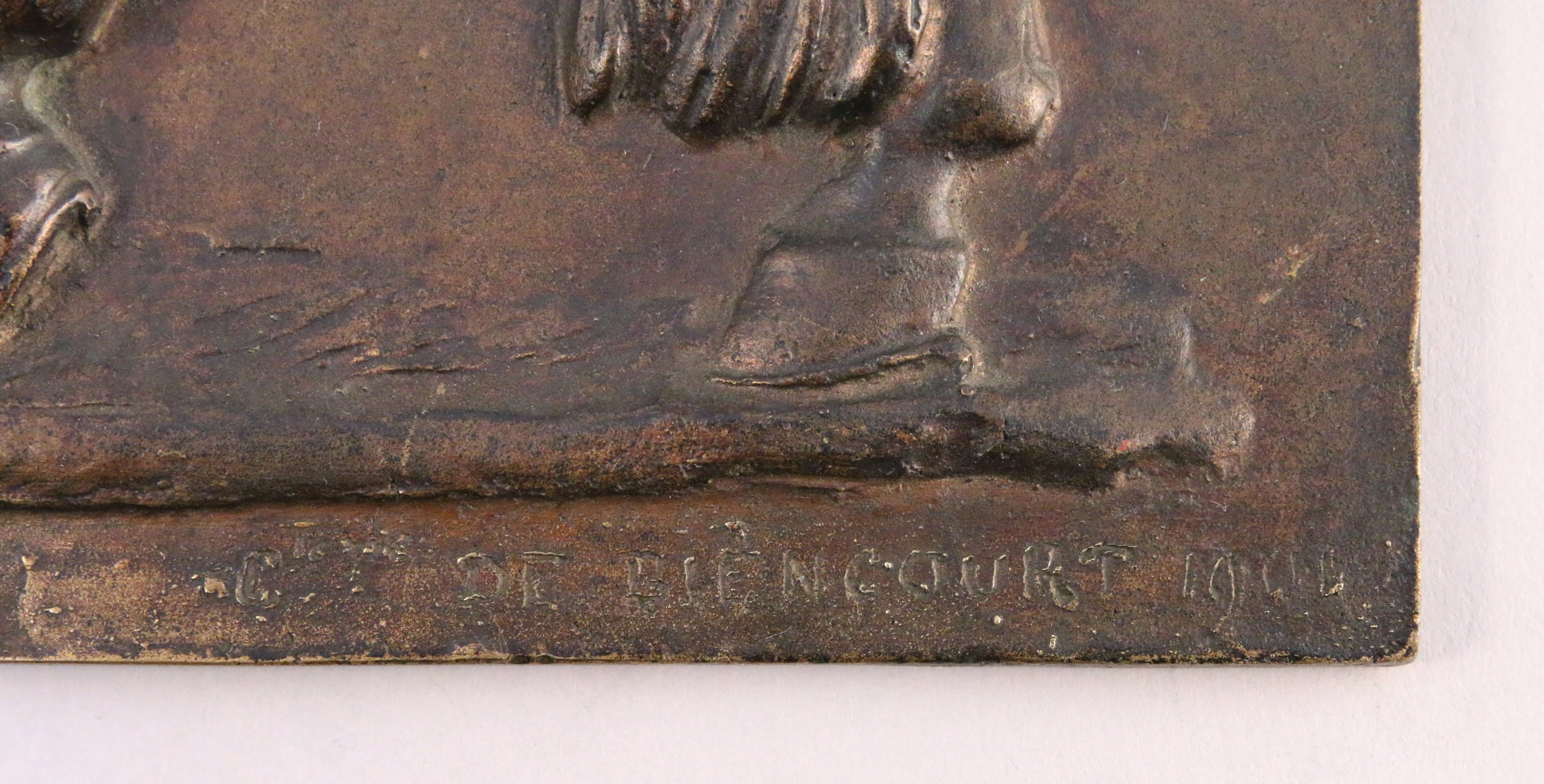 Plaque en bronze fondue et ciselée en haut relief gravée en haut à droite "HENRI DE MONTMORENCY COMTE DE DAMVILLE CONETABLE DE FRANCE NE A CHANTILLY EN 1534 MORT A AG.DE 1614".