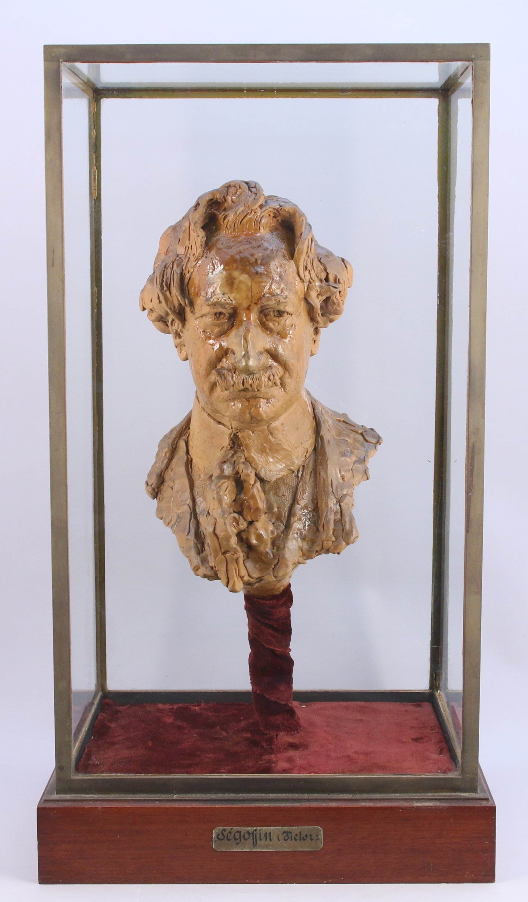 Présentée sous une VITRINE CAGE avec un support en bois portant un cartouche "Ségoffin (Victor)".