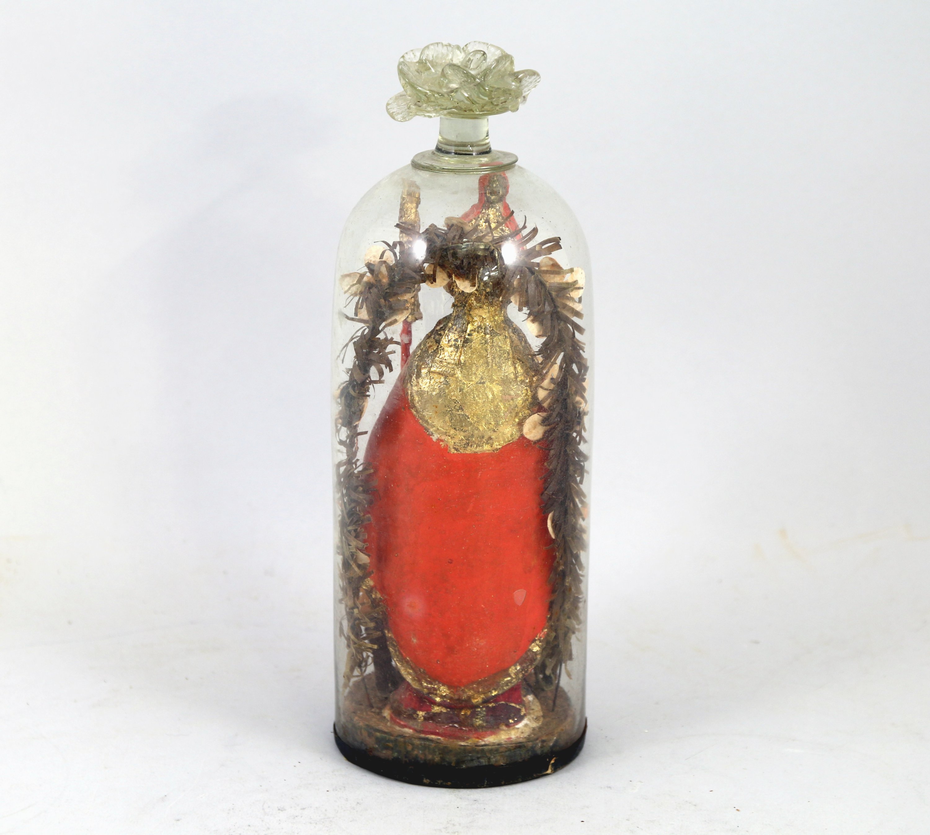 Sous une cloche en verre surmontée d'une prise en forme de fleur.