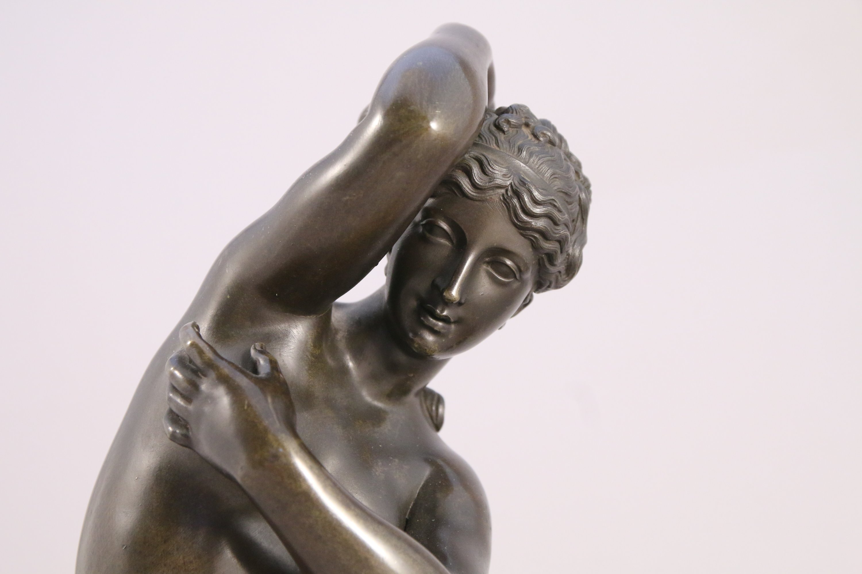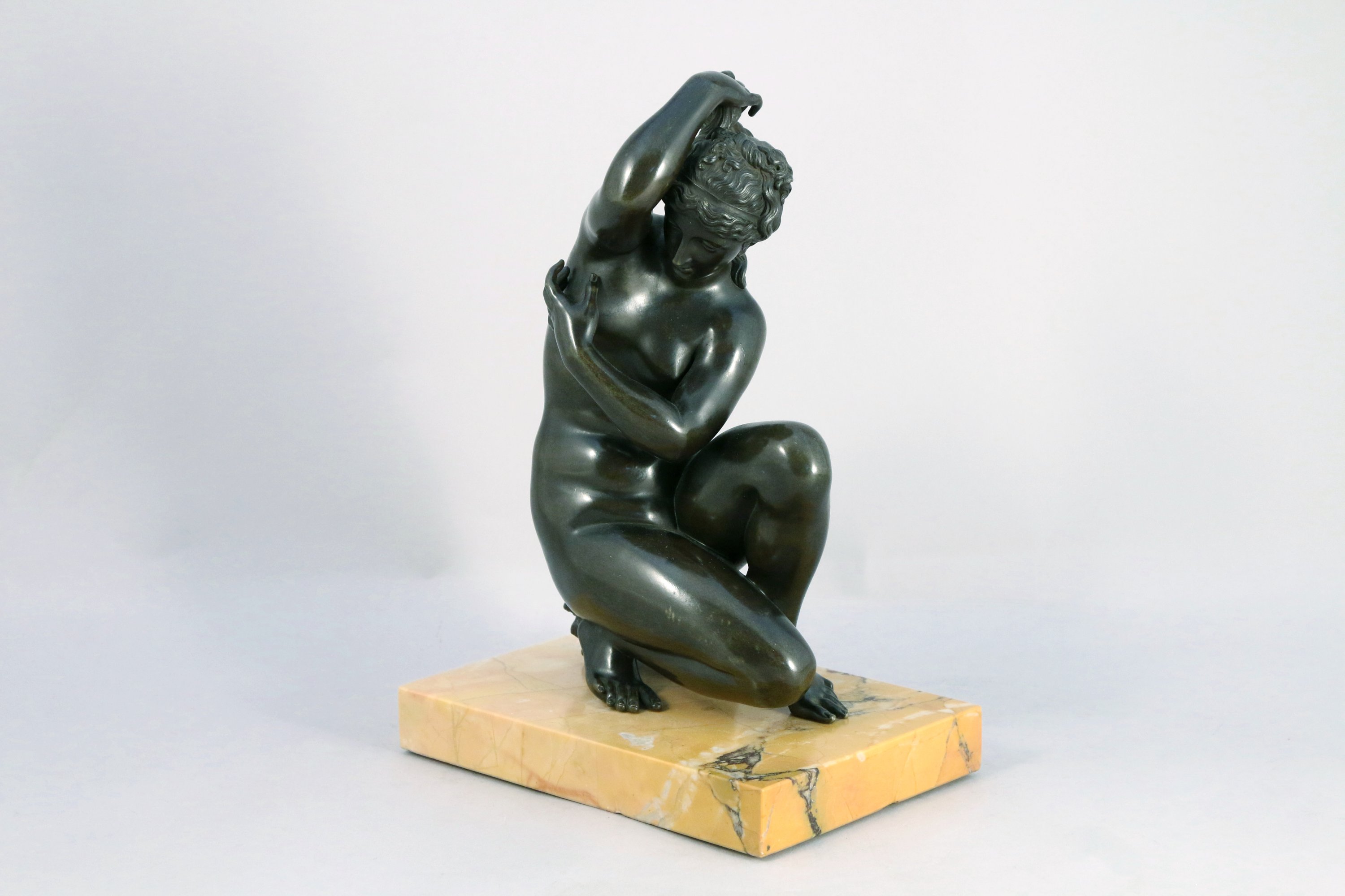 Épreuve en bronze à patine brune sur un socle en marbre ocre, non signé.