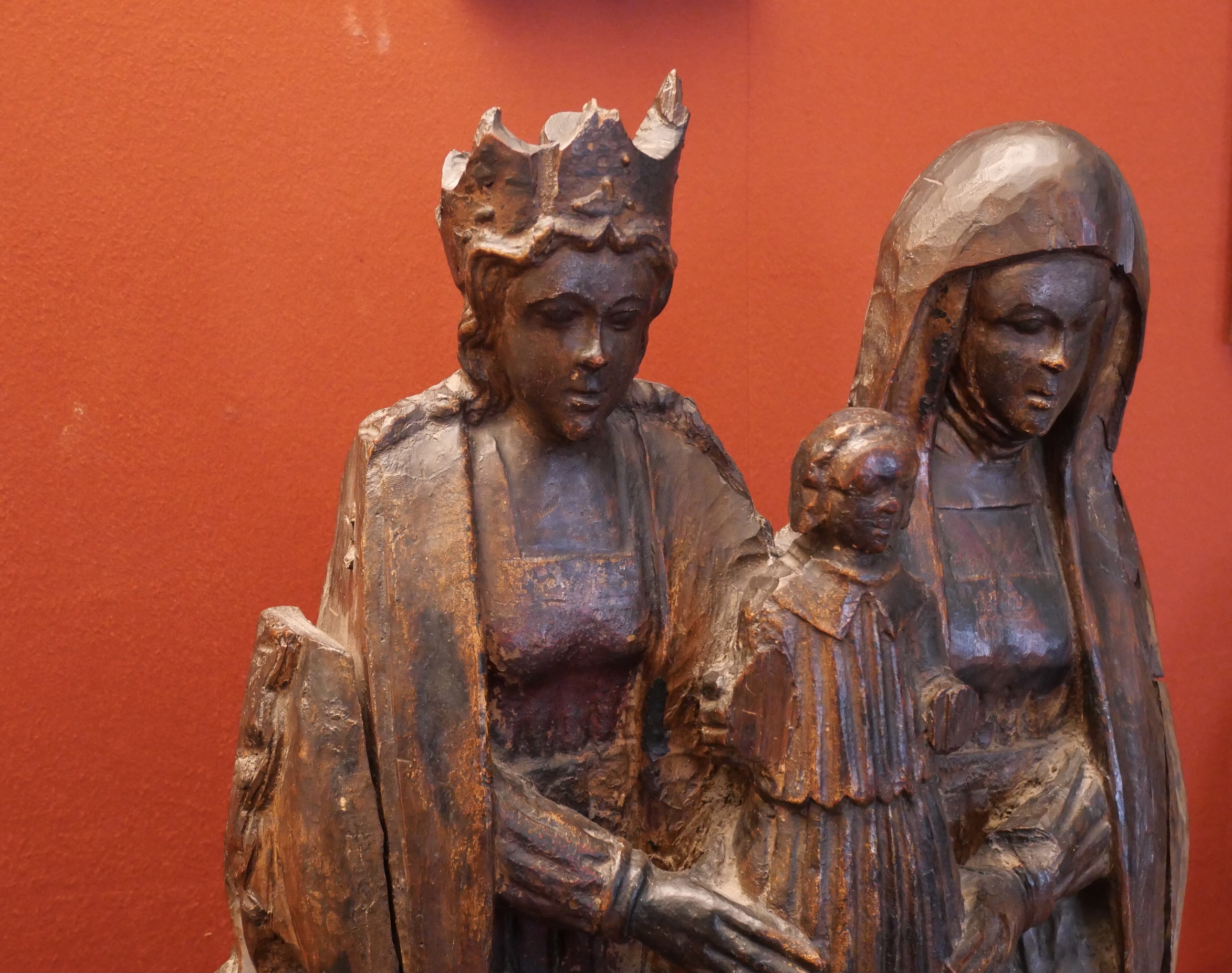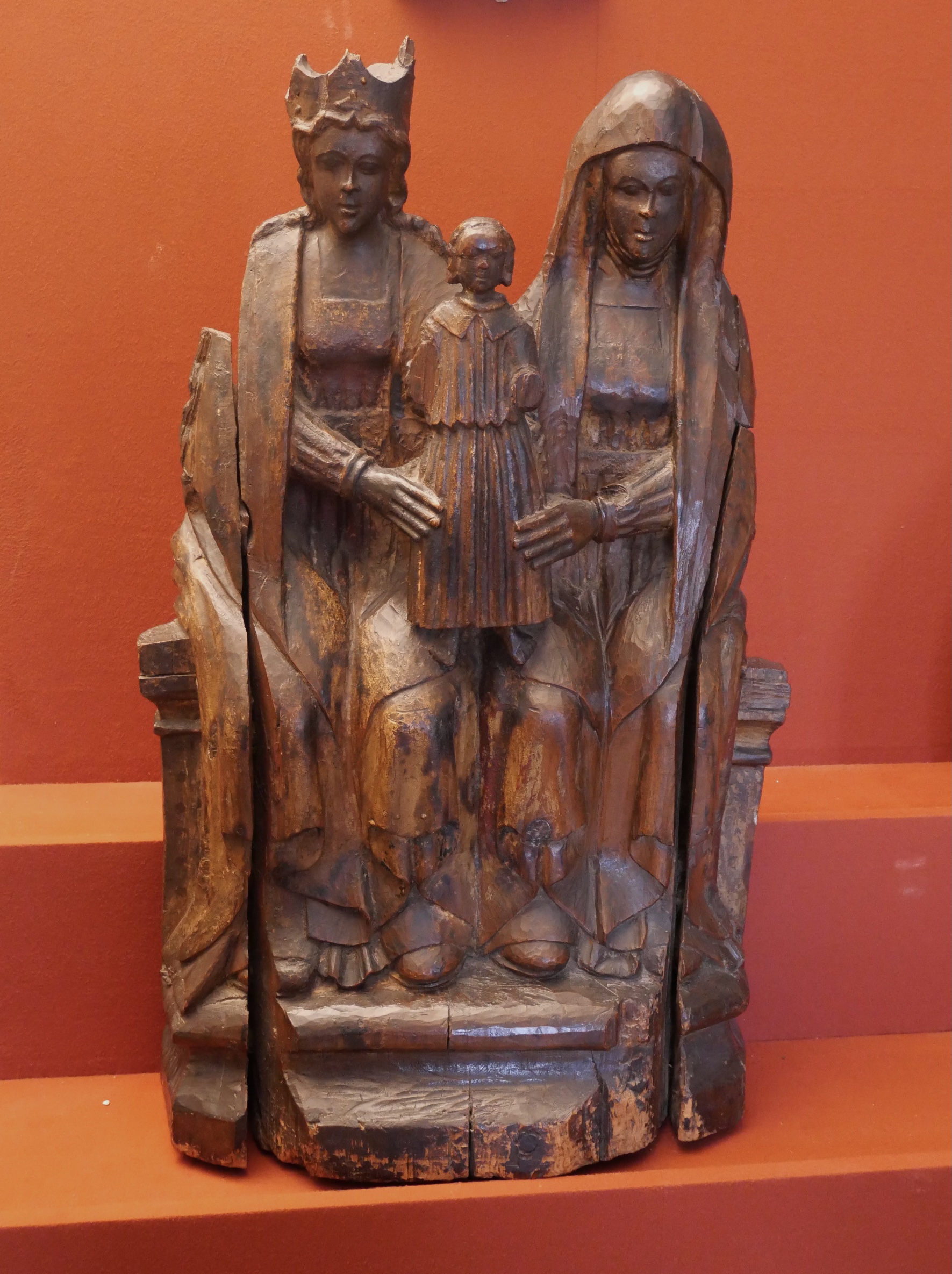 Anne et la Vierge Marie présentent le Christ enfant, debout sur leurs genoux, selon une iconographie appelée Sainte Anne trinitaire. La Bible ne fait pas cas de la généalogie de la Vierge, et par extension de la vie de Ste Anne, mais celle-ci connue un vif succès grâce à la Légende Dorée de Jacques de Voragine à la fin du Moyen Age. A la suite des visions de sainte Colette de Corbie au XVème siècle, ses représentations se multiplient et spécialement celle dont sinspire notre uvre: la figuration dune Trinita Humanissima dans une relation toute hiératique. La grand-mère de Jésus joue effectivement un rôle fondamental dans la conception de la Trinité: regroupée avec la Vierge et lEnfant Jésus, Anne fait contrepoids à la Trinité divine composée du Père du Fils et du Saint Esprit. Elle intervient aussi dans une conception trinitaire très féminine de la Sainte Famille, dans laquelle elle se substitue à Joseph.