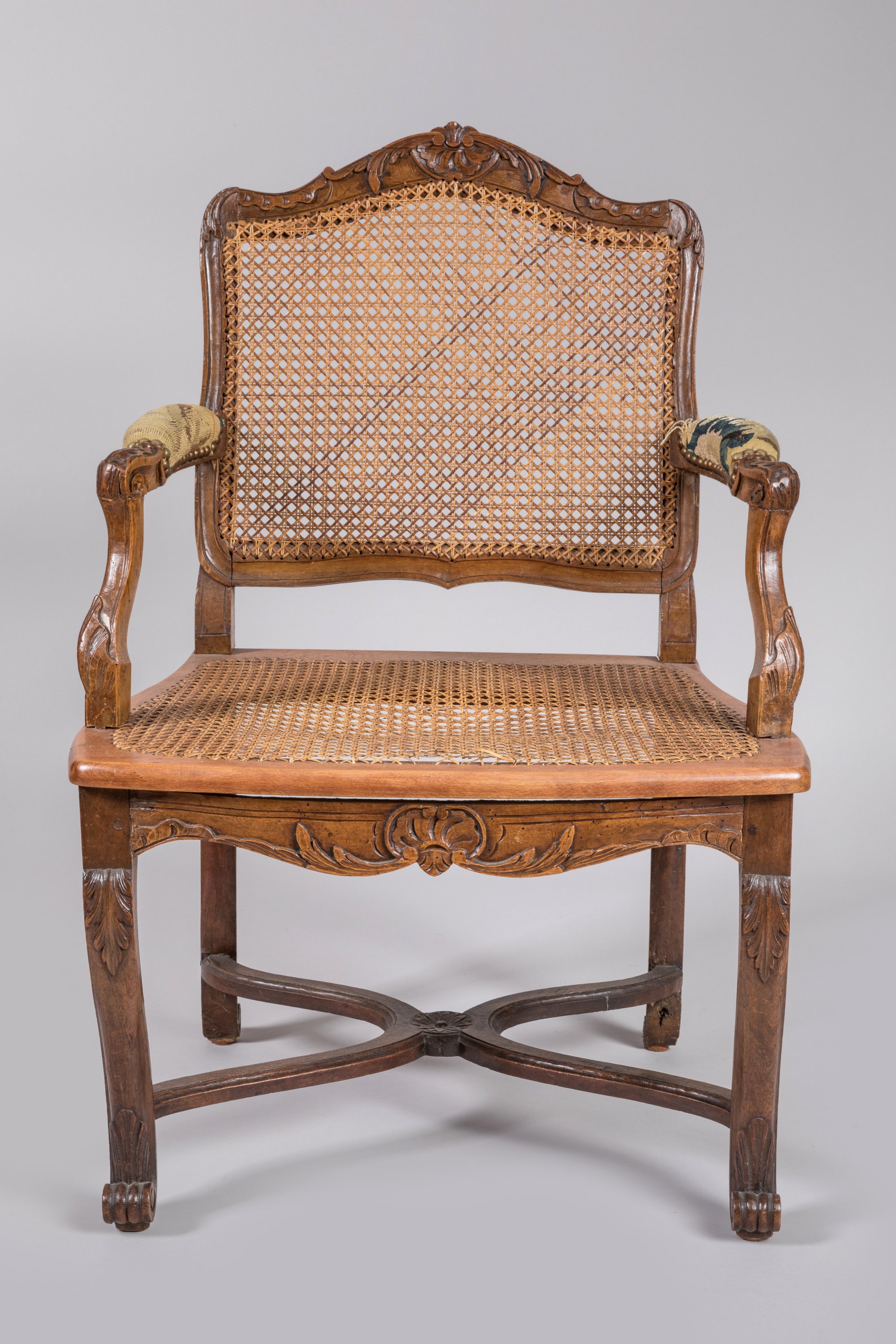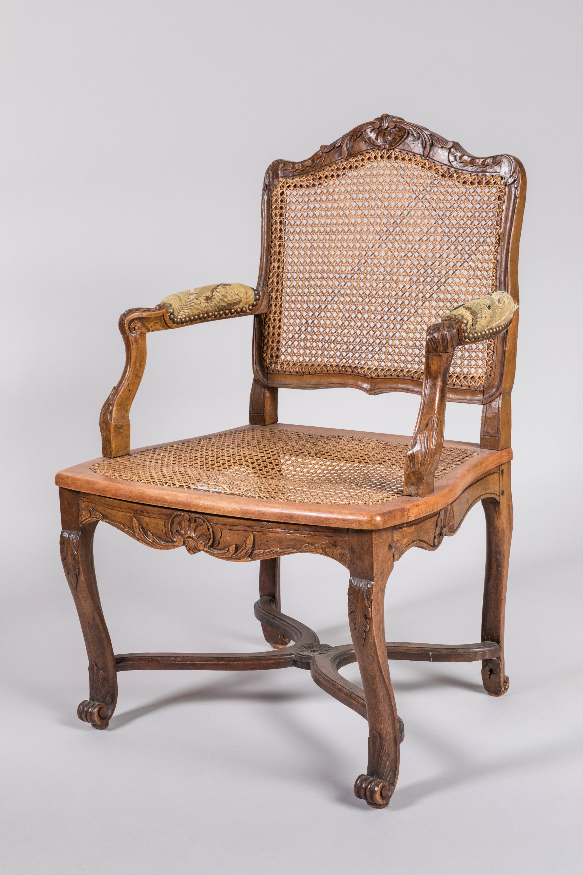 en bois de hêtre mouluré et sculpté, le dossier de forme chantournée à l'amortissement à décor de coquilles et guirlande feuillagée, les accotoirs à manchettes ornés d'un feuillage se terminant en enroulement et faisant le lien avec les consoles en léger coup de fouet. La ceinture mouvementée ornée au centre d'une agrafe et d'un feuillage et sur les petits côtés d'une palmette. Quatre pieds cambrés en console à décor de feuilles d'acanthe et d'eau se terminant en escargot réunis par une entretoise en "X" agrémentée au centre d'une marguerite.