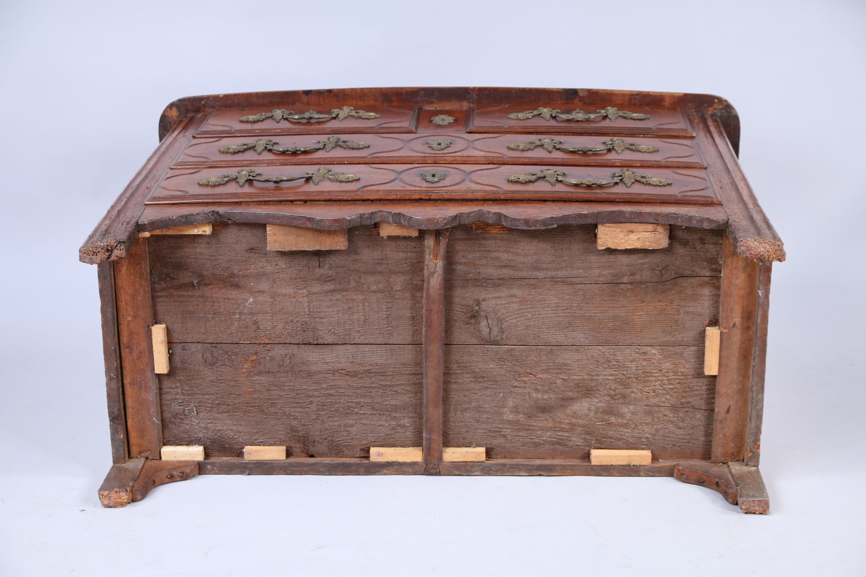 Elle est ornée de mains tombantes et entrées de serrure en bronze doré figurant des personnages aux coiffes à panache. Les pieds droits le plateau laissé nu.