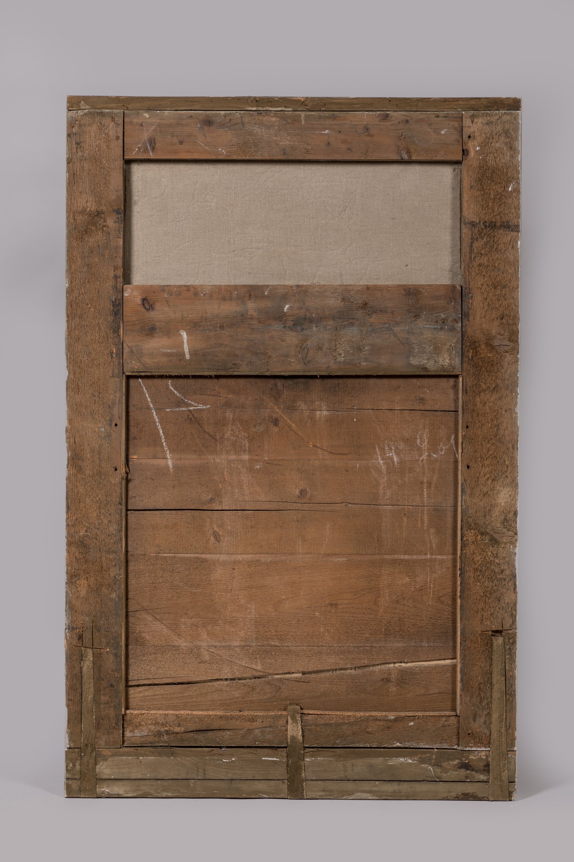 relaqué gris et baguette or à décor rocaille. La partie supérieure présentant un décor de scène de port sur toile dans le gout de Joseph Vernet, la partie inférieure offre un miroir.