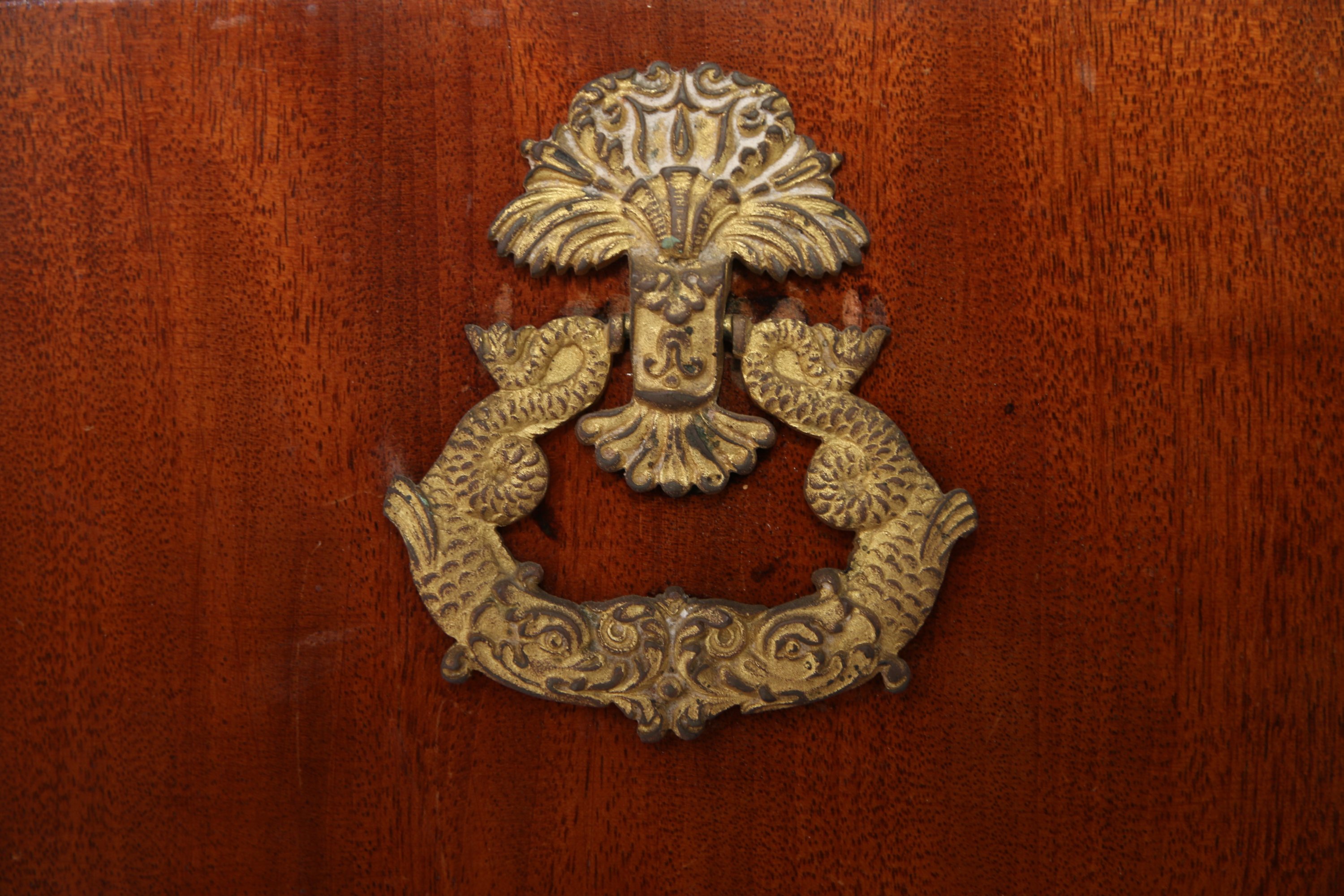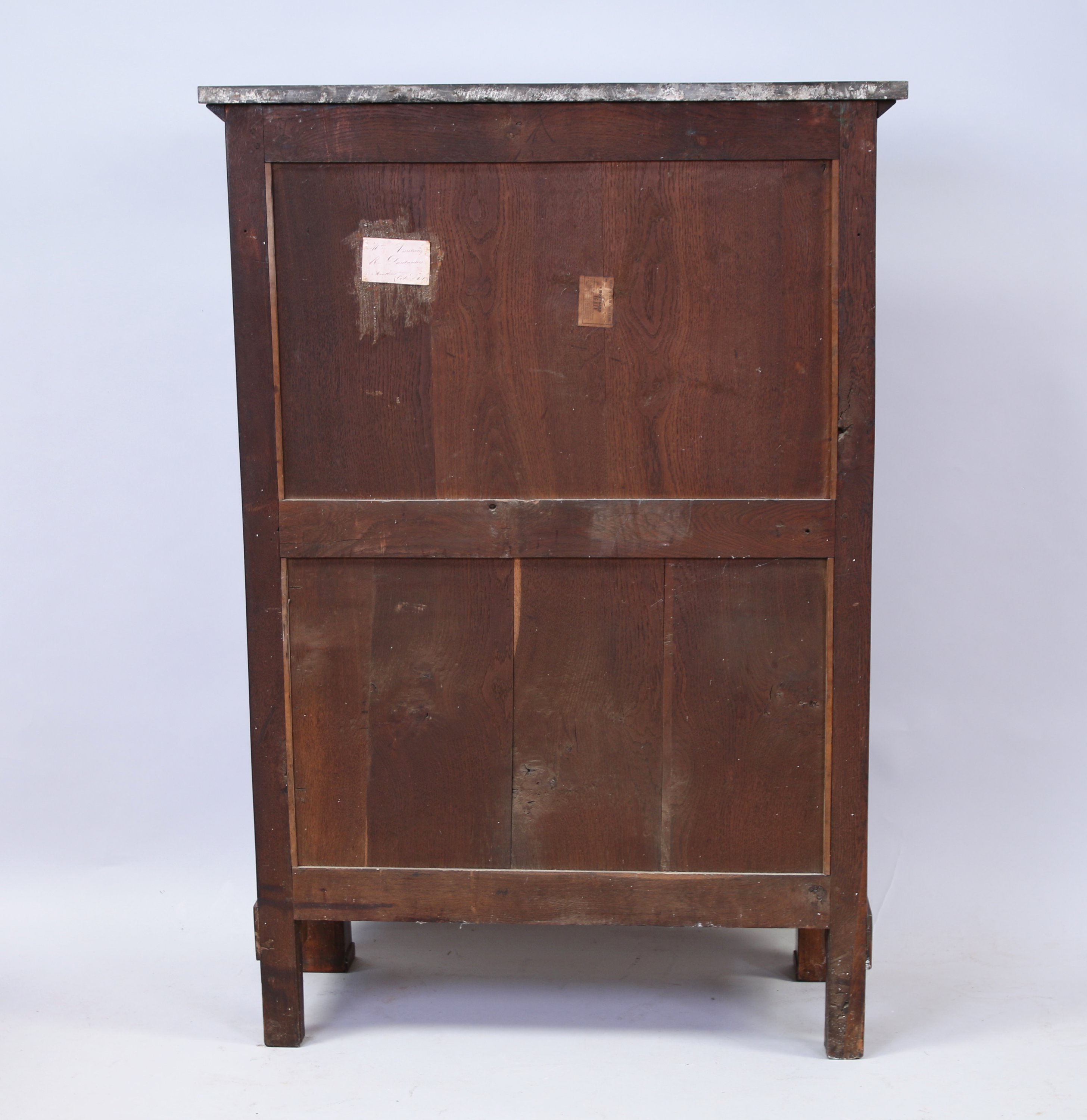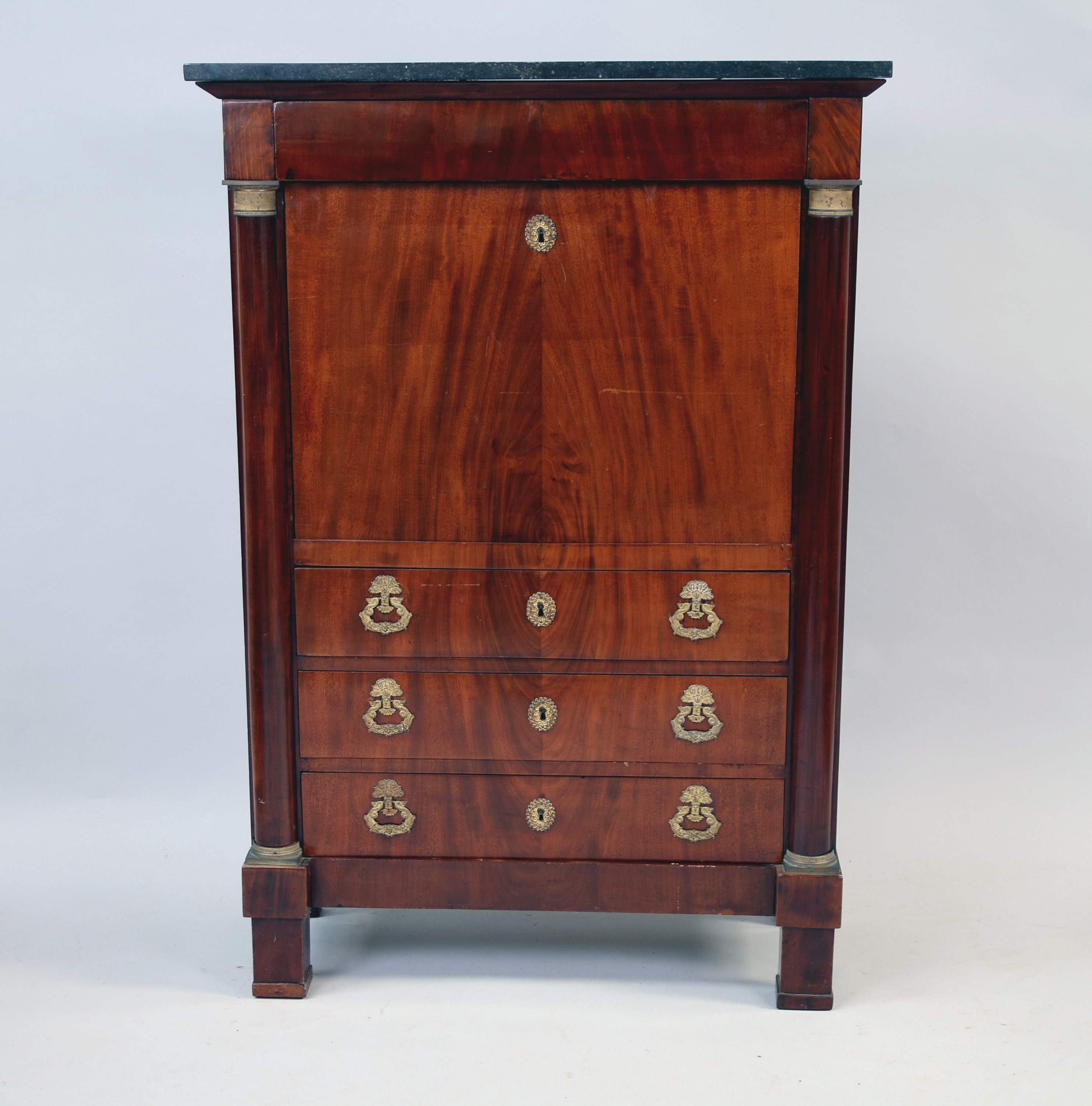 ouvrant en façade par trois tiroirs sur trois rangs et un abattant entouré de deux colonnes. Il découvre une niche surmontant un tiroir central entouré de chaque côté de deux rangées de tiroirs et un cuir jaune gaufré au petit fer. Ornementation en bronze doré tels chapiteaux à décor de feuilles d'eau, bases, poignées et boutons de tirage, entrées de serrure. Recouvert d'un marbre granit belge.
