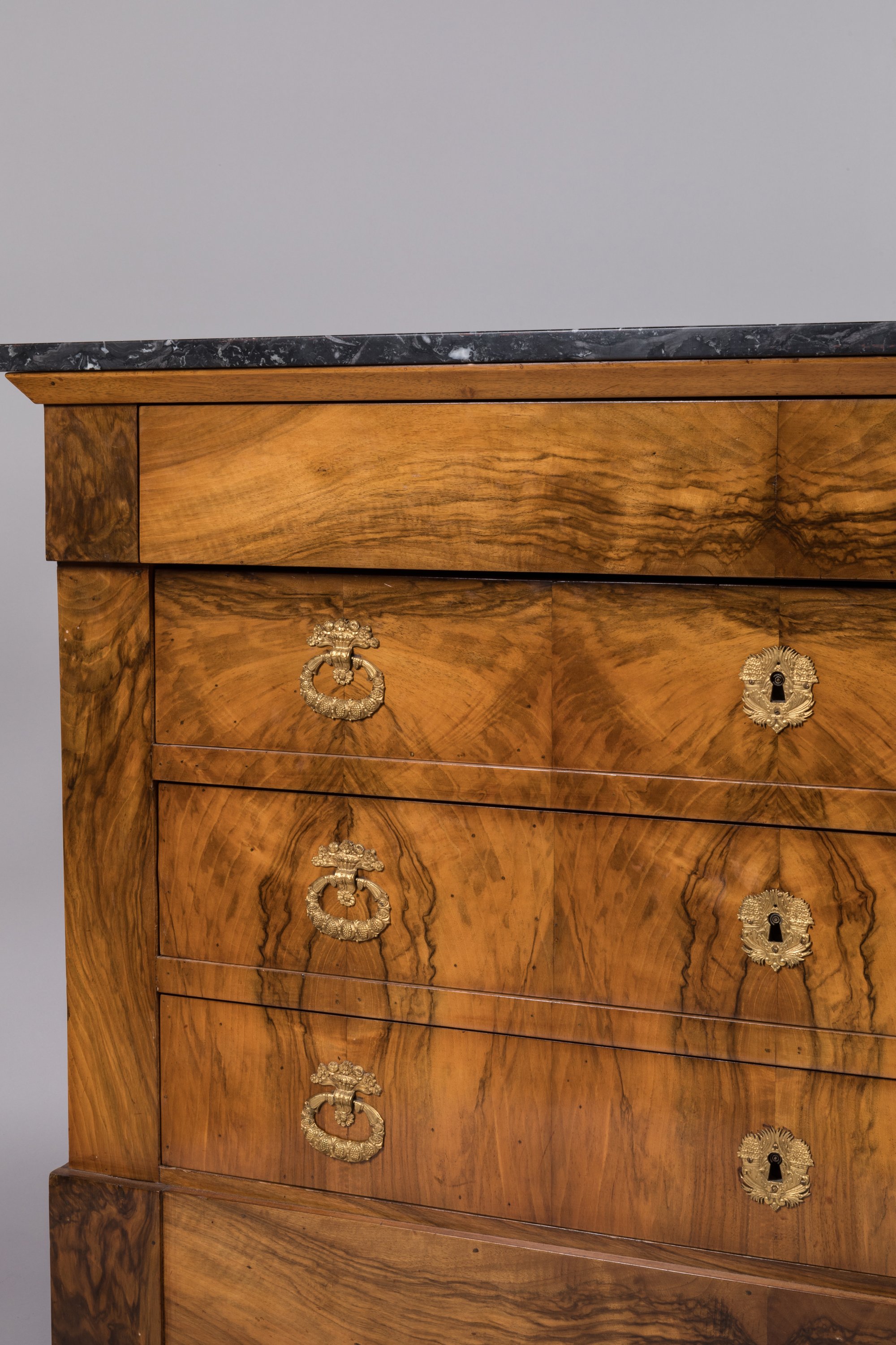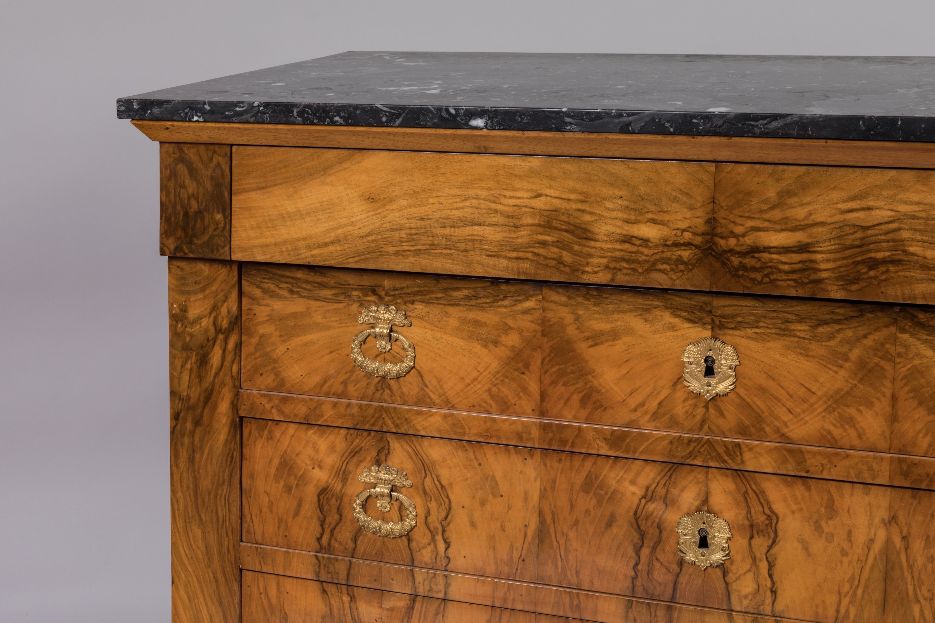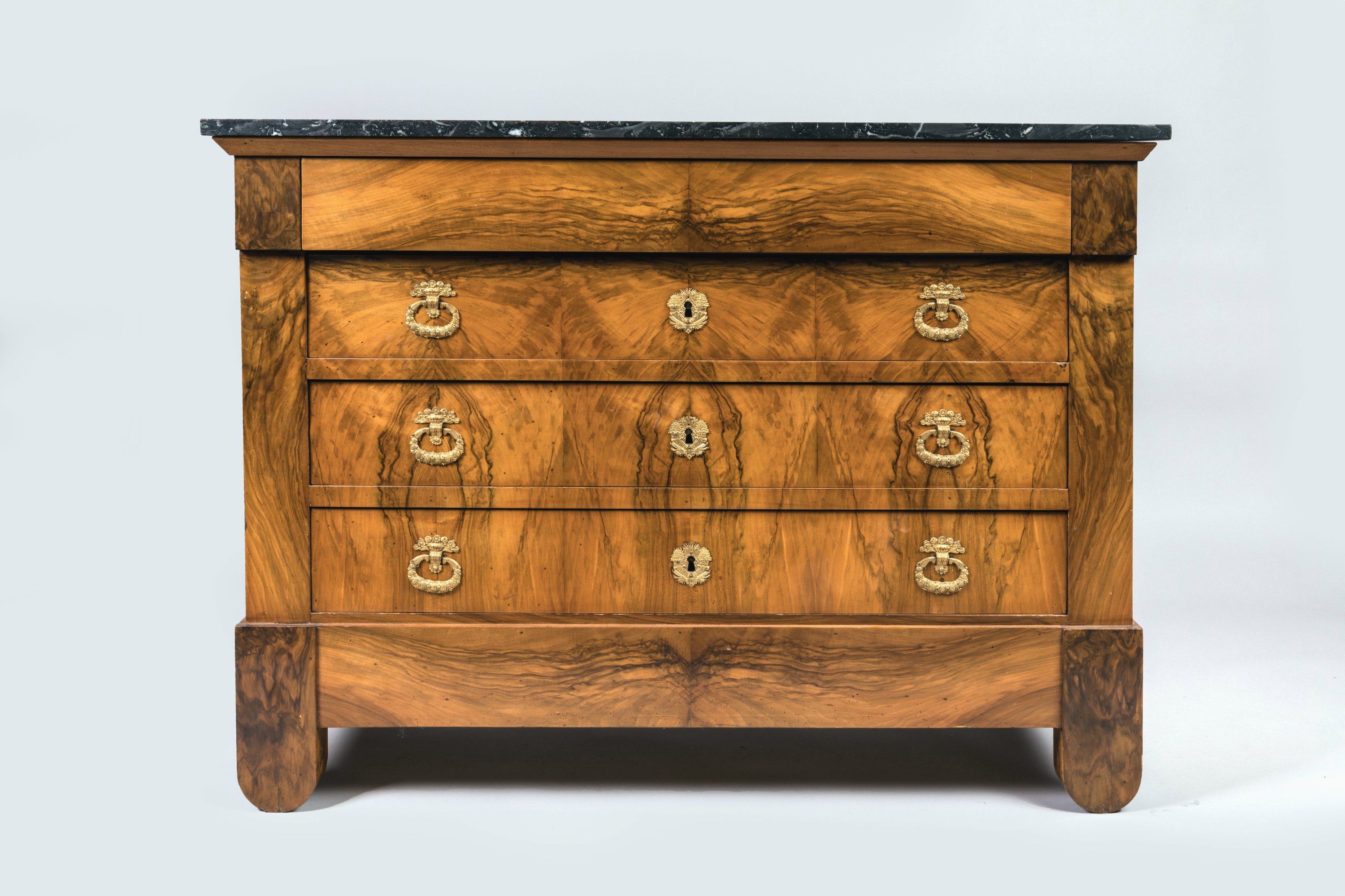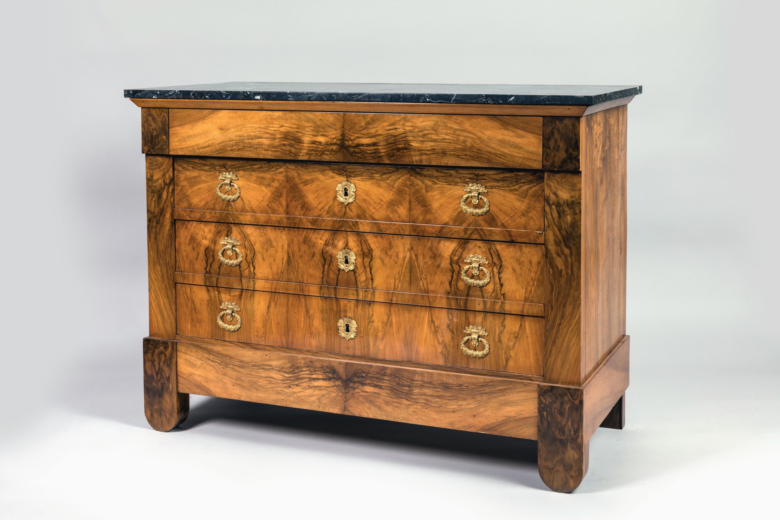 ouvrant à quatre tiroirs dont un dissimulé en ceinture. Ornementation de bronze doré telles: entrées de serrure et poignées de tirages.