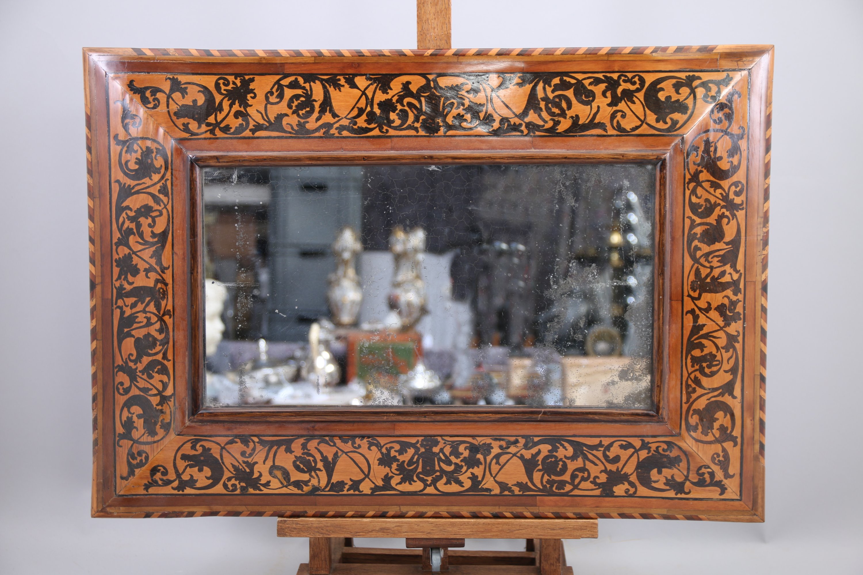 de forme rectangulaire en marqueterie de bois indigène et placage d'ébène offrant un décor de rinceaux et angelots. Les bordures présentant un filet de bois bi-colore en alternance. Glace au mercure.