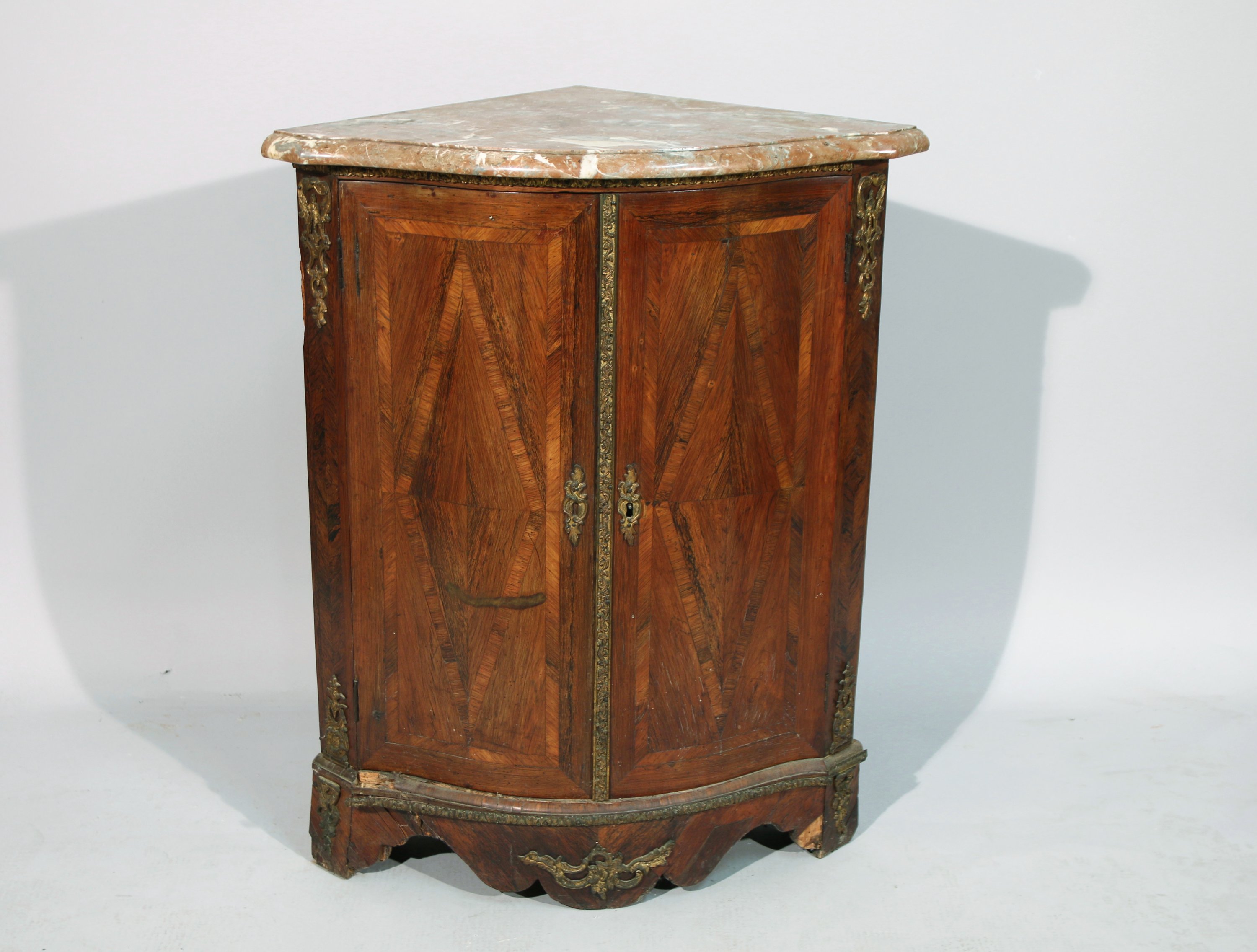 en bois naturel, elle ouvre par deux portes, elle repose sur deux pieds joint par un cul de lampe mouvementé. Chaque porte est ornée dun losange marqueté. Ornementation de bronzes dorés tel: entrée de serrure, chutes dangles, cul de lampe.