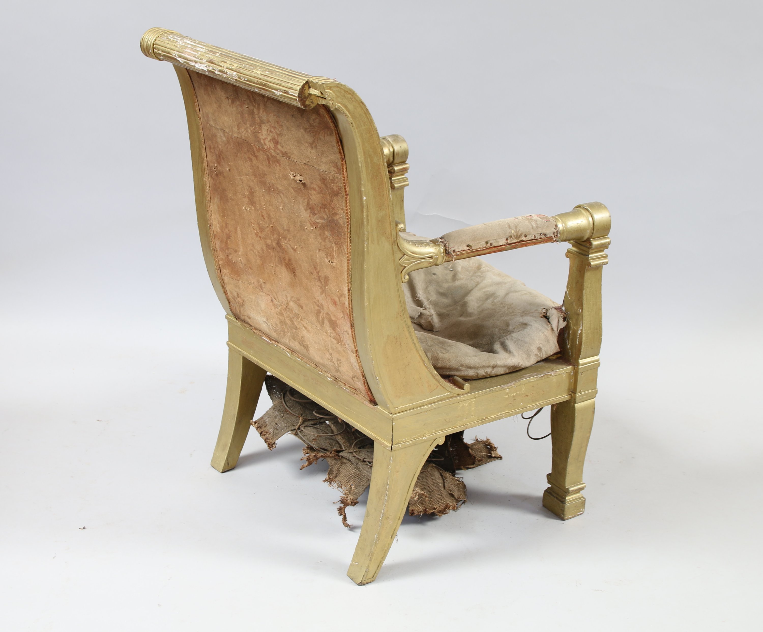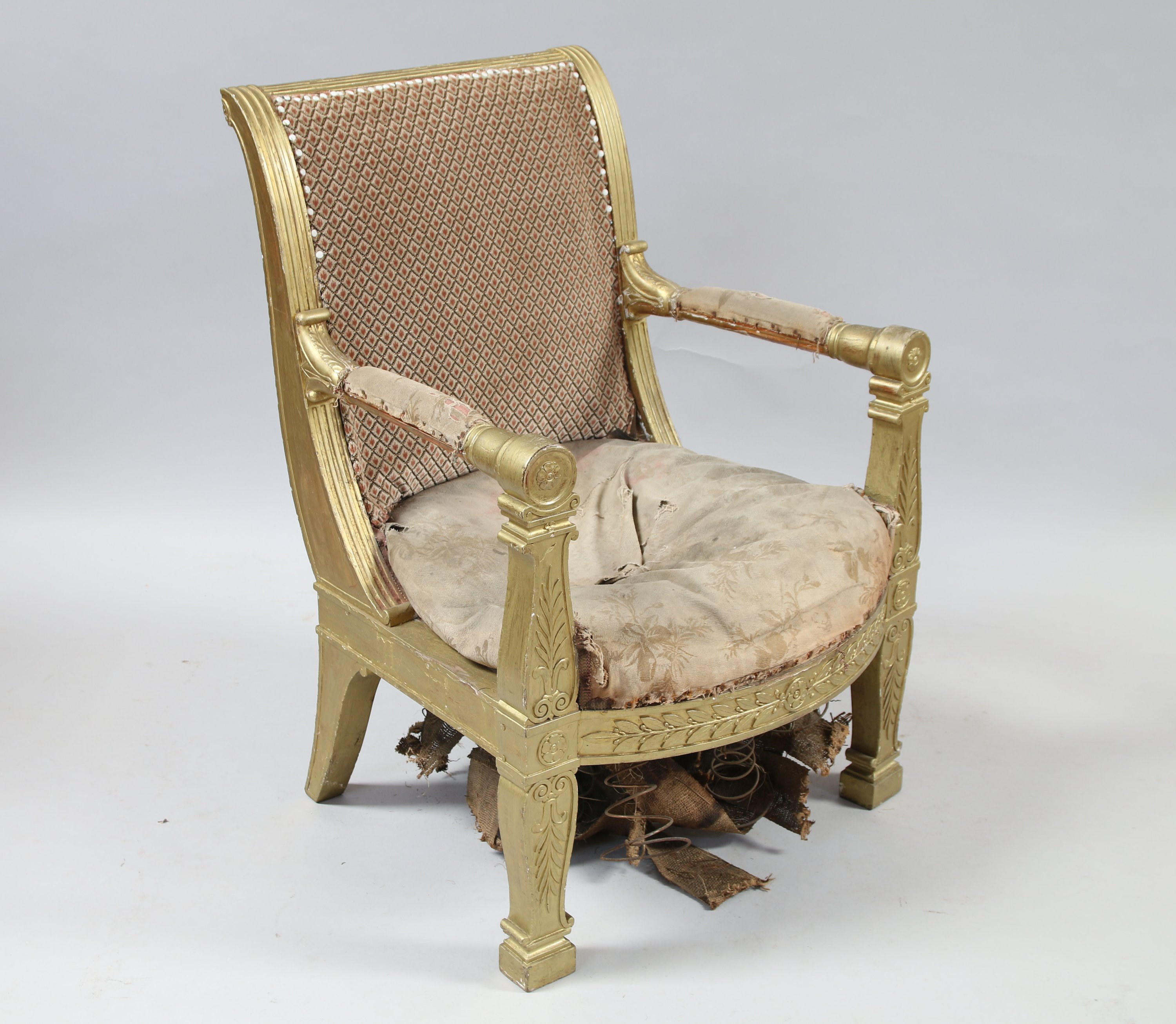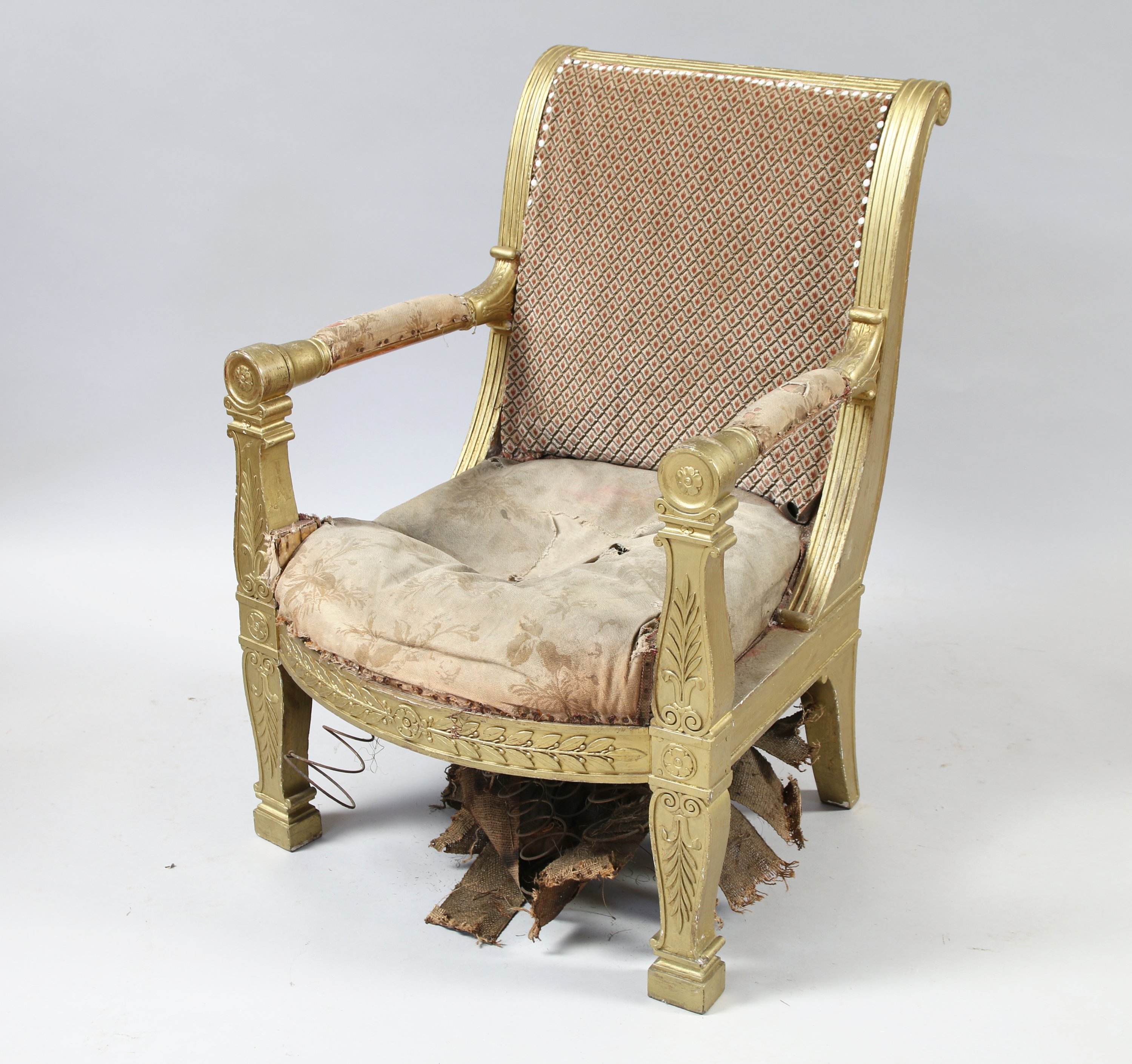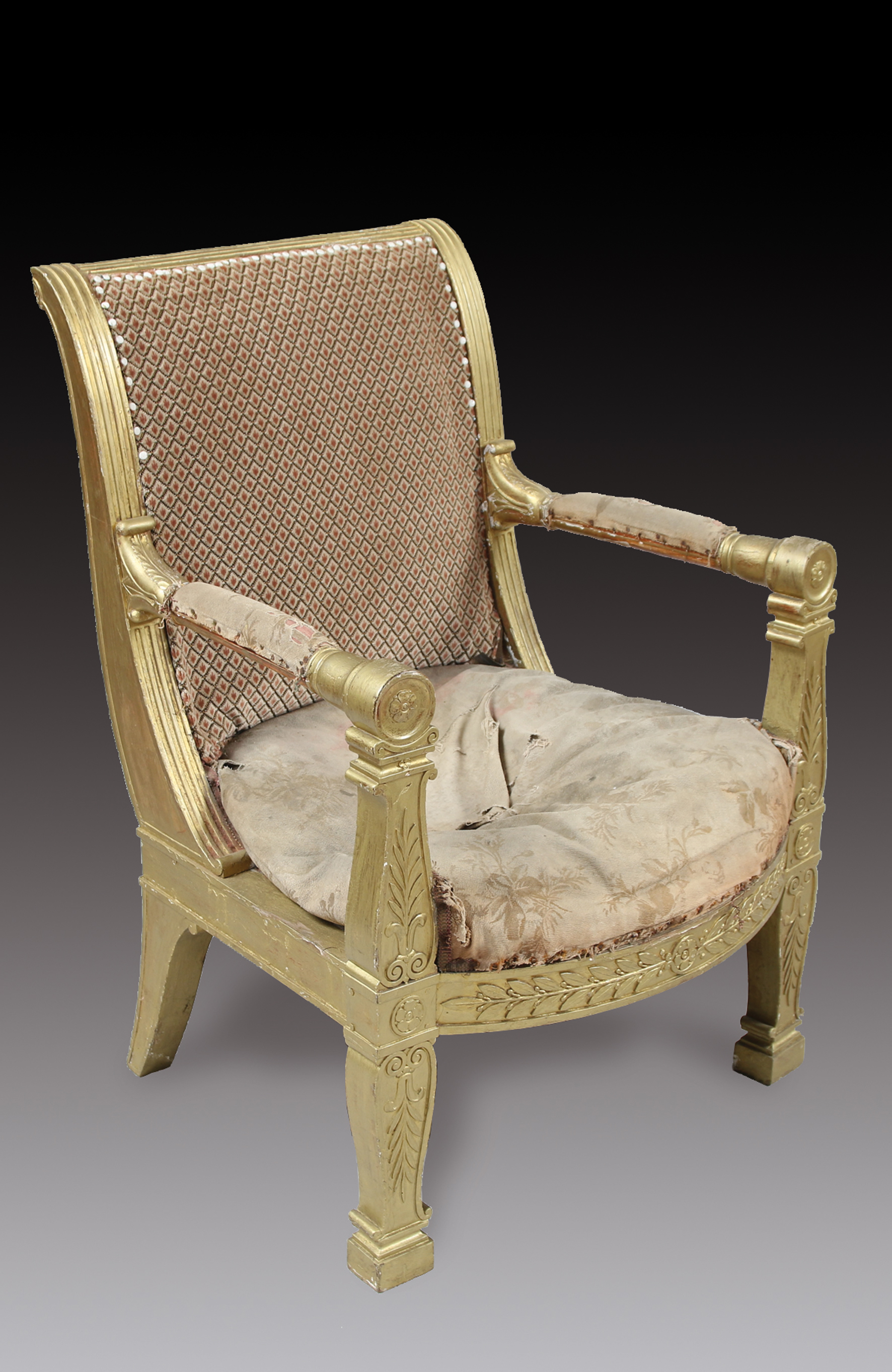 en hêtre sculpté et doré, à dossier cannelé renversé. Les accotoirs droits, en sceptre égyptien avec un décor de fleurs de lotus. Il repose sur deux pieds antérieurs en pilastres, ornés de palmes et feuilles d'acanthe et deux pieds postérieurs sabres. La ceinture est ornée d'une couronne de lauriers déployée.