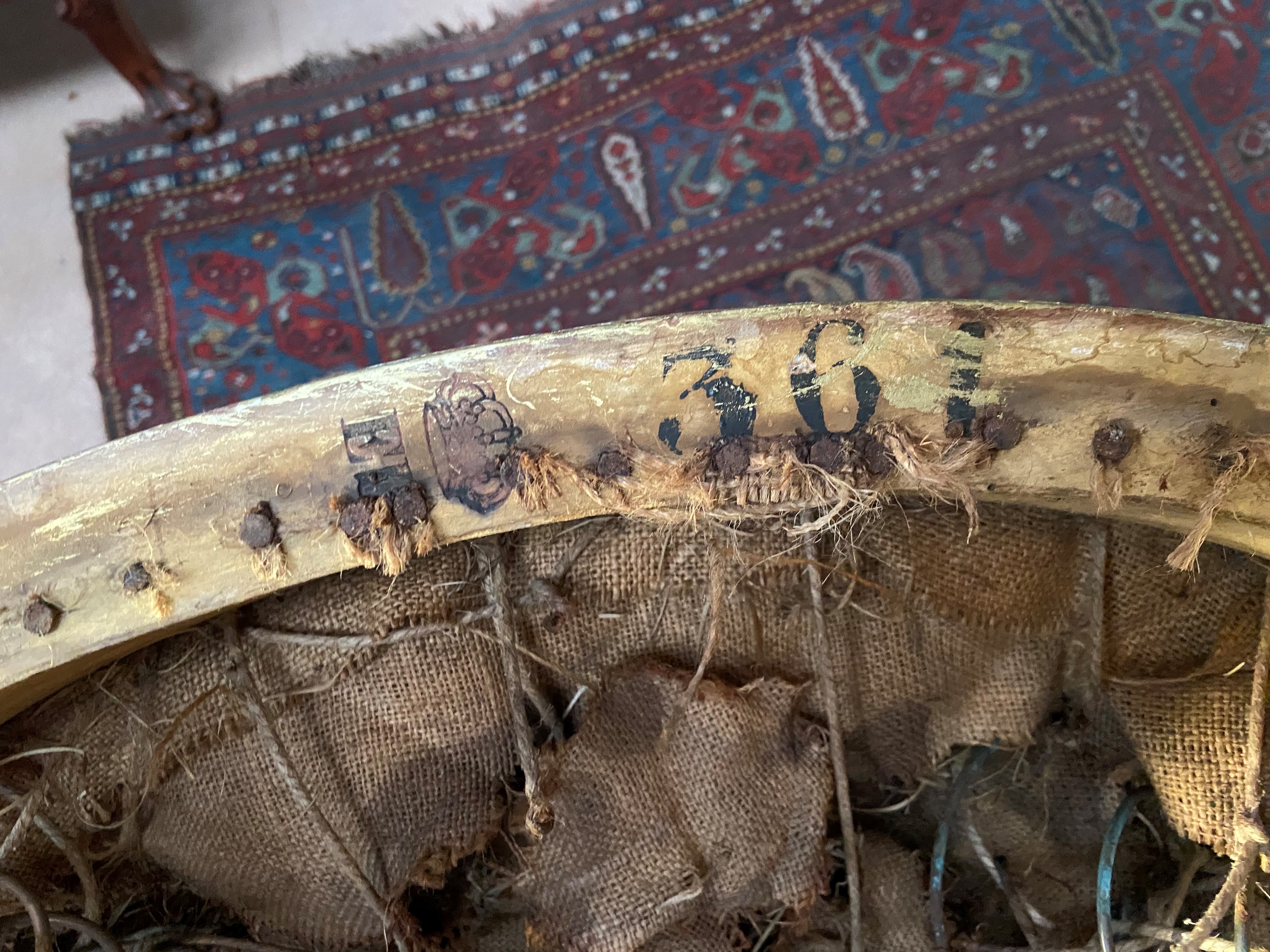 Ces marques historiques correspondent parfaitement à l'estampille qui y apposée sur ce siège d'apparat: "JACOB D. RUE MESLEE". Elle correspond à celle utilisée lors de l'association de Georges Jacob et de son fils François-Honoré-Georges Jacob-Desmalter entre 1803-1813. Les conditions kafkaïennes d'ouverture partielles des Archives nationales depuis leur réouverture le 7 décembre dernier ne nous ont malheureusement pas permis d'identifier le numéro dans les inventaires. Gageons qu'à la ligne 361 figure un ou plusieurs fauteuils comme celui-ci. En 2015 déjà nous retrouvions ainsi un tel fauteuil d'apparat dans la galerie du palais de l'Élysée pour l'usage de Napoléon.