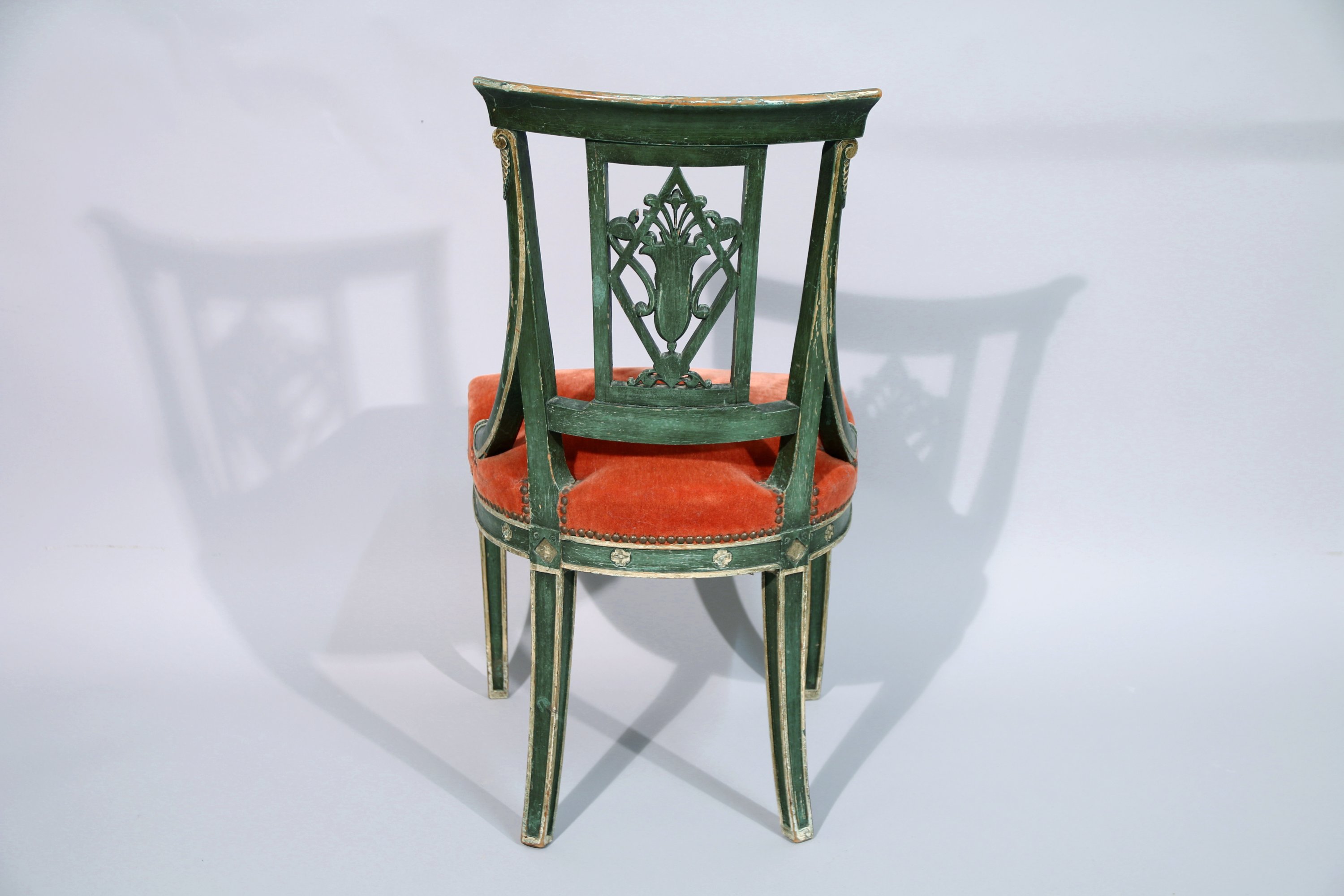 SIX CHAISES en bois sculpté mouluré et teinté vert. Décor...