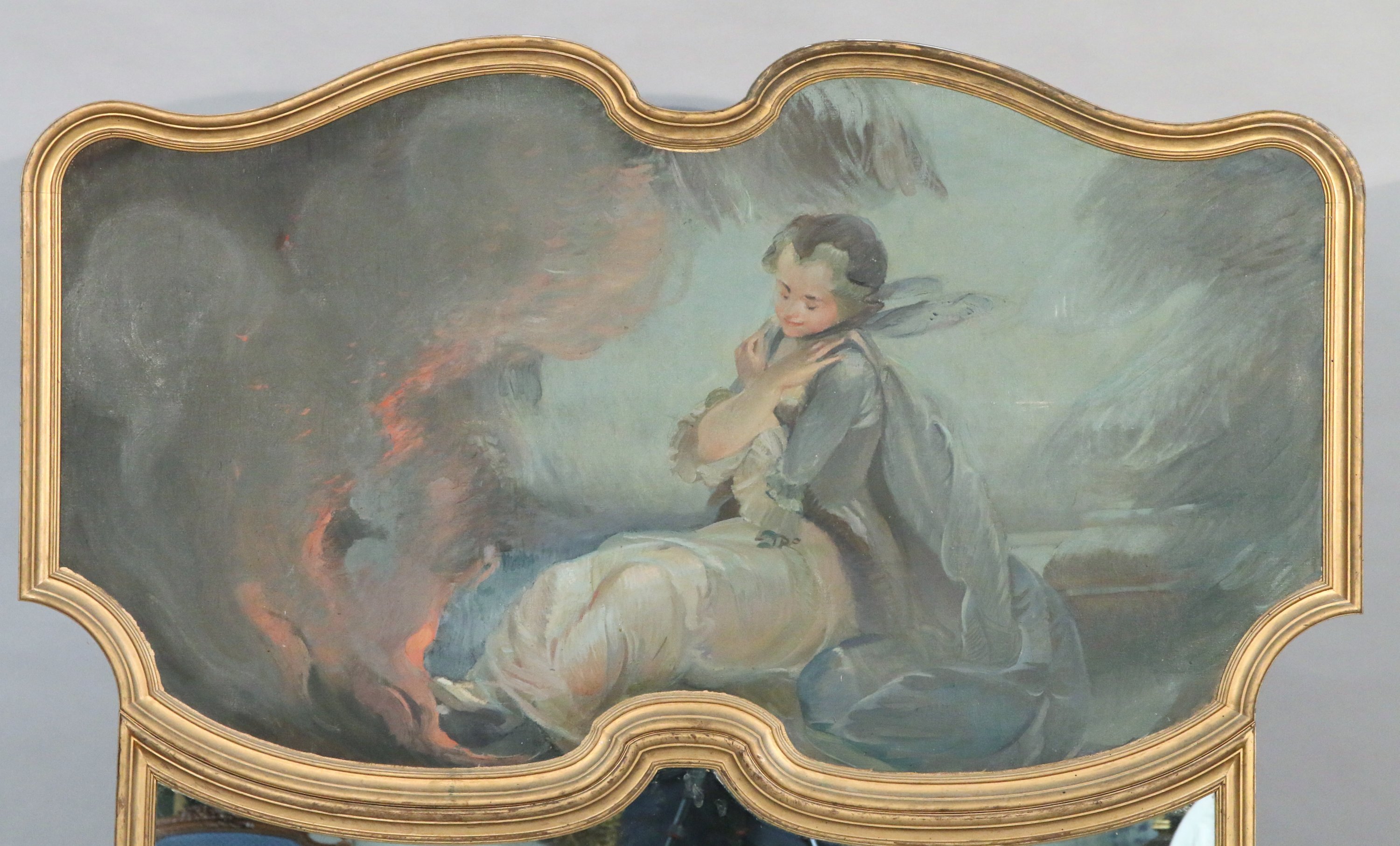 en bois doré et mouluré de forme chantourné. En deux partie, la partie supérieure agrémentée d'une toile peinte représentant une femme se réchauffant près d'un feu.