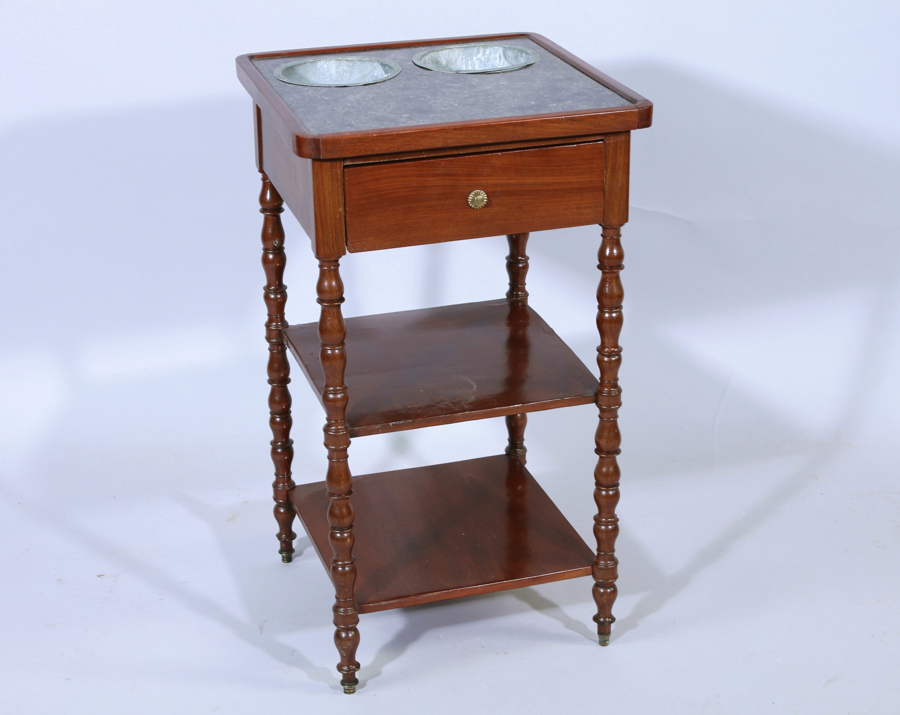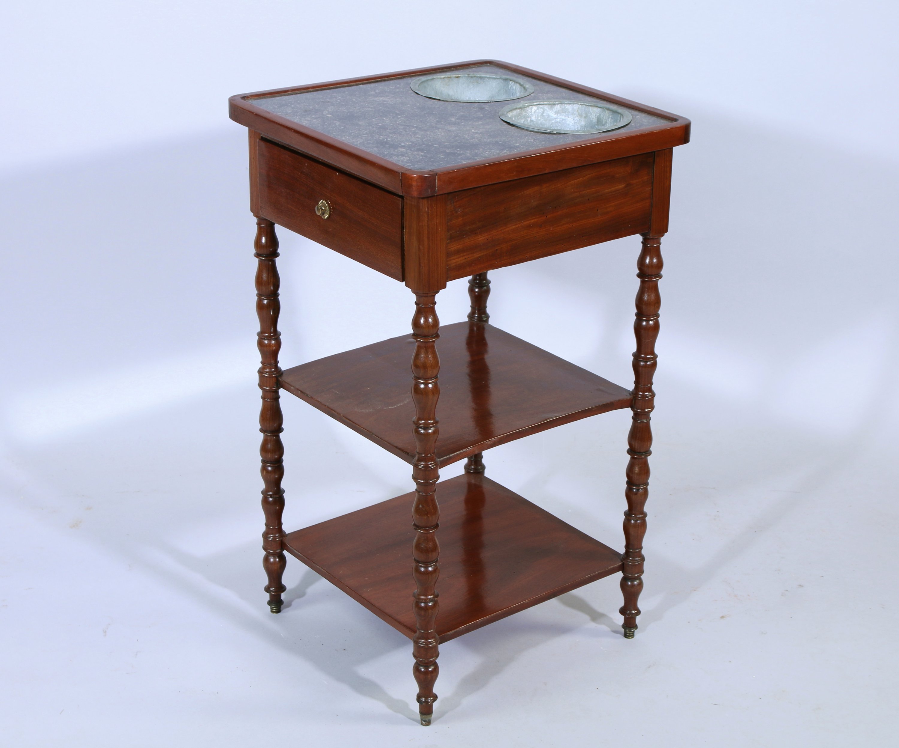 et placage d'acajou ouvrant en façade par un tiroir présentant un bouton de tirage en laiton. Elle repose sur quatre pieds tournés de forme balustre réunis par deux tablettes. Dessus de marbre gris Sainte Anne présentant deux niches pour déposer les seaux en métal.