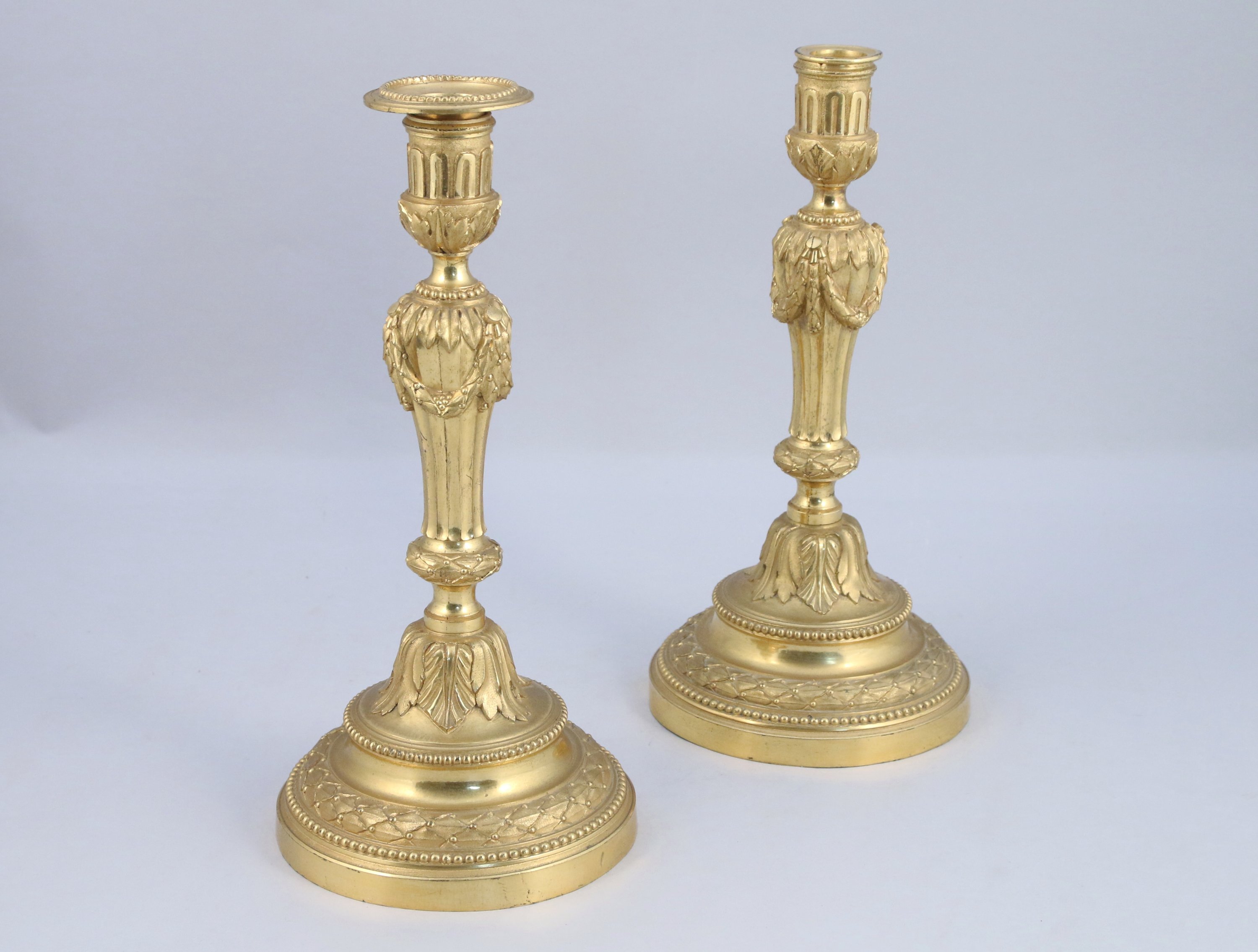 en bronze doré, le pied circulaire à décor de rang de perles et feuilles de lauriers, la terrasse séparée par une doucine, la cloche présentant des feuilles d'acanthe. Le fût cannelé est orné de guirlande de laurier. La tête offre un décor de feuilles d'acanthe et le binet de triglyphes.