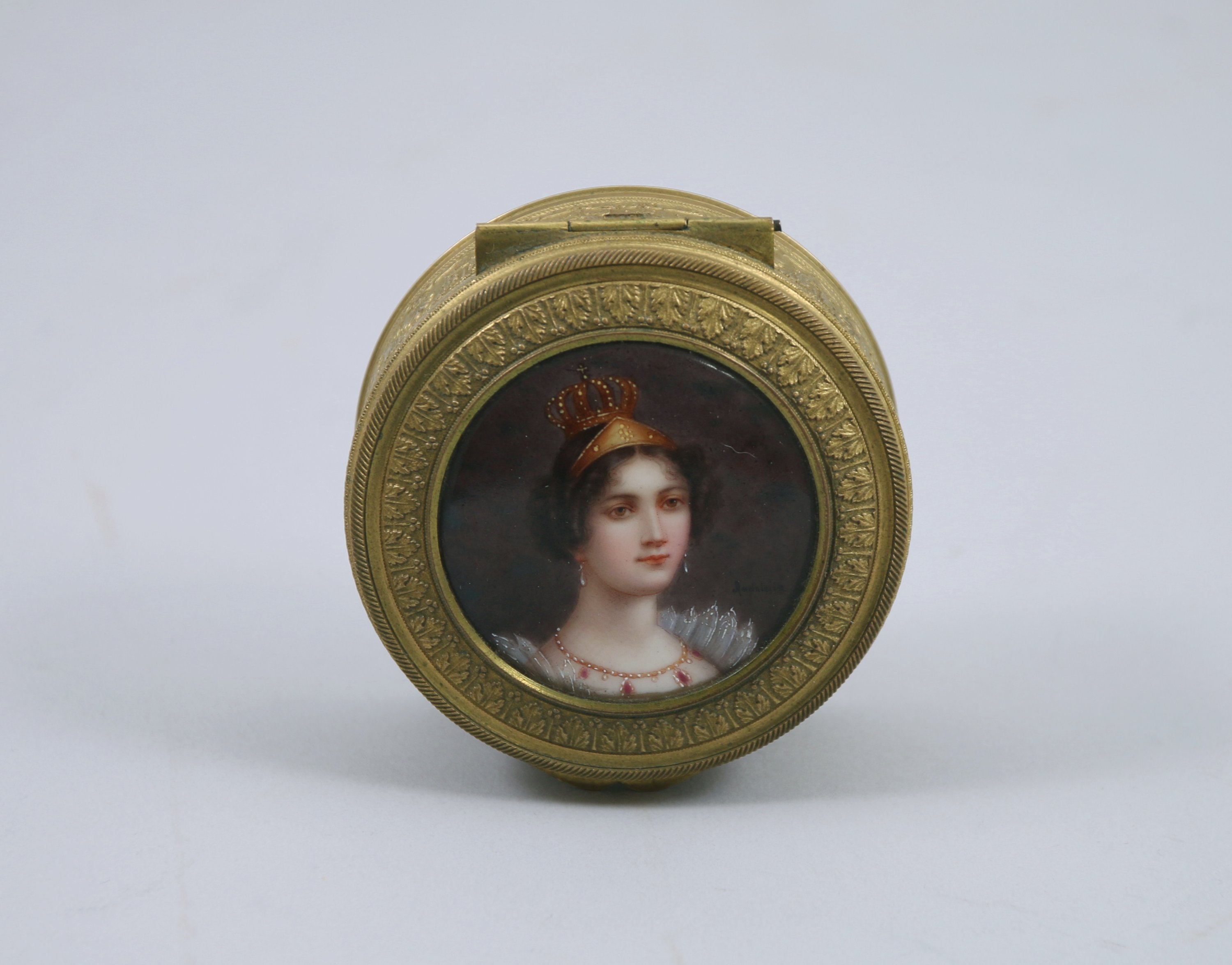 en bronze doré, décoré au centre d'une miniature au portrait présumé de Marie-Amélie de Bourbon. Le médaillon entourée d'une frise de feuilles d'acanthe, la panse ornée de palmettes et rinceaux.