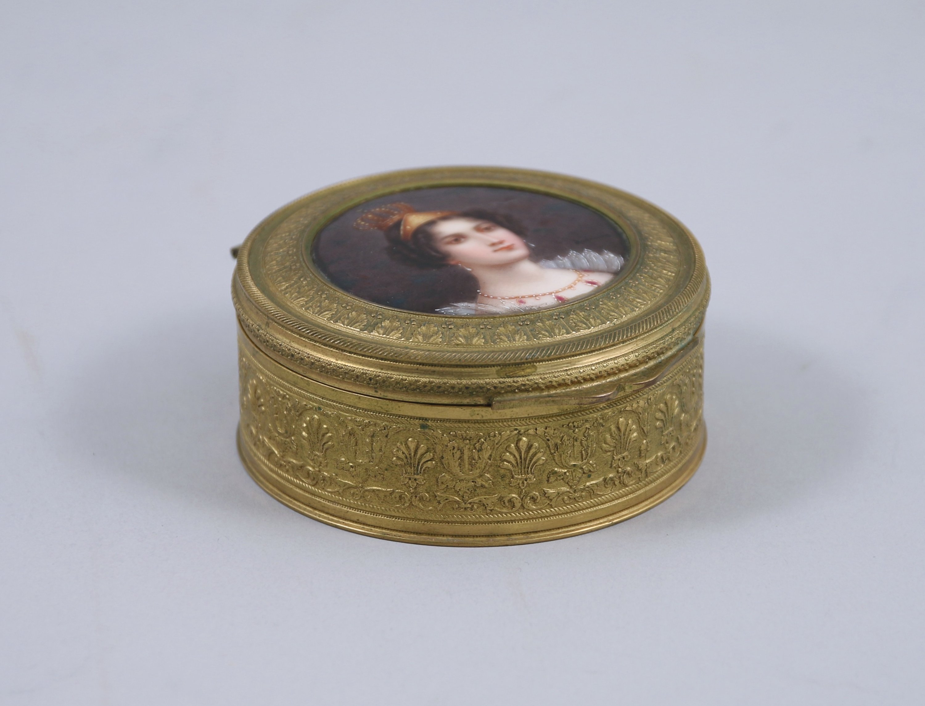 BOÎTE circulaire en bronze doré, décoré au centre d'une miniature...