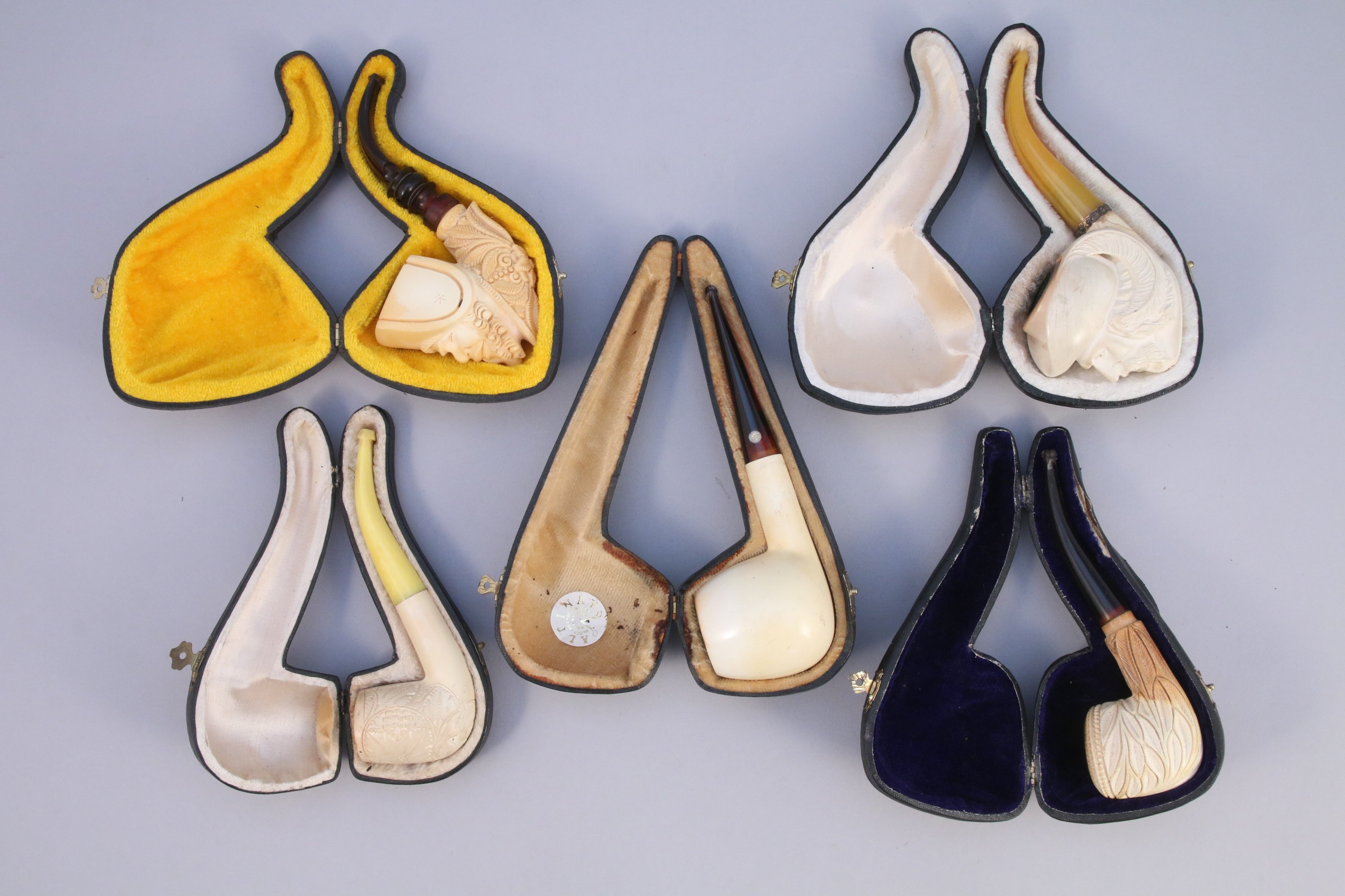 Cinq PIPES en écume de mer. Deux anthropomorphes, deux à...