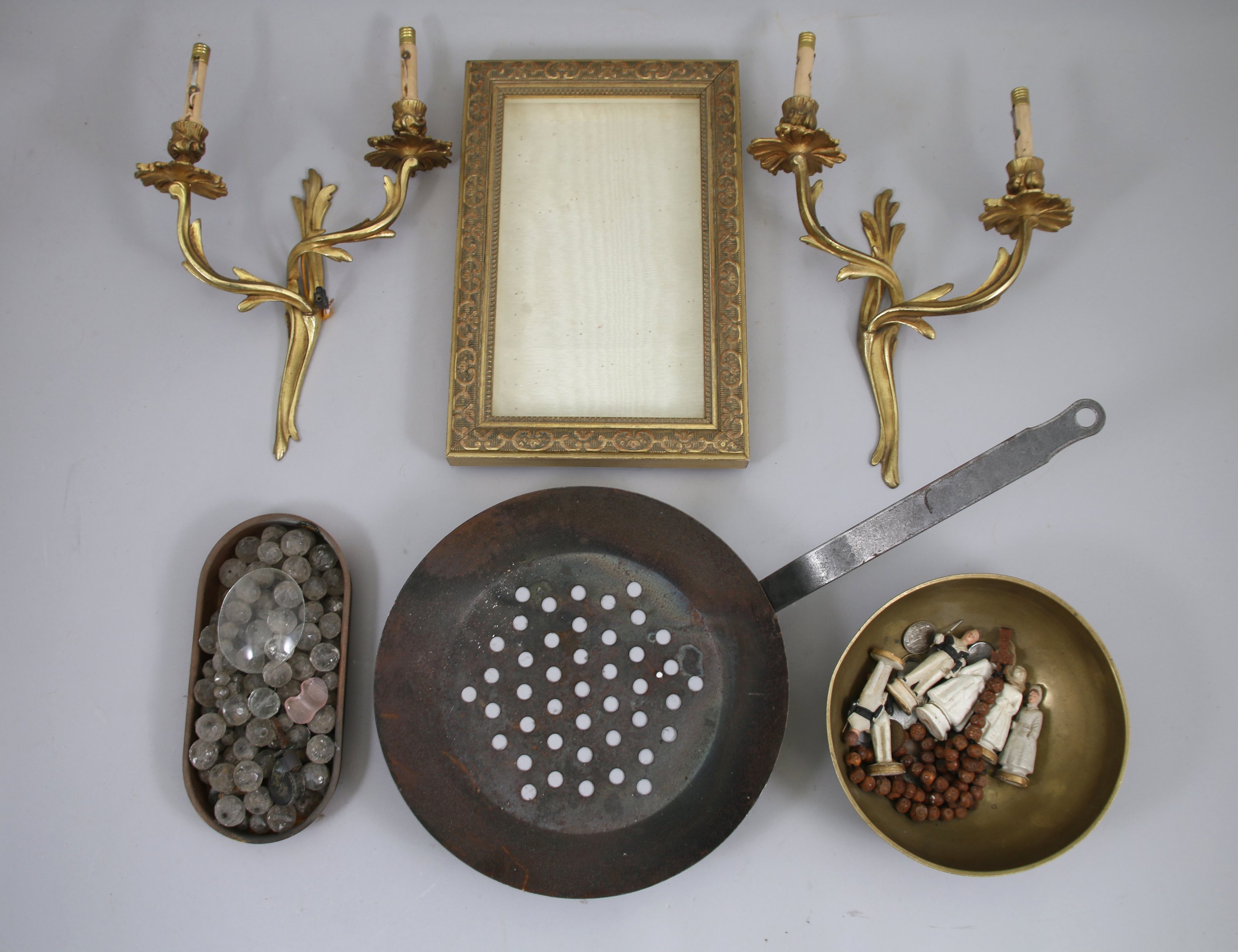- Lot de diverses pièces de monnaies ; éperon en fer forgé ; poêle à châtaigne.