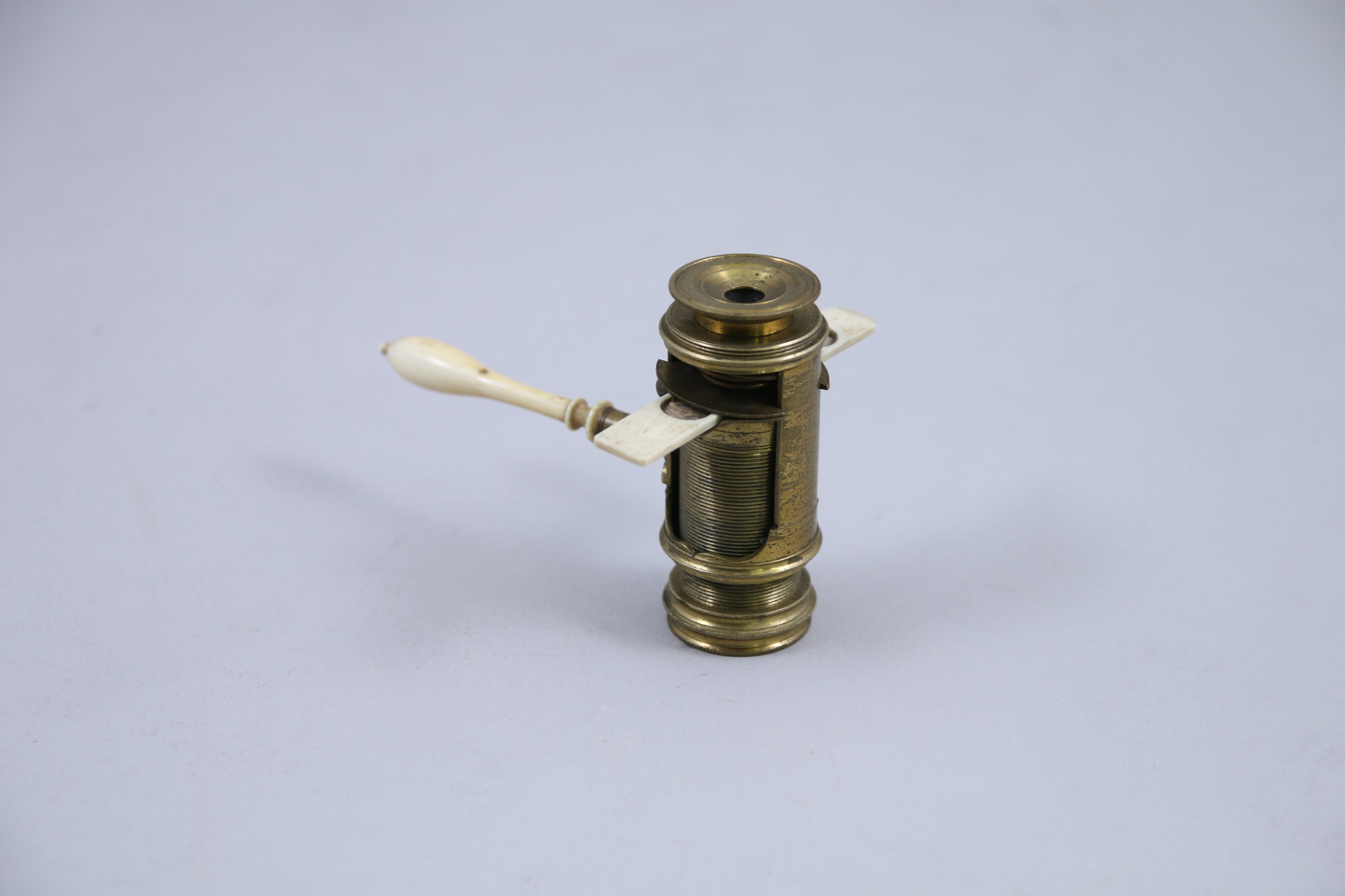 En laiton doré, la poignée en ivoire. L'objet présente un système à vis pour faire la mise au point de l'optique.