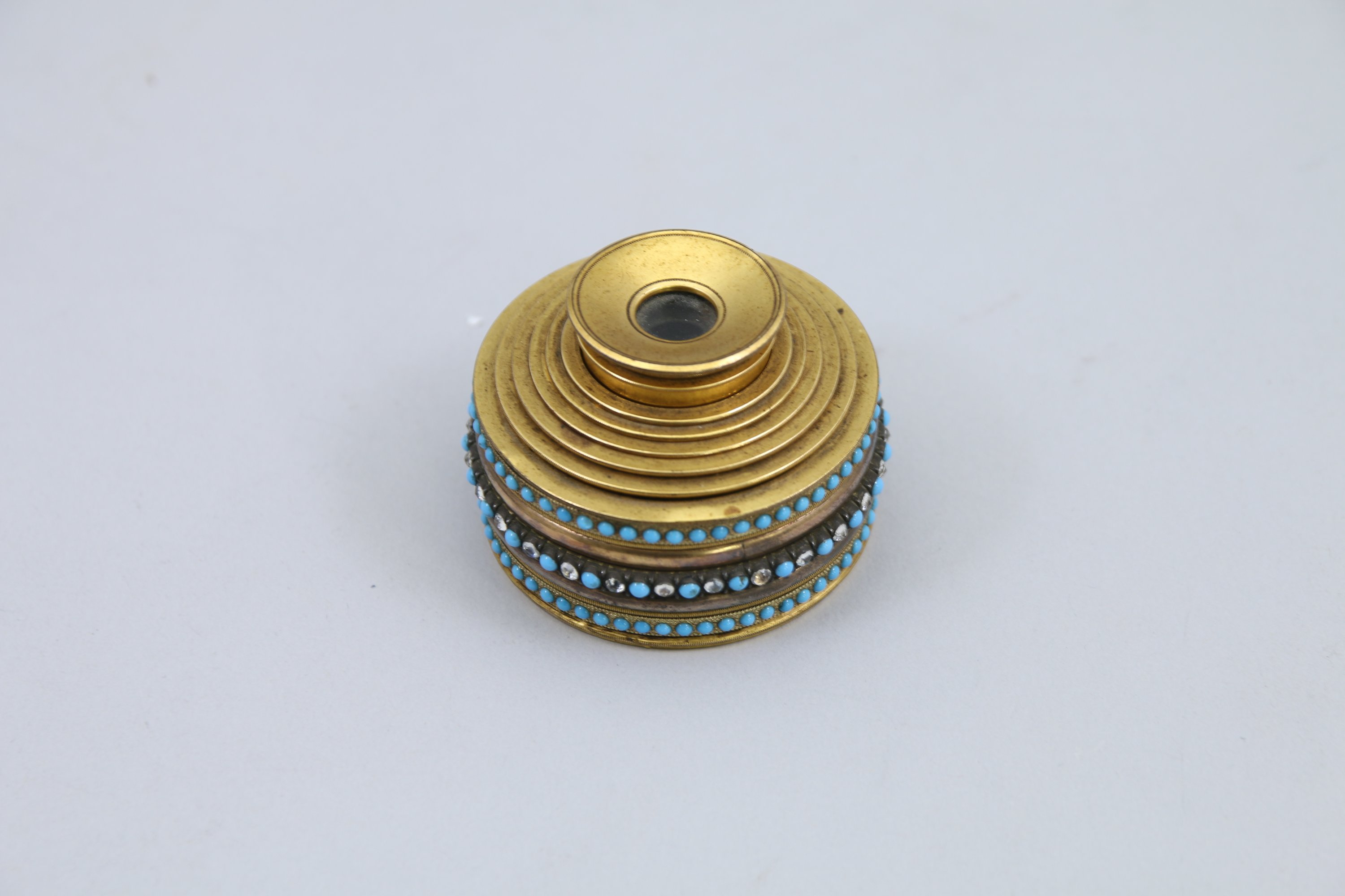 en laiton doré, l'anneau le plus important orné de deux frises de cabochons de turquoise et d'une frise centrale les alternant avec des pierres blanches.