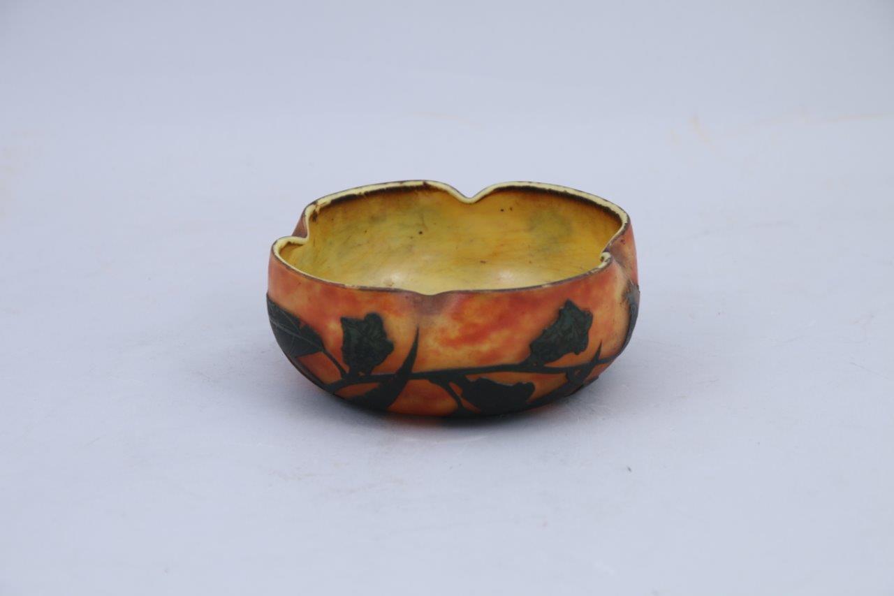 Coupe basse polylobée, à fond orangé avec applications de feuillages lancéolés.