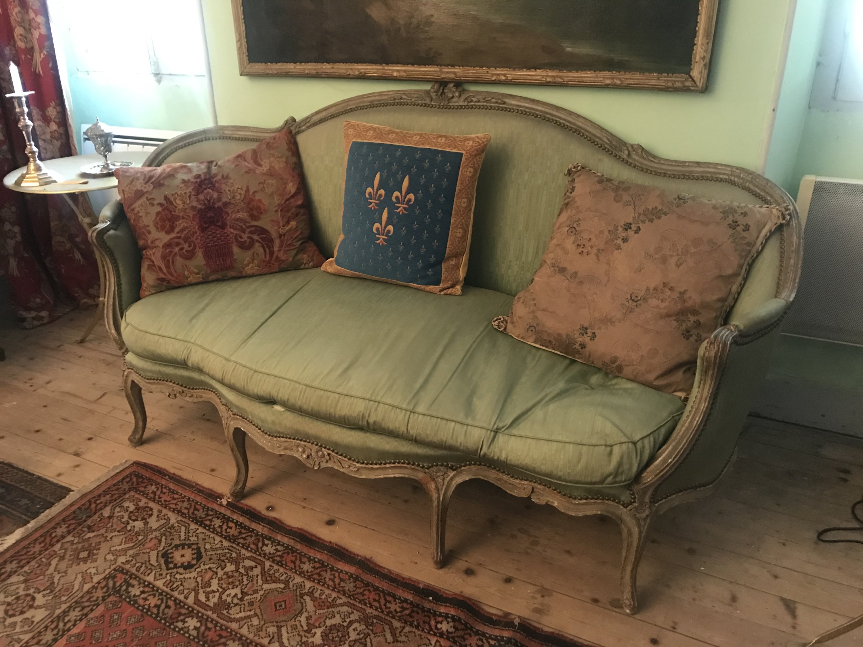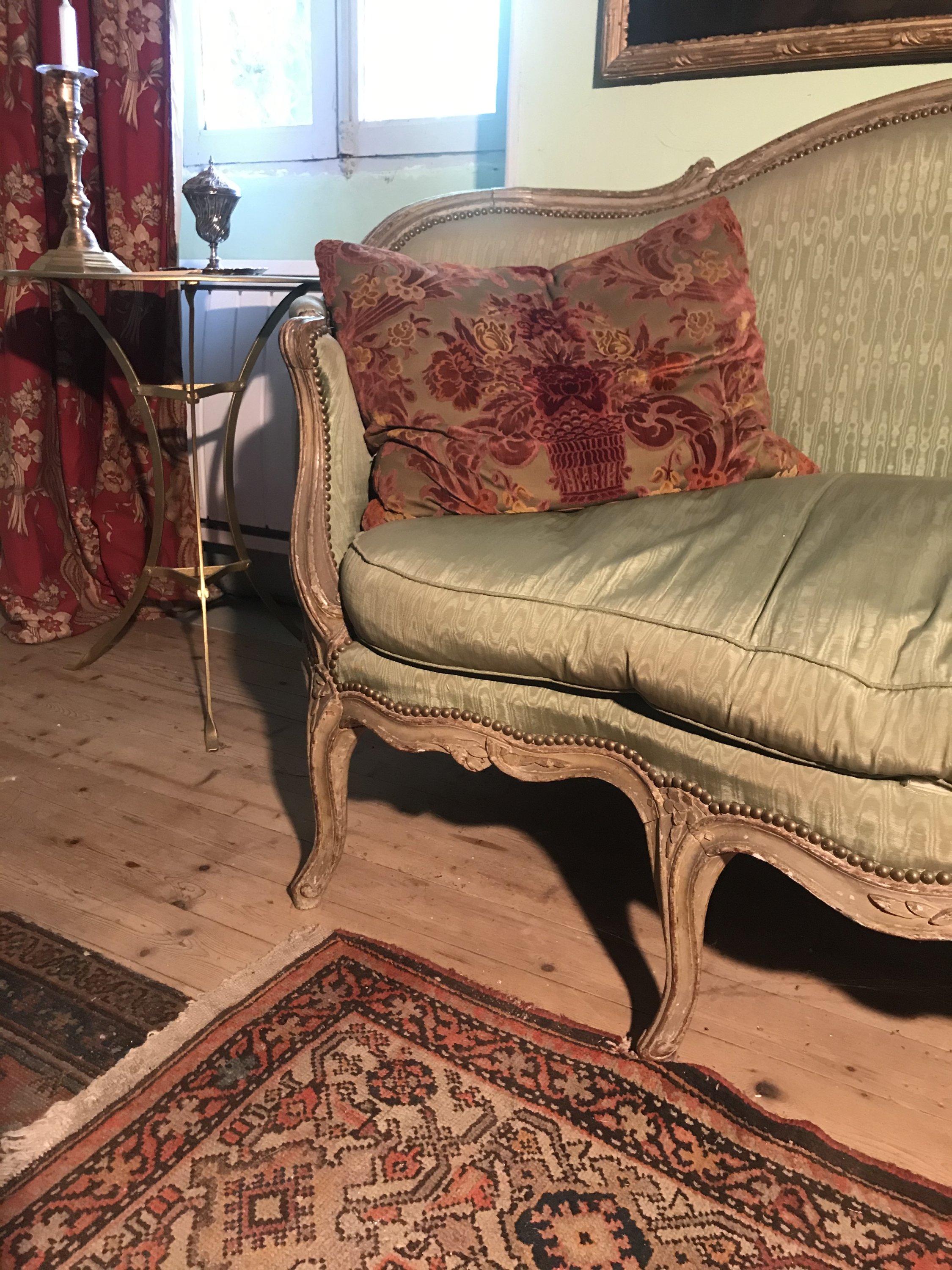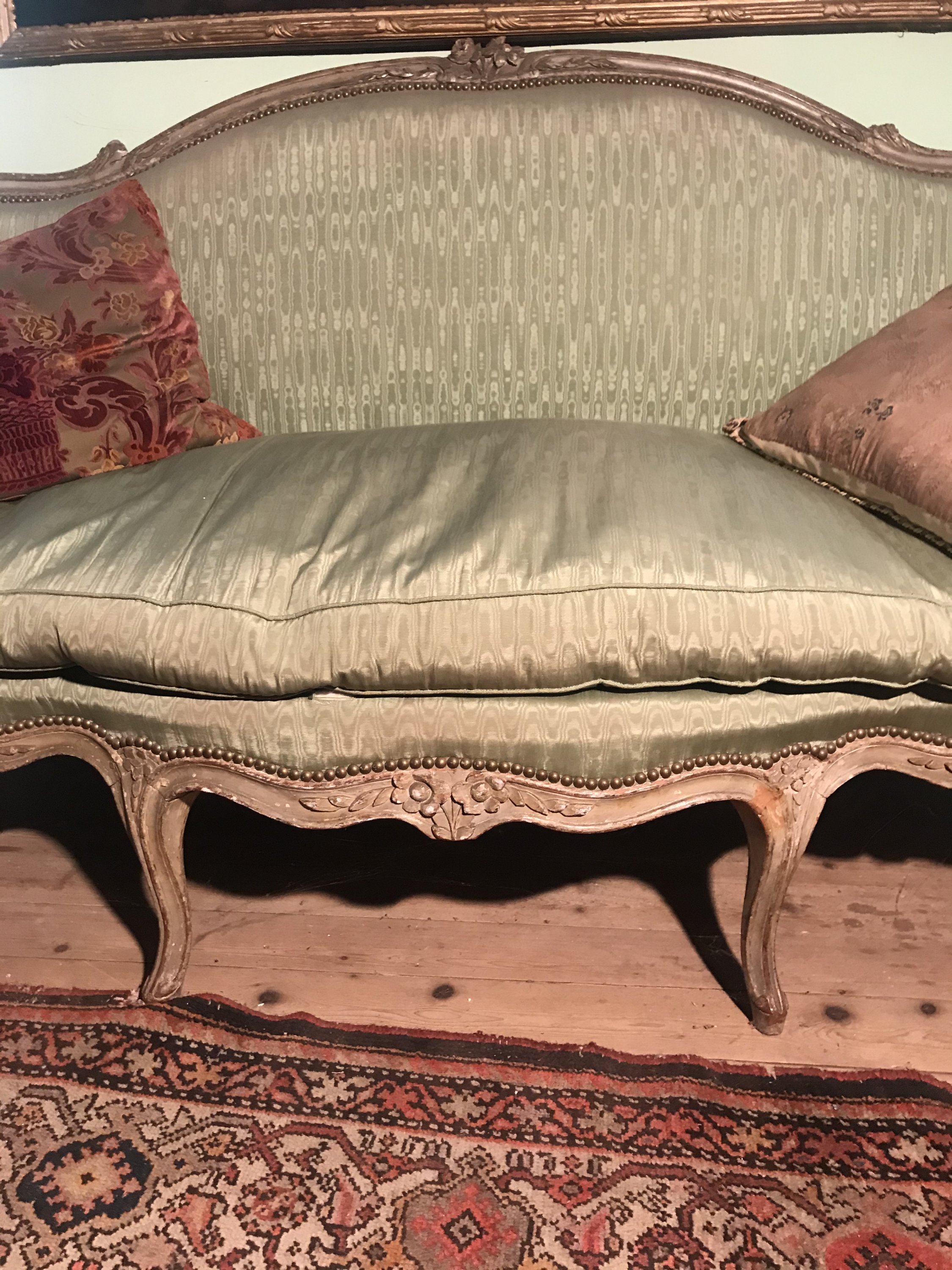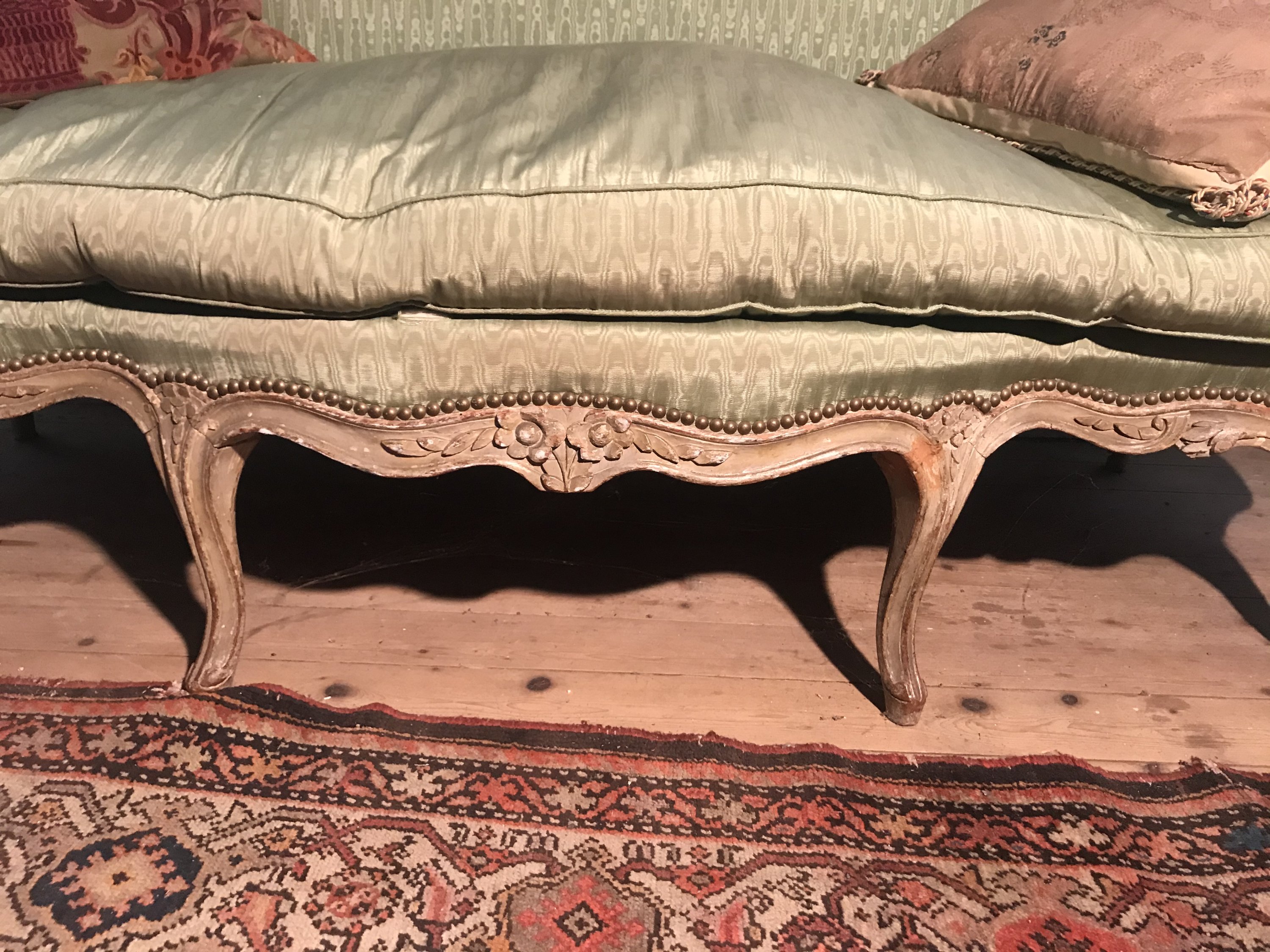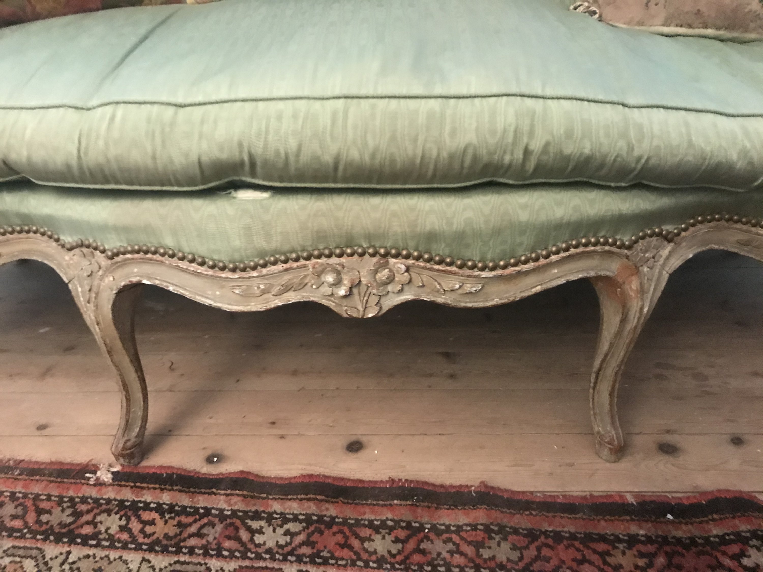 CANAPÉ CORBEILLE en bois naturel anciennement laqué, l’amortissement orné de...