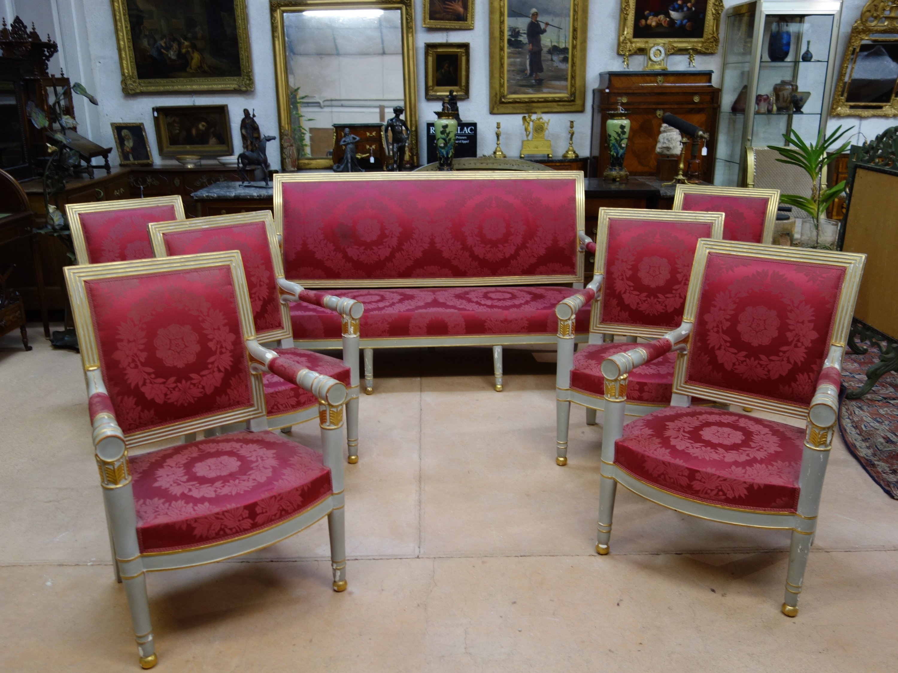 comprenant six FAUTEUILS et un CANAPÉ en bois laqué gris et ornementation dorée de palmettes, bagues, boules. Dossier carré droit. Piètement postérieur sabre, antérieur droit fuselé. Consoles daccotoir à décor de feuilles de lotus.
