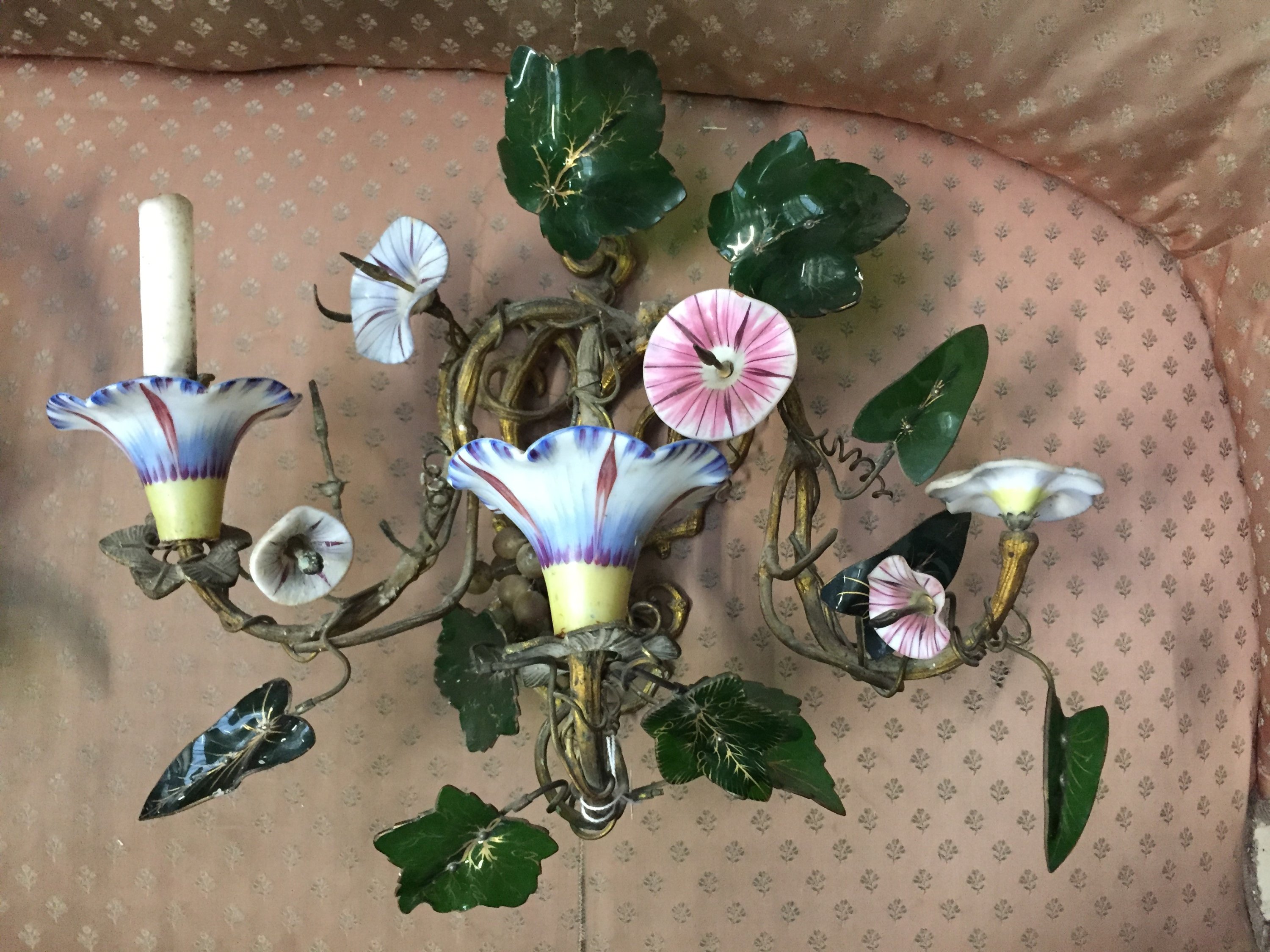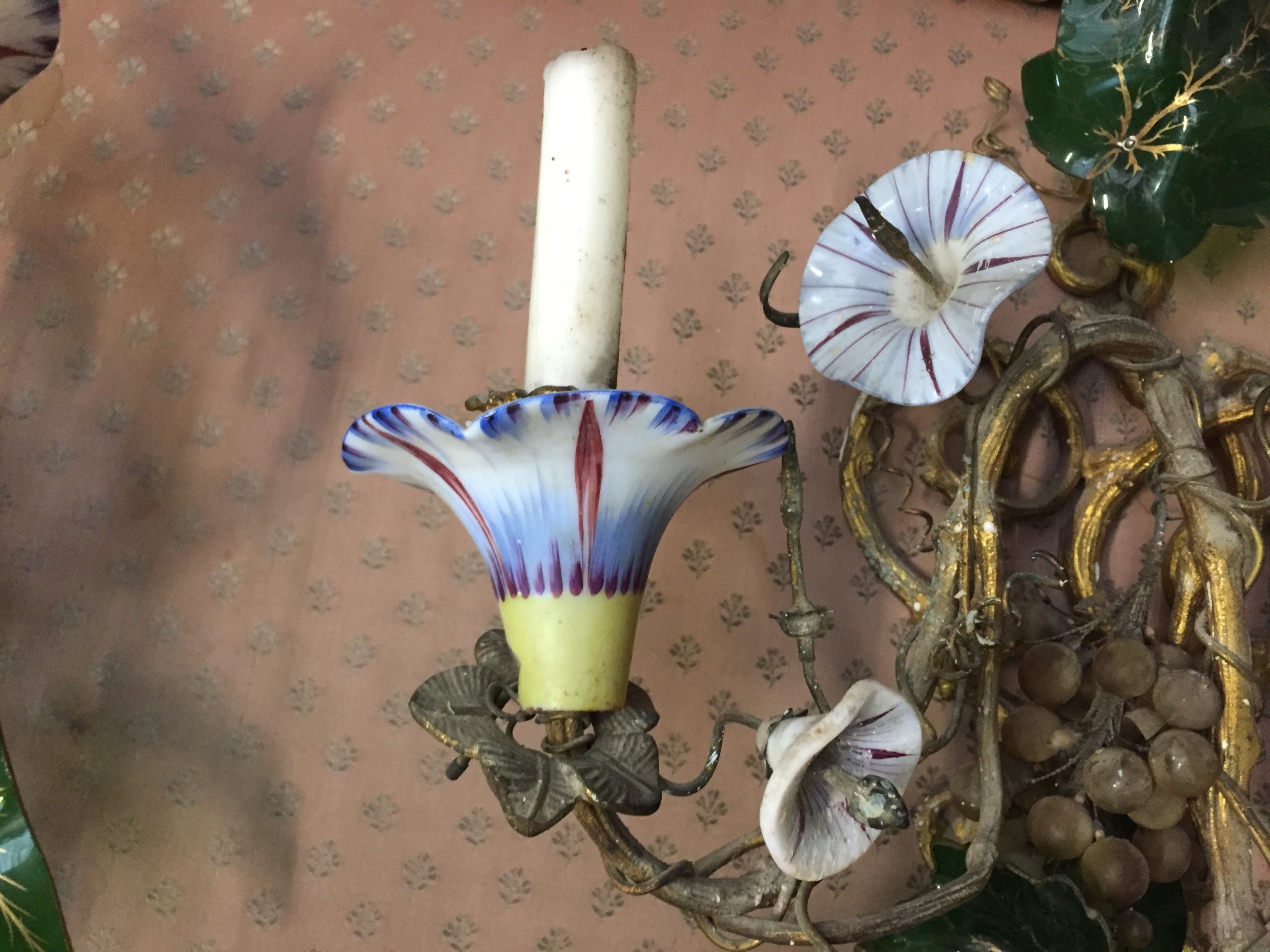 ouvragées de pampres, feuillages, corolles en bronze et verre émaillé. Trois lumières.