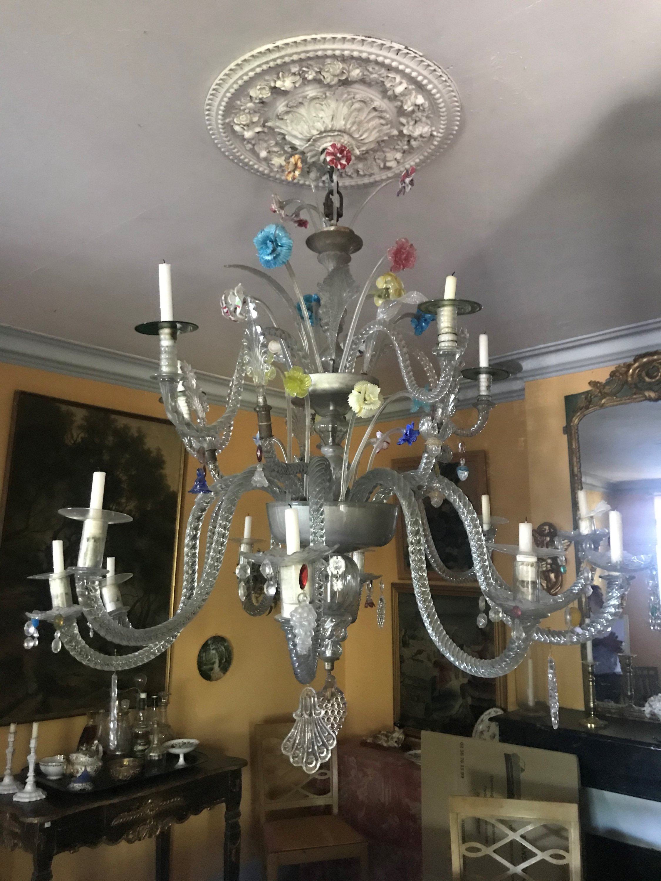 blanc et polychrome, à pampilles et pendeloques, trois couronnes comprenant vingt bras de lumière, dix bras de lumière dans la partie inférieure, cinq en partie intermédiaire, cinq dans la partie supérieure fixés dans des bassins. Les couronnes intermédiaire et supérieure composées denviron vingt-et-une fleurs épanouies et trois feuilles de palmes