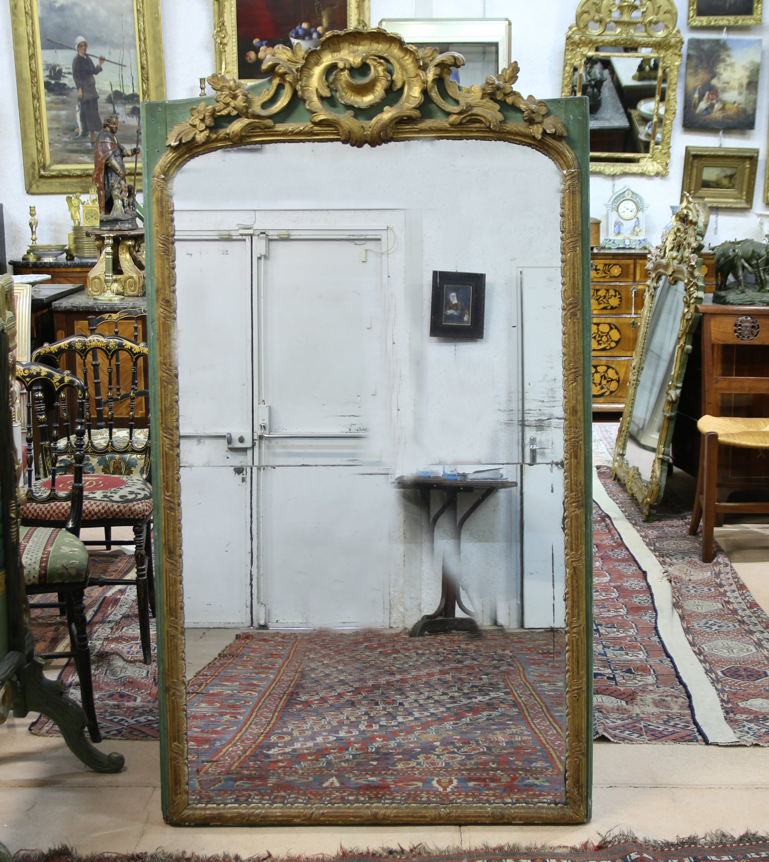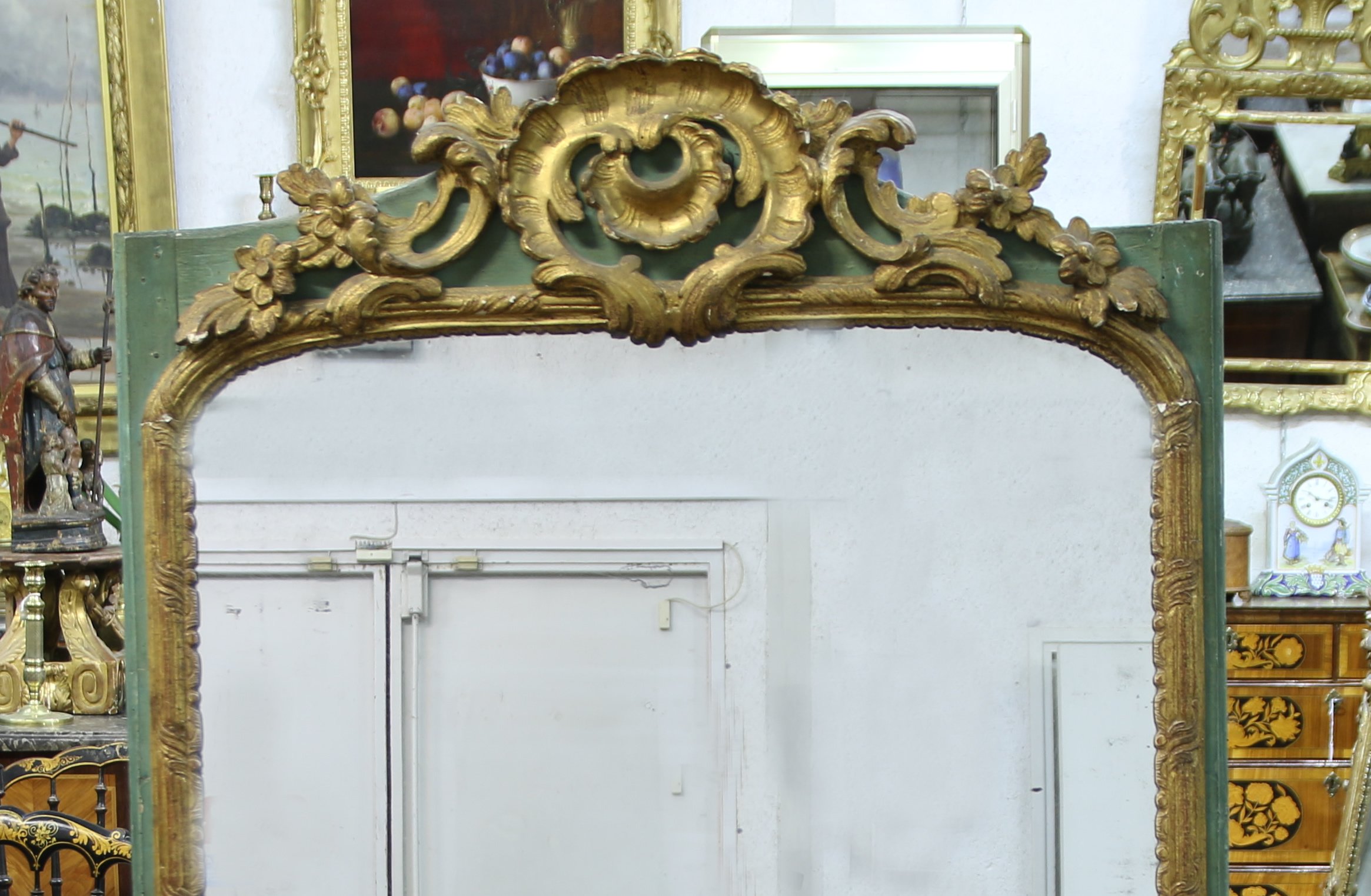 le fronton orné de motifs ornementaux rocailles: agrafes, feuilles d’acanthe et fleurettes. Miroir au mercure en deux parties.