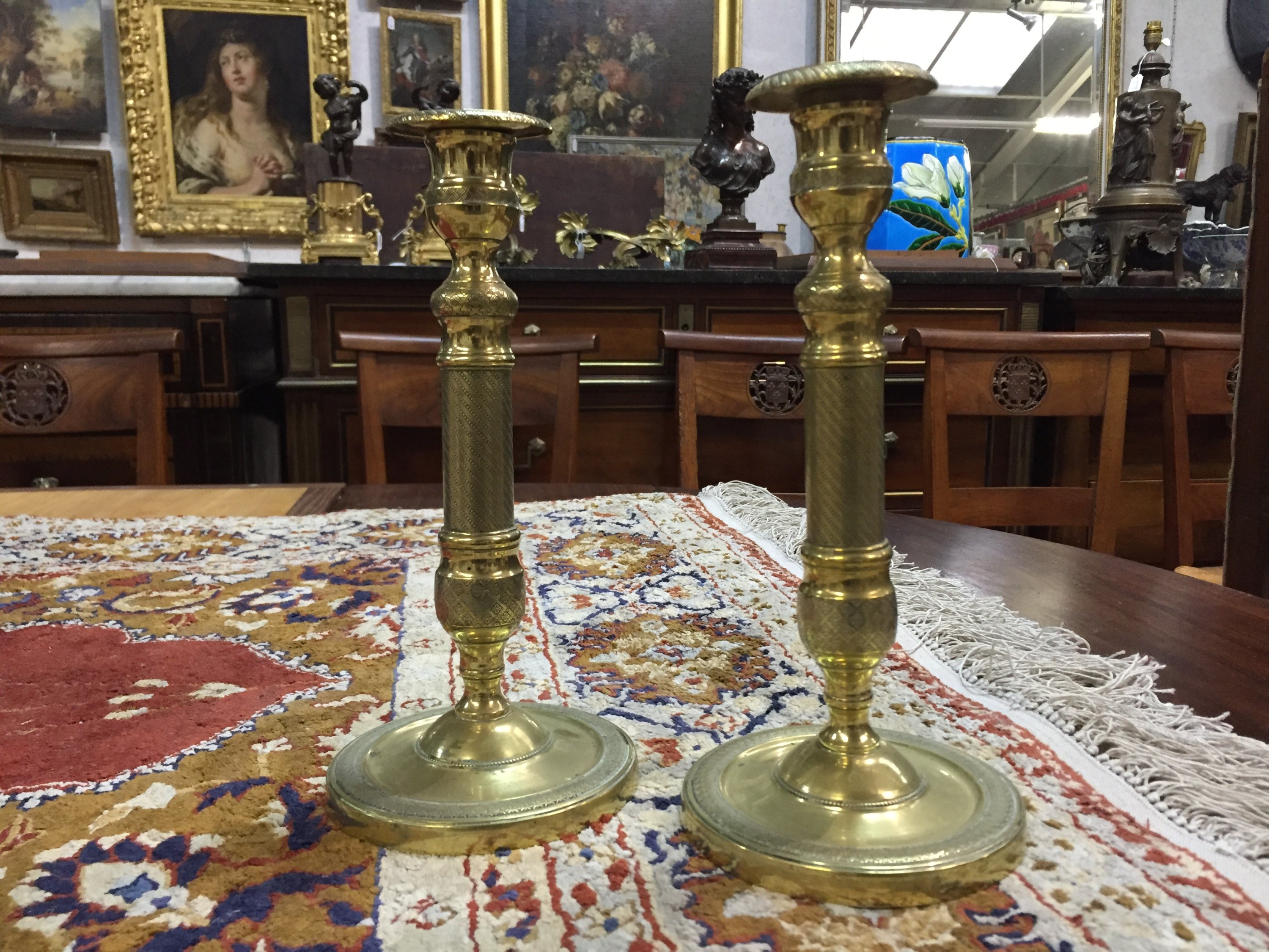 en laiton et leurs bobèches à décor géométrique gravé sur le fût. La base circulaire offre une frise de fleurettes cerclées.