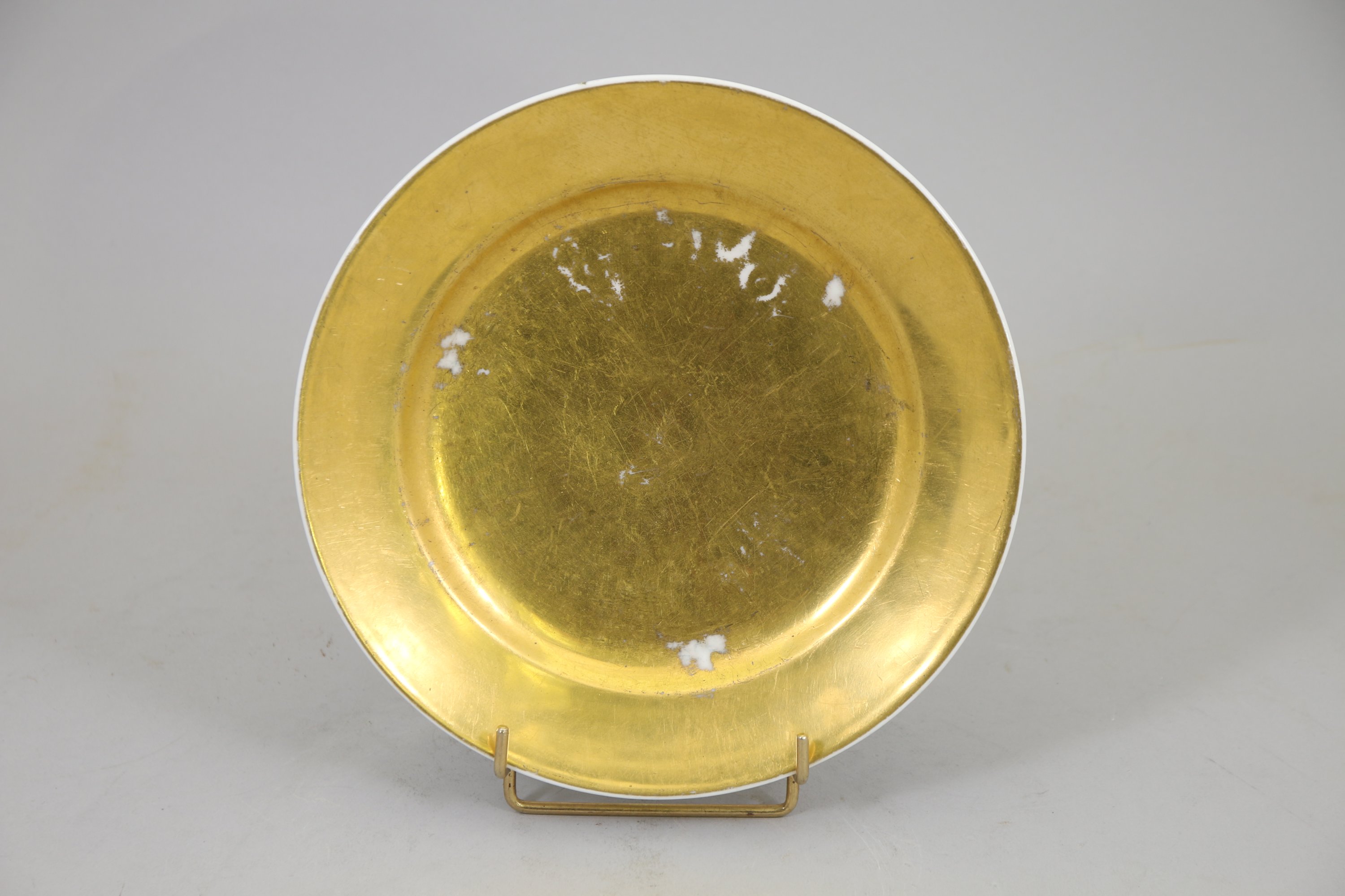 JOINT: une assiette en porcelaine dorée. Marque en creux. Diam. 22,3 cm. (effacement de la dorure).