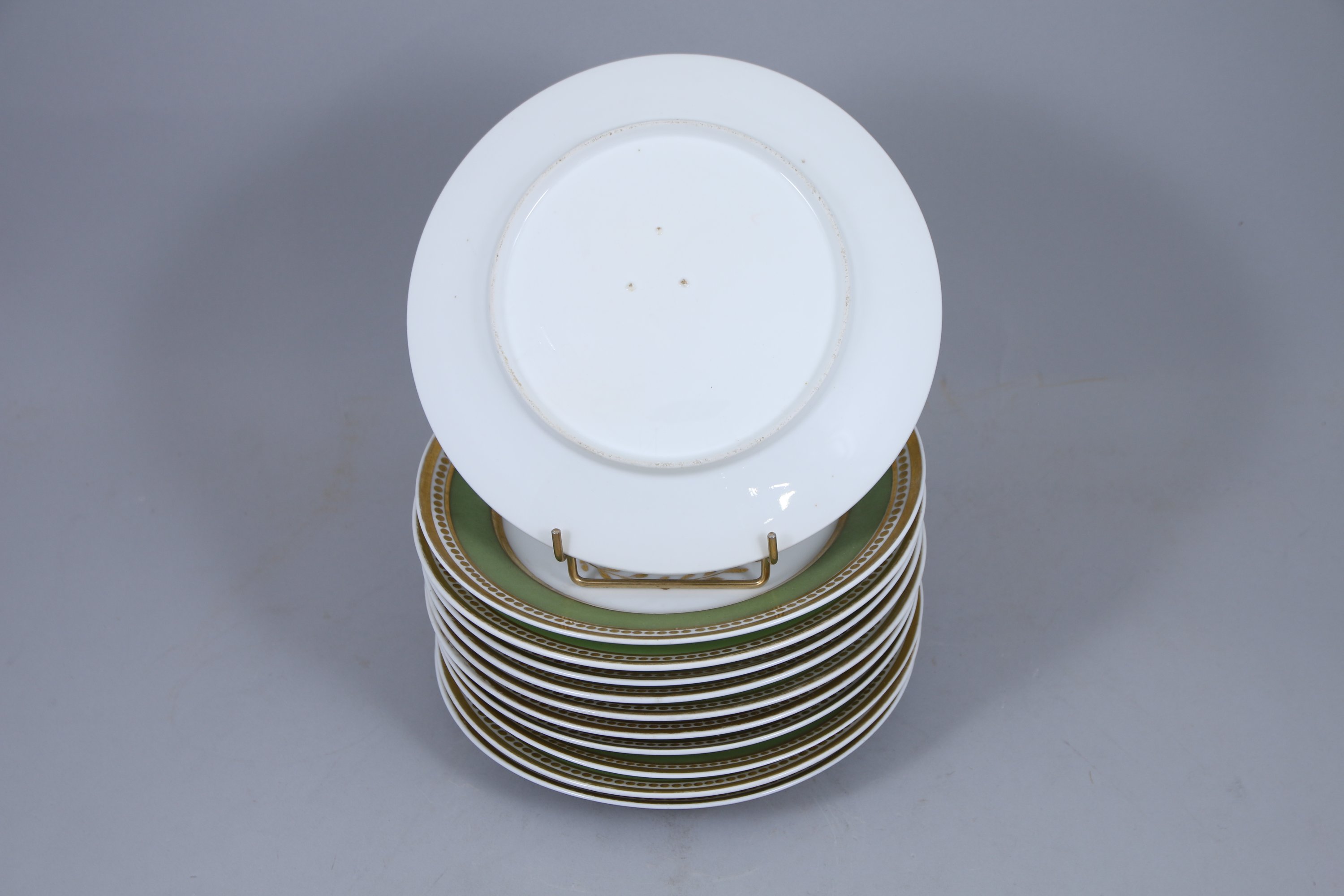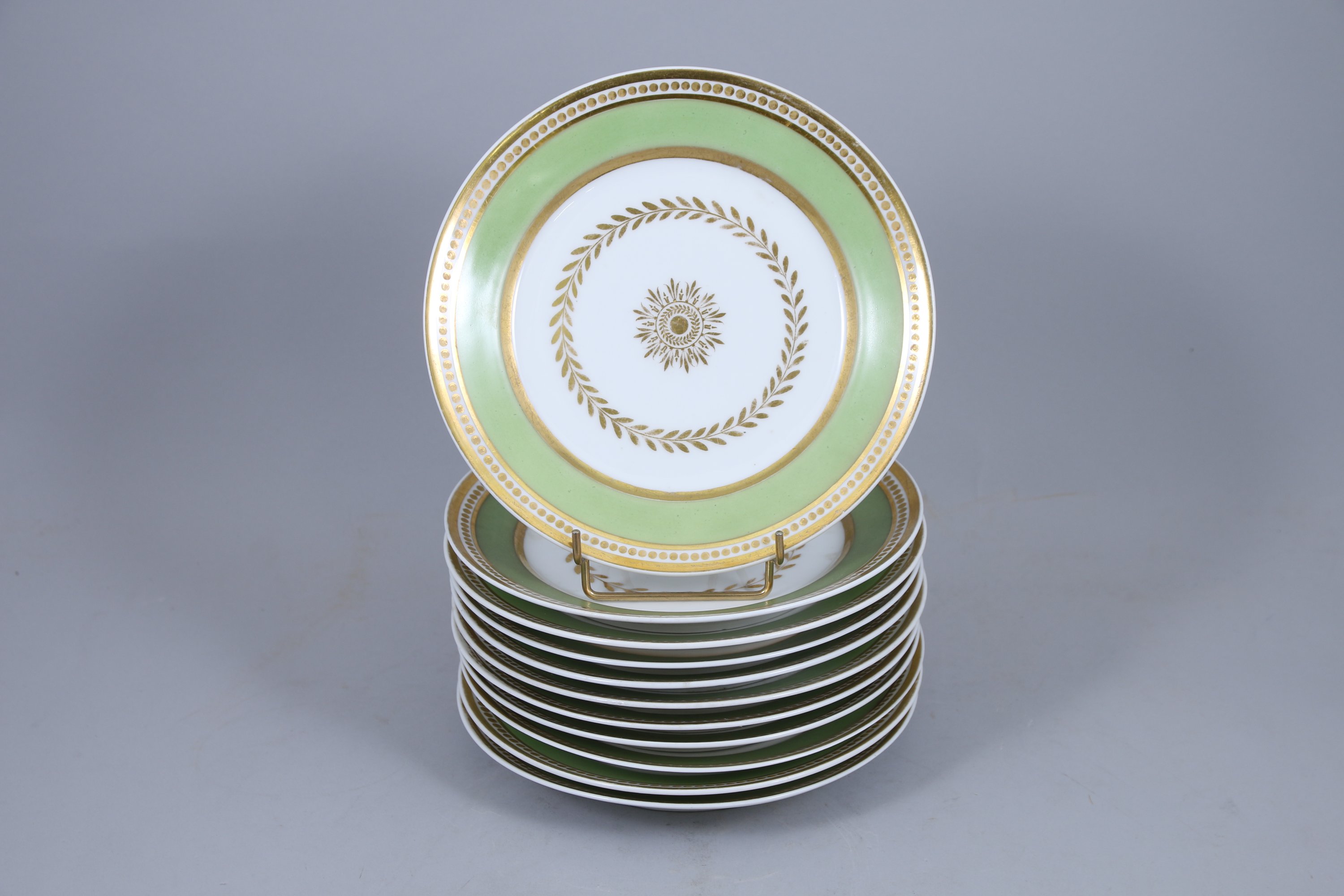 en porcelaine blanche et verte et filets d’or, le marli à décor de perles entre deux filets, le creux orné d’un médaillon à feuilles de lauriers cerclant un motif végétal stylisé.