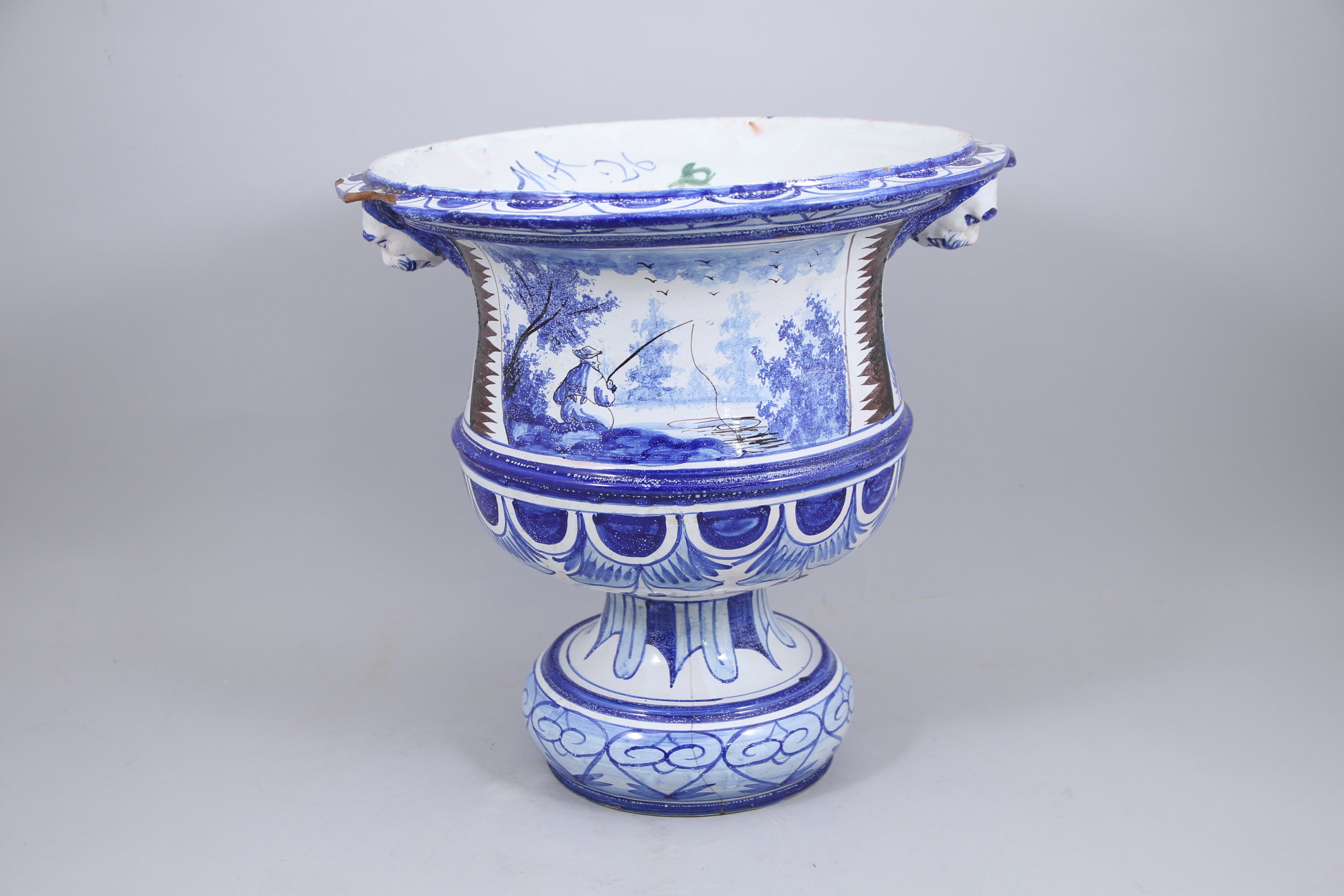 en faïence en camaïeu de bleus à décor de maisons et de pêcheurs.