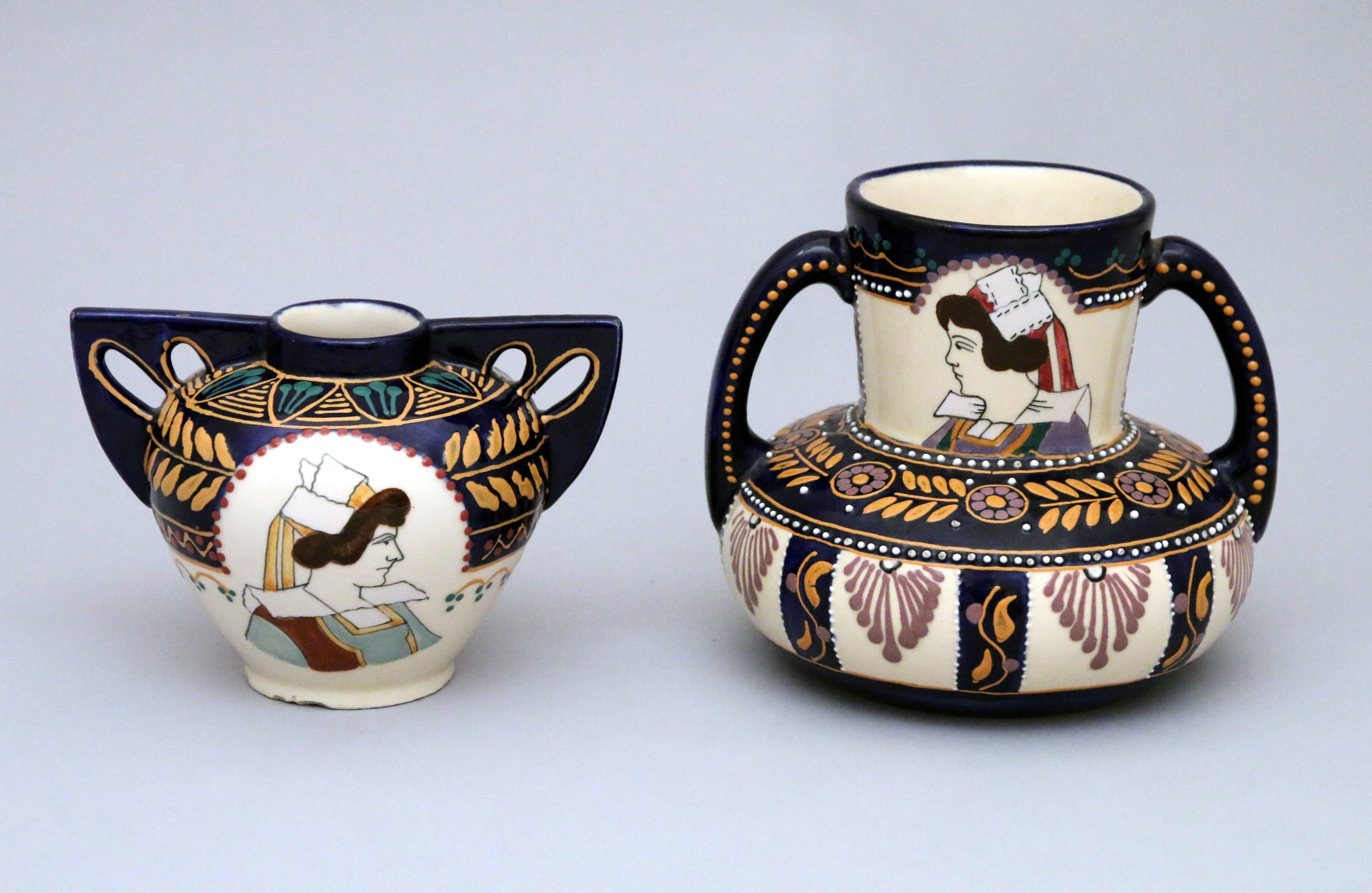 - un VASE à deux anses, de forme renflé à décor broderie et d'un profil de bretonne tourné vers la gauche. Marque HB Quimper 972. Haut. 15, Larg. 16,5 cm.
