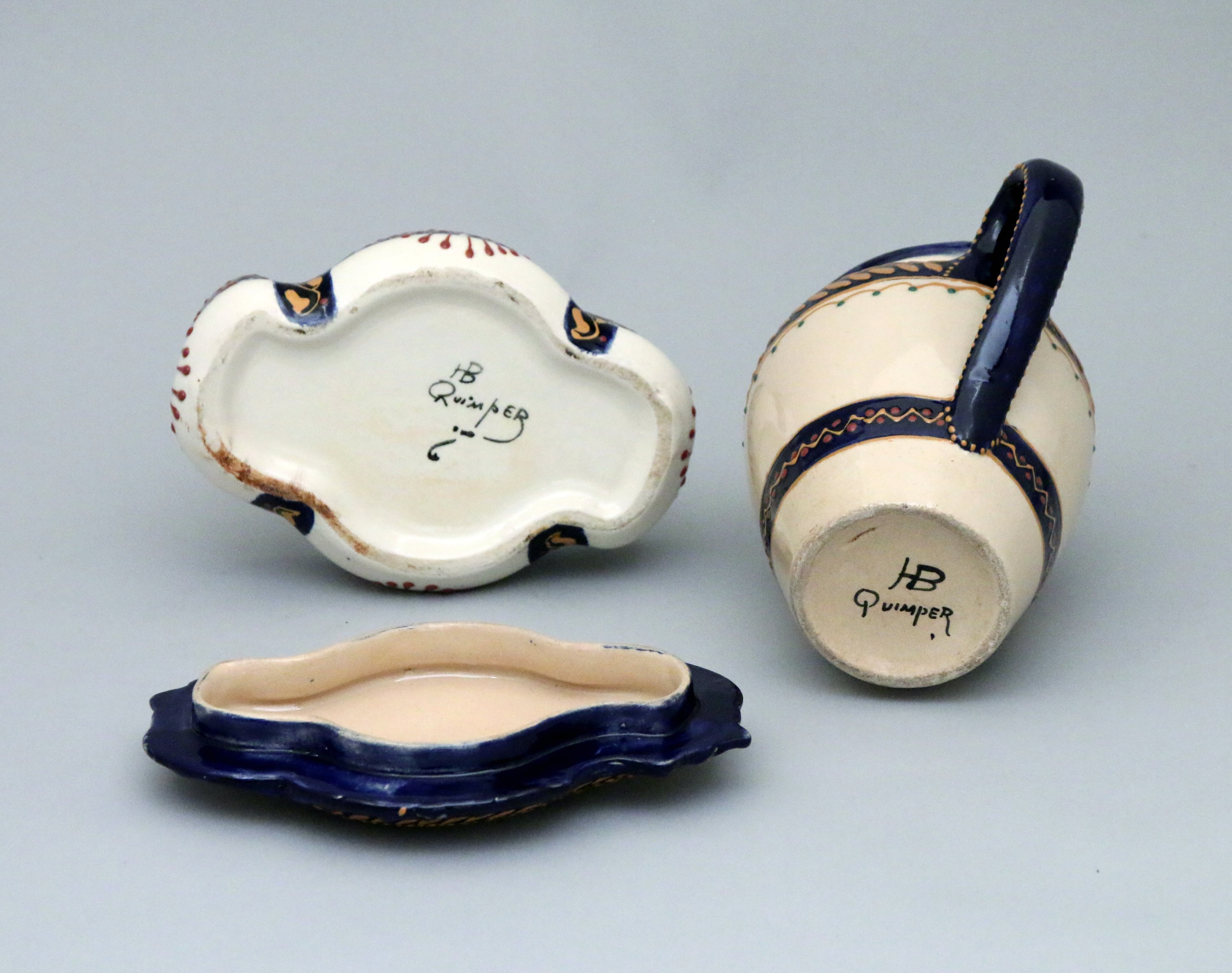- une BOÎTE et son COUVERCLE AMOVIBLE de forme mouvementée à décor de feuilles et motifs bigoudens. Marque HB Quimper. Haut. 5,5, Larg. 12,5, Long. 17.
