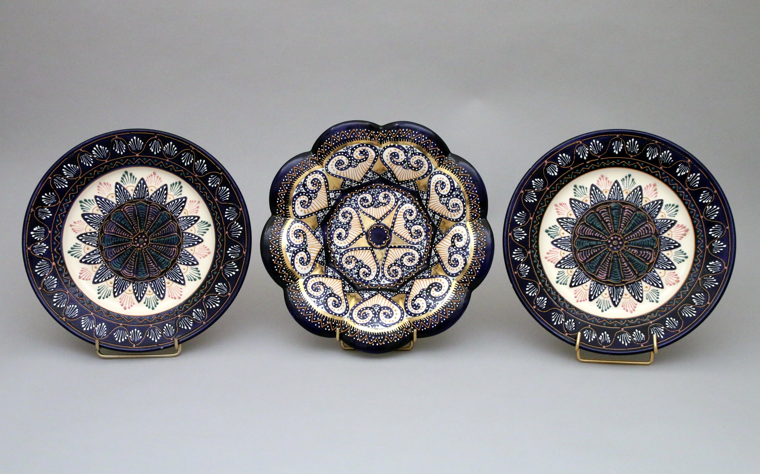 - une COUPE de forme corole à décor perlé polychrome et or de motifs de broderies. Marque HB Quimper 264 P.H. Haut. 5, Diam. 25 cm.