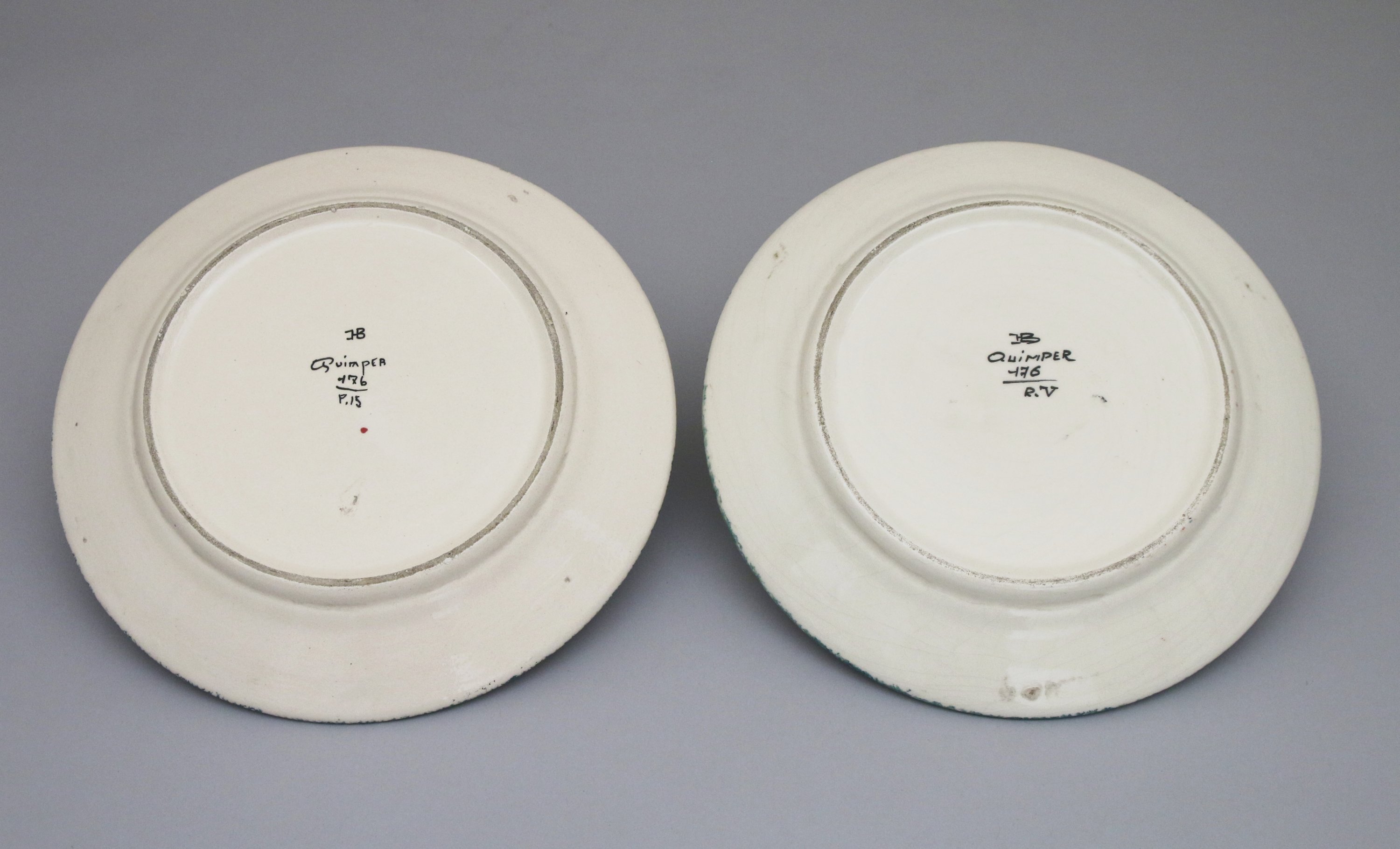 - Deux ASSIETTES à décor au centre, pour l'une d'un profil de bigouden tourné vers la droite, et pour l'autre d'un profil de bigoudène tournée vers la gauche. L'aile à décor fleuri. Marque HB Quimper 176 P.15 pour l'une et HB Quimper 176 R.V pour l'autre. Diam. 23,5 cm.