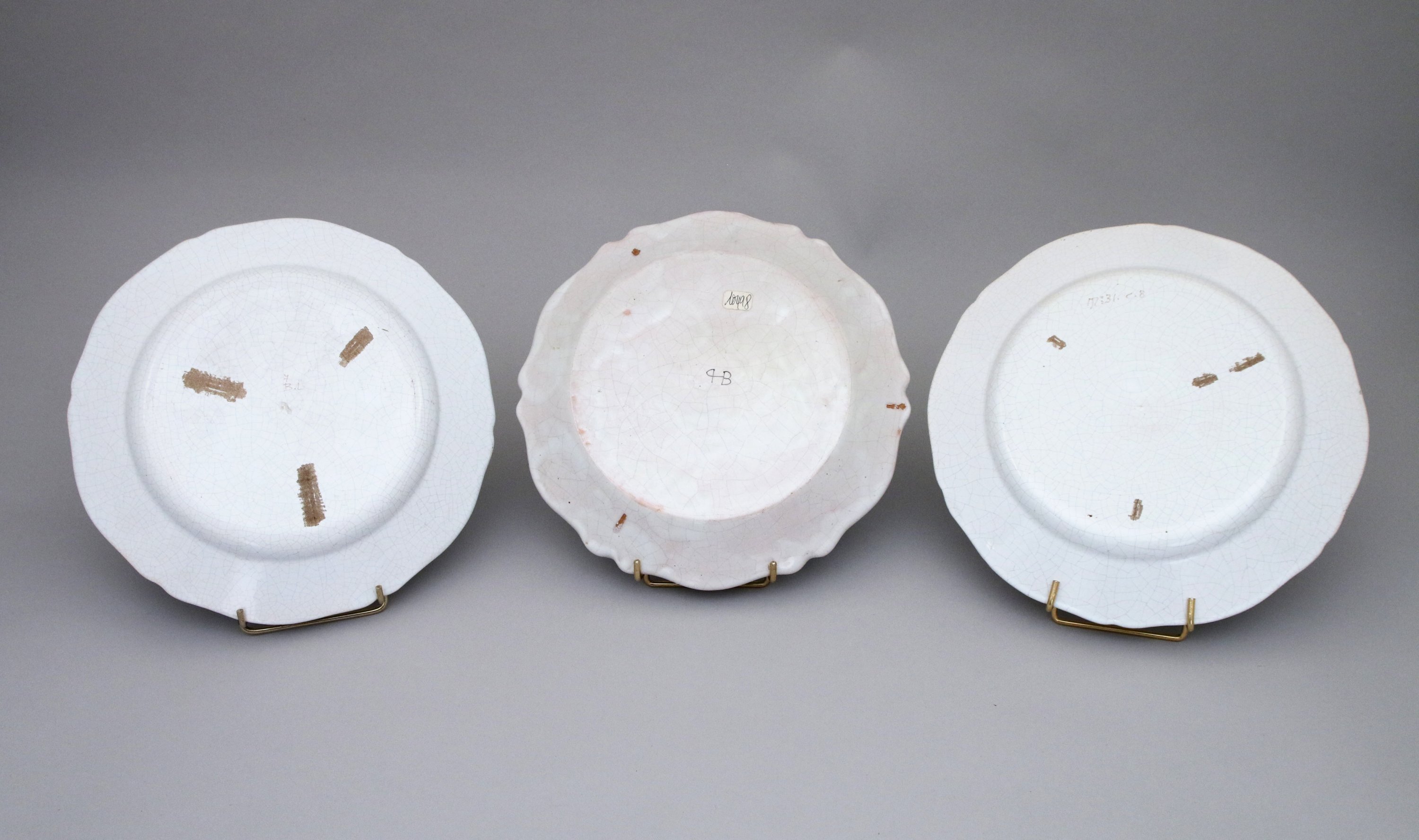 JOINT: Attribuée à POUPLARD-BÉATRIX, Malicorne. ASSIETTE à bord contourné à décor d'une bretonne entre deux rameaux fleuris. Aile à décor d'une guirlande de feuilles et de fruits. Marque PB . Fin du XIXe. Diam. 24 cm.