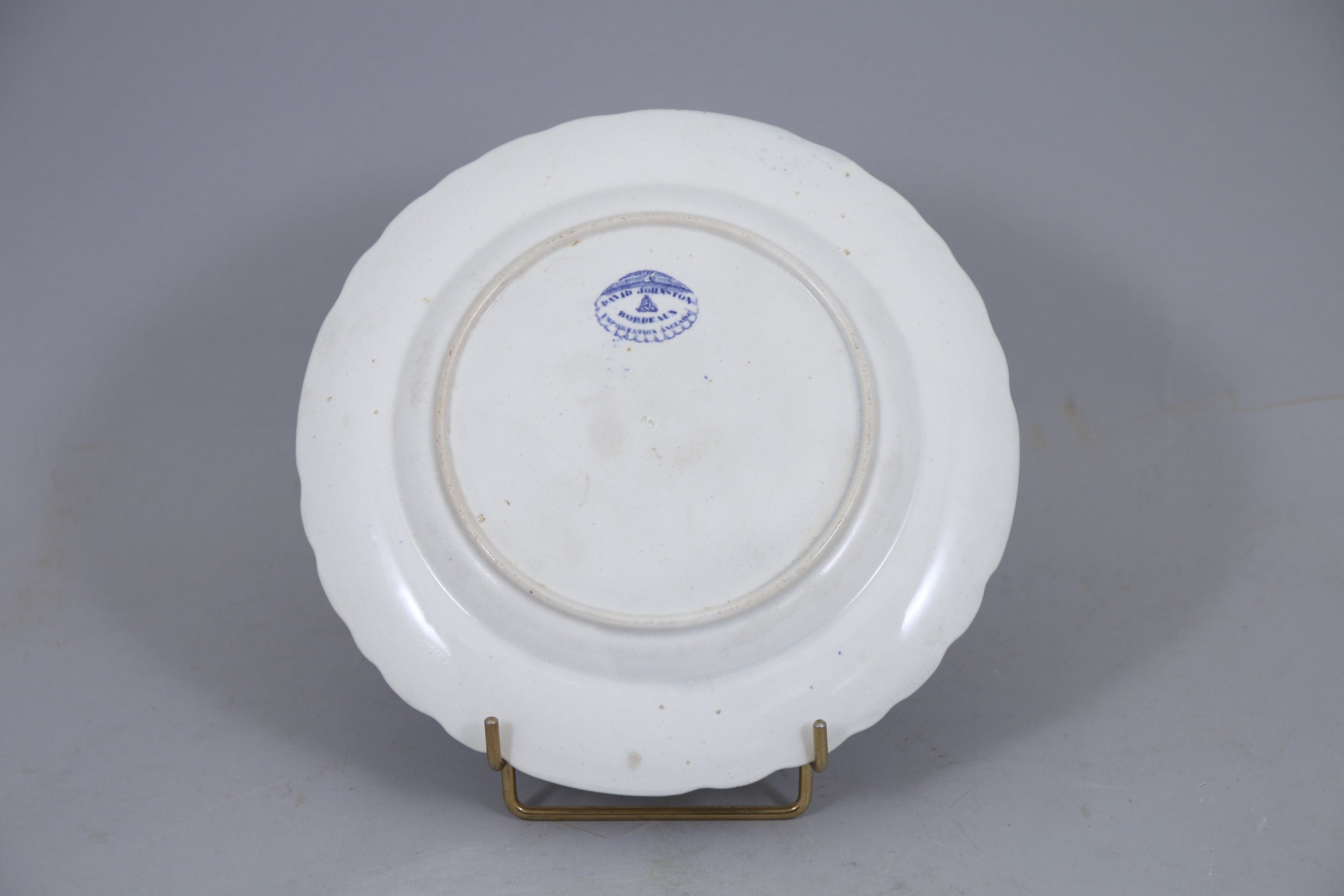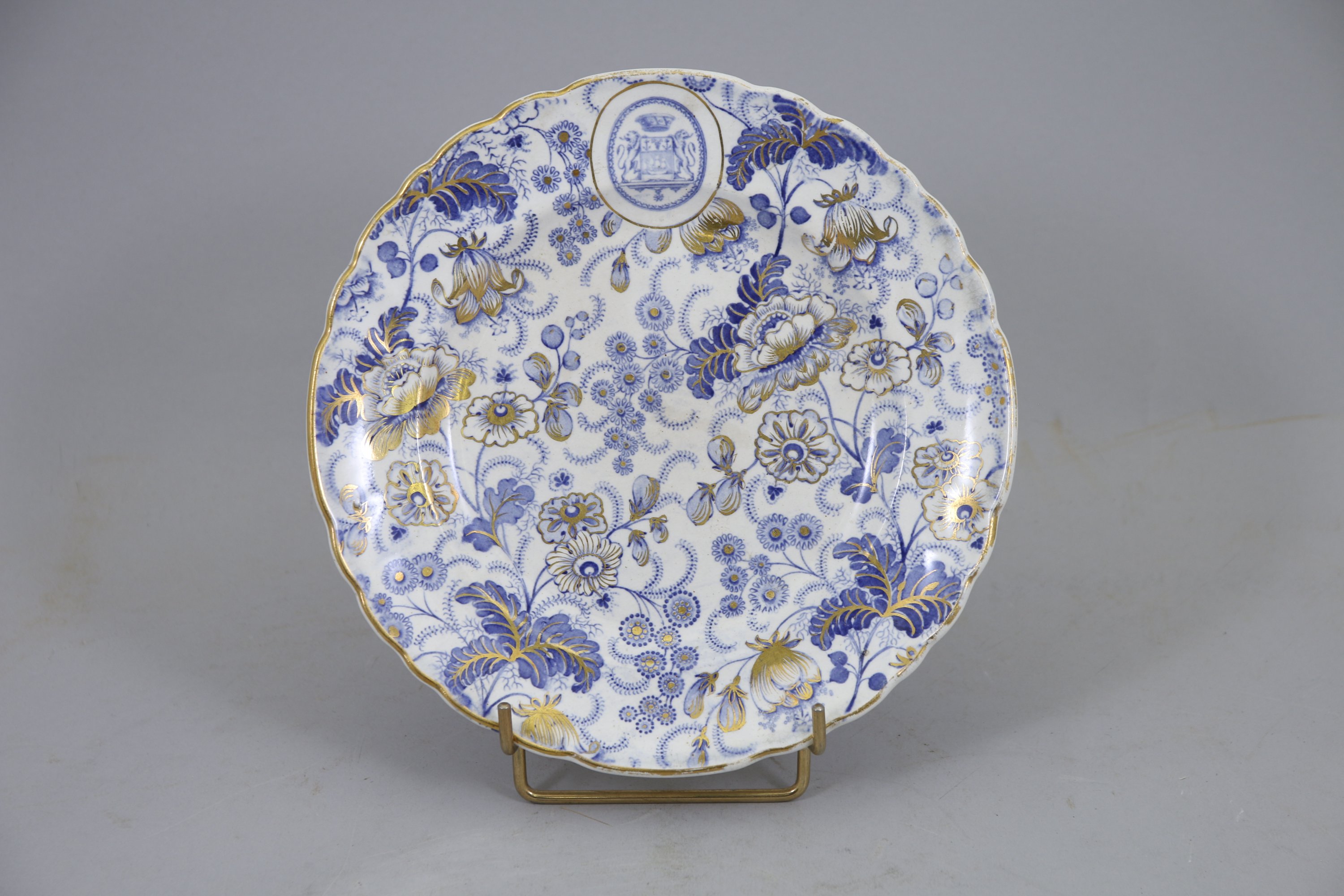 Joint: Bordeaux, David Johnston. Une assiette en faïence blanche à décor végétal bleu et rehaut d’or présentant sur le marli et la descente une armoirie à la couronne de baron. Marque à la coquille. Diam. 21 cm.