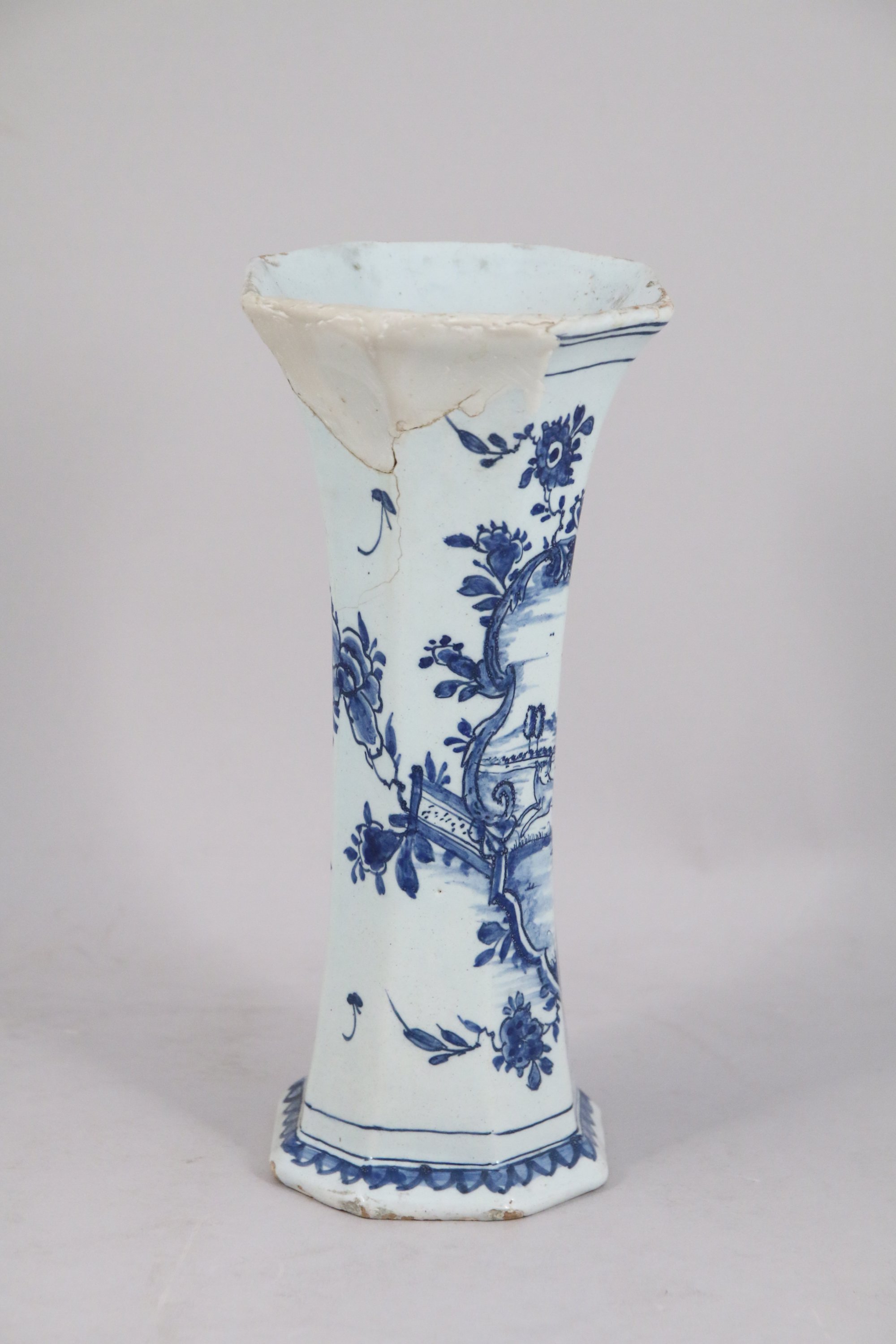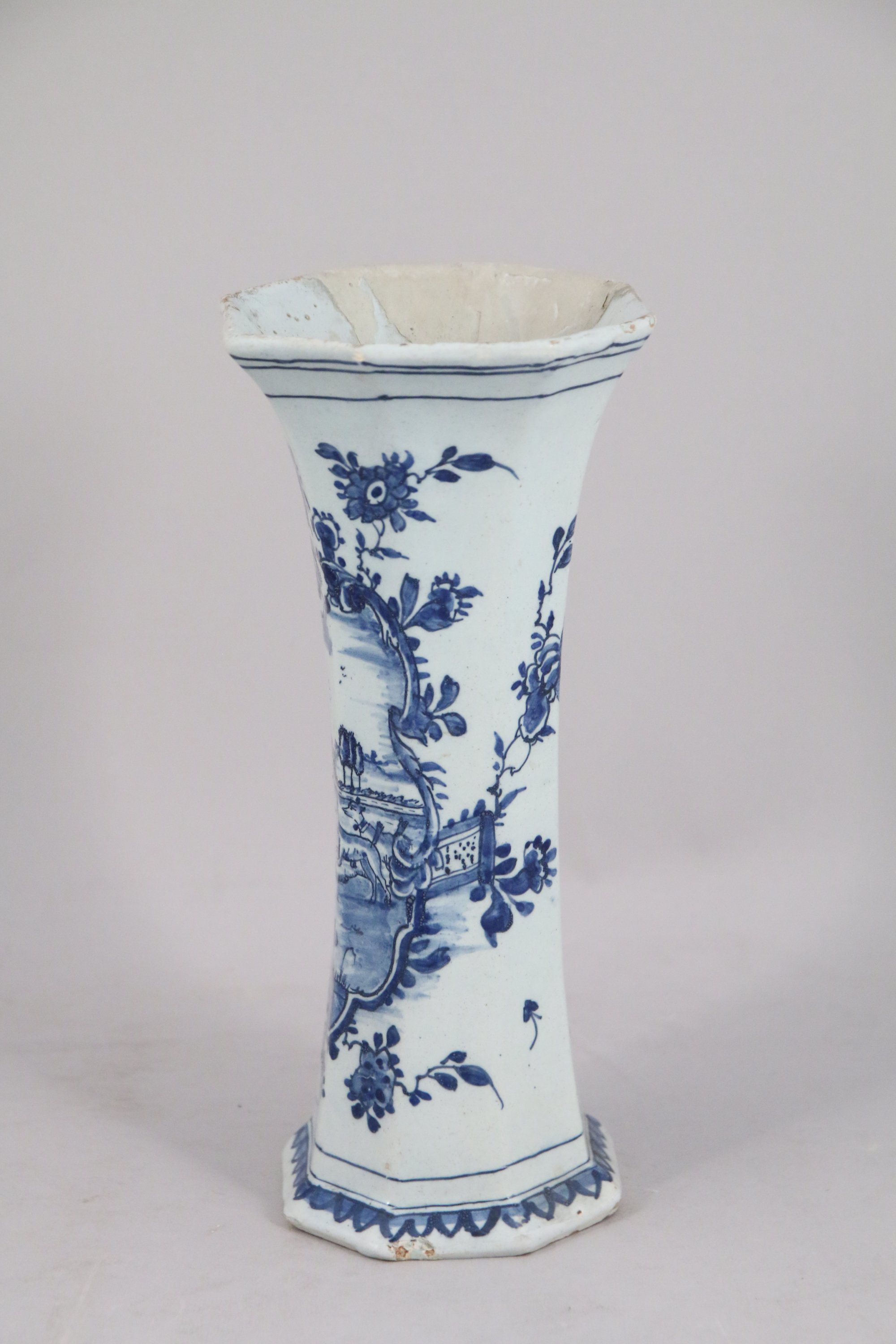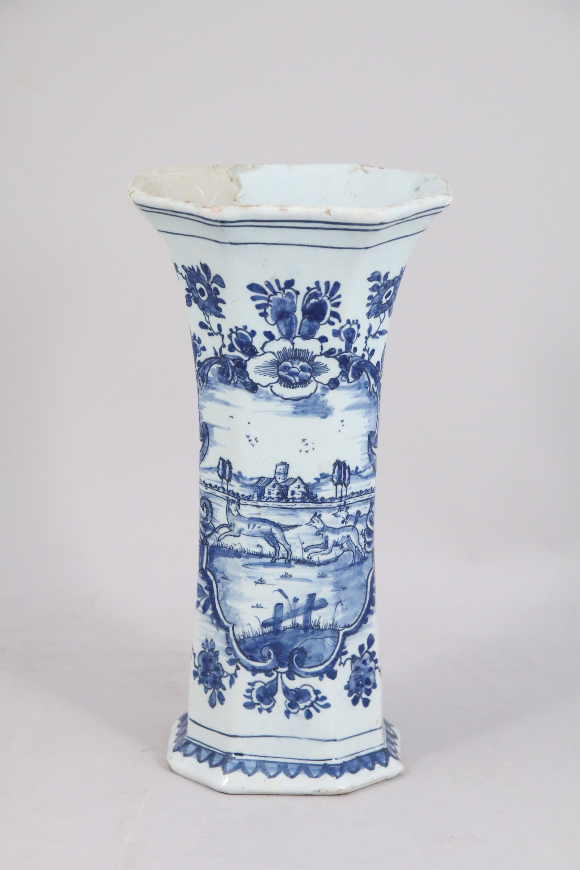 - VASE CORNET à décor d'un cartouche fleuri représentant un scène de chasse au loup dans un paysage arboré. Haut. 24, Long. 12,5 Larg. 10,5 cm (accidents et restaurations).
