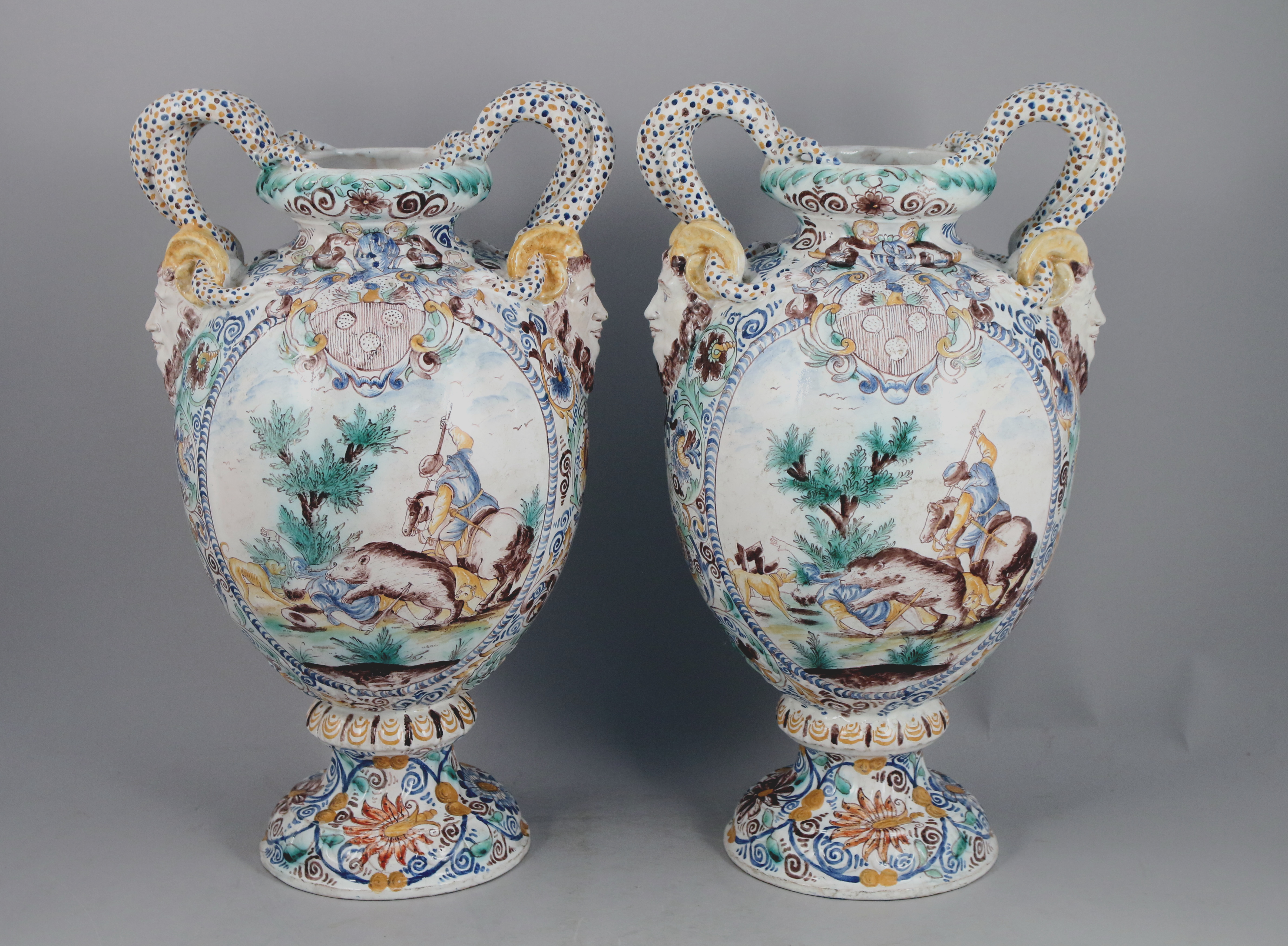 en faïence polychrome à décor de motifs fleuraux à deux anses torsadées se terminant par des têtes de satyres. La panse offrant un blason surmontant sur une face une scène de chasse à courre, sur l'autre une chasse à l'ours.