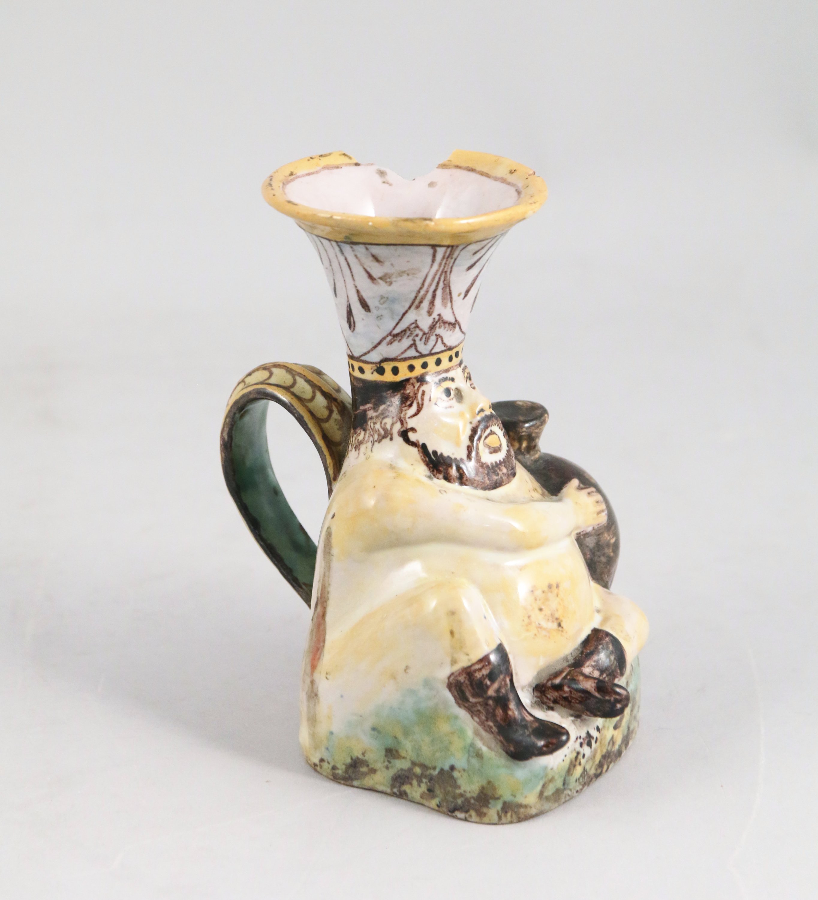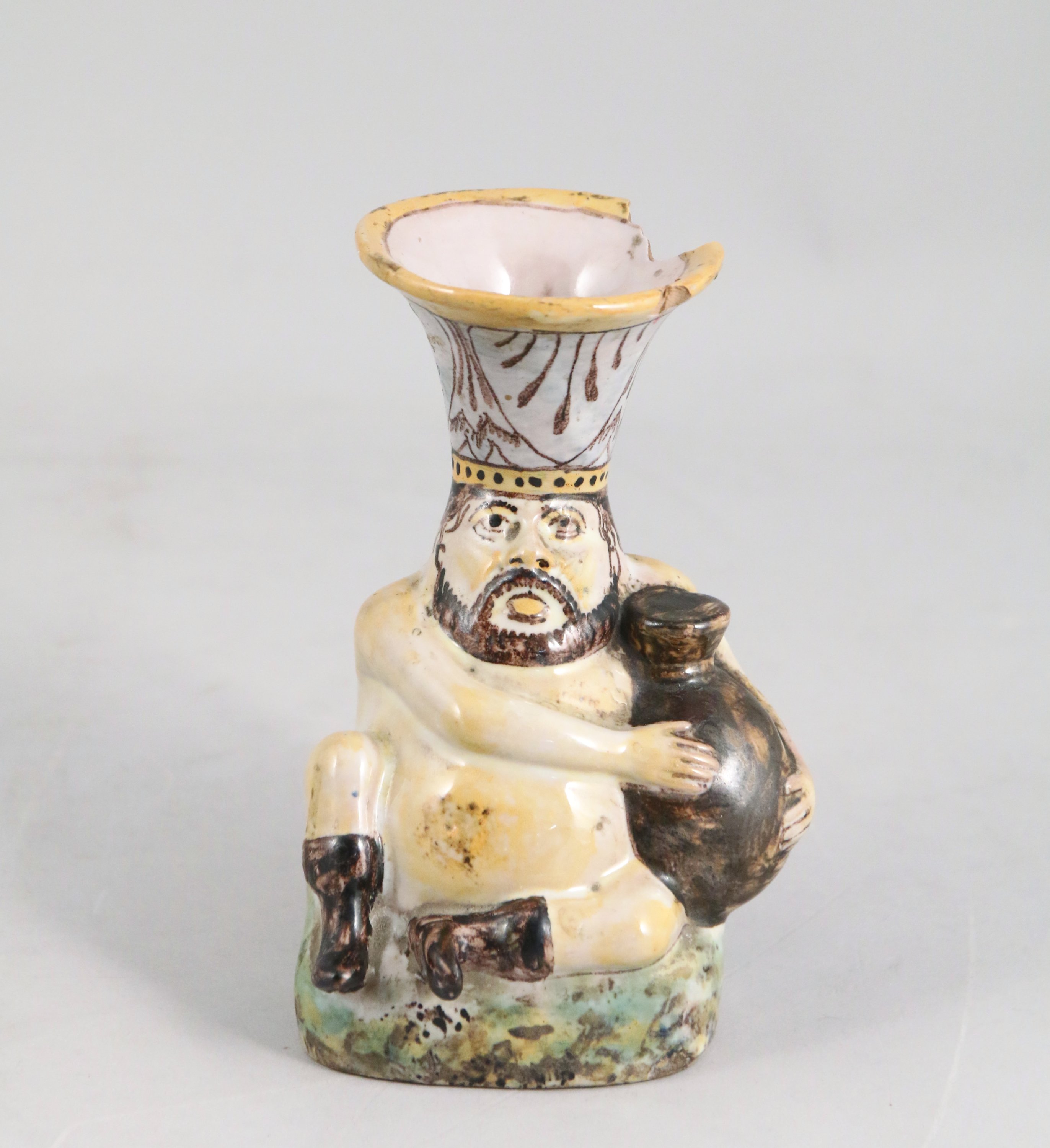 en faïence émaillée de forme anthropomorphe figurant un homme barbu, simplement chaussé de bottes, accoudé à une outre et assis contre la prise ornée d'une frise écaillée. Le col évasé à décor géométrique.
