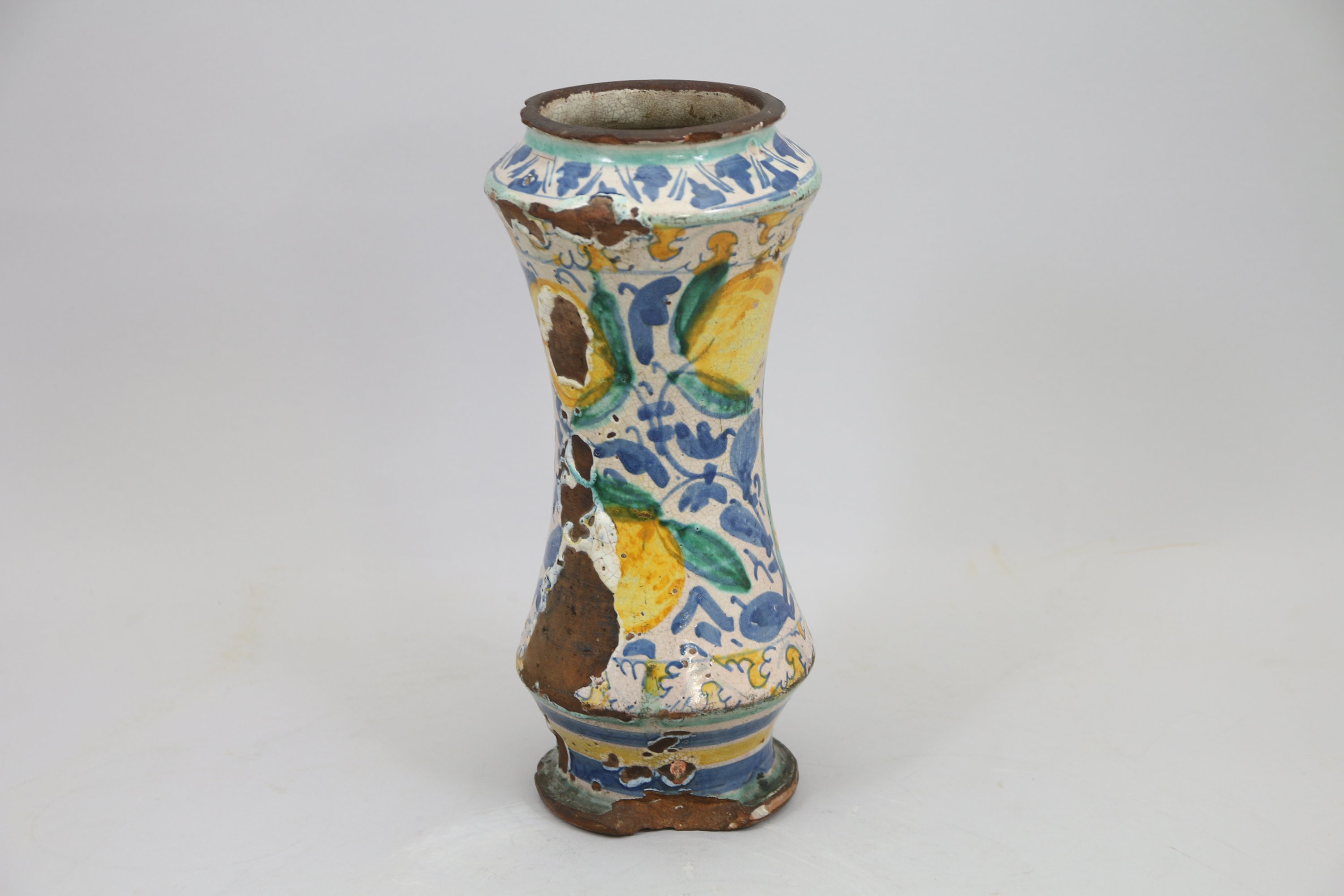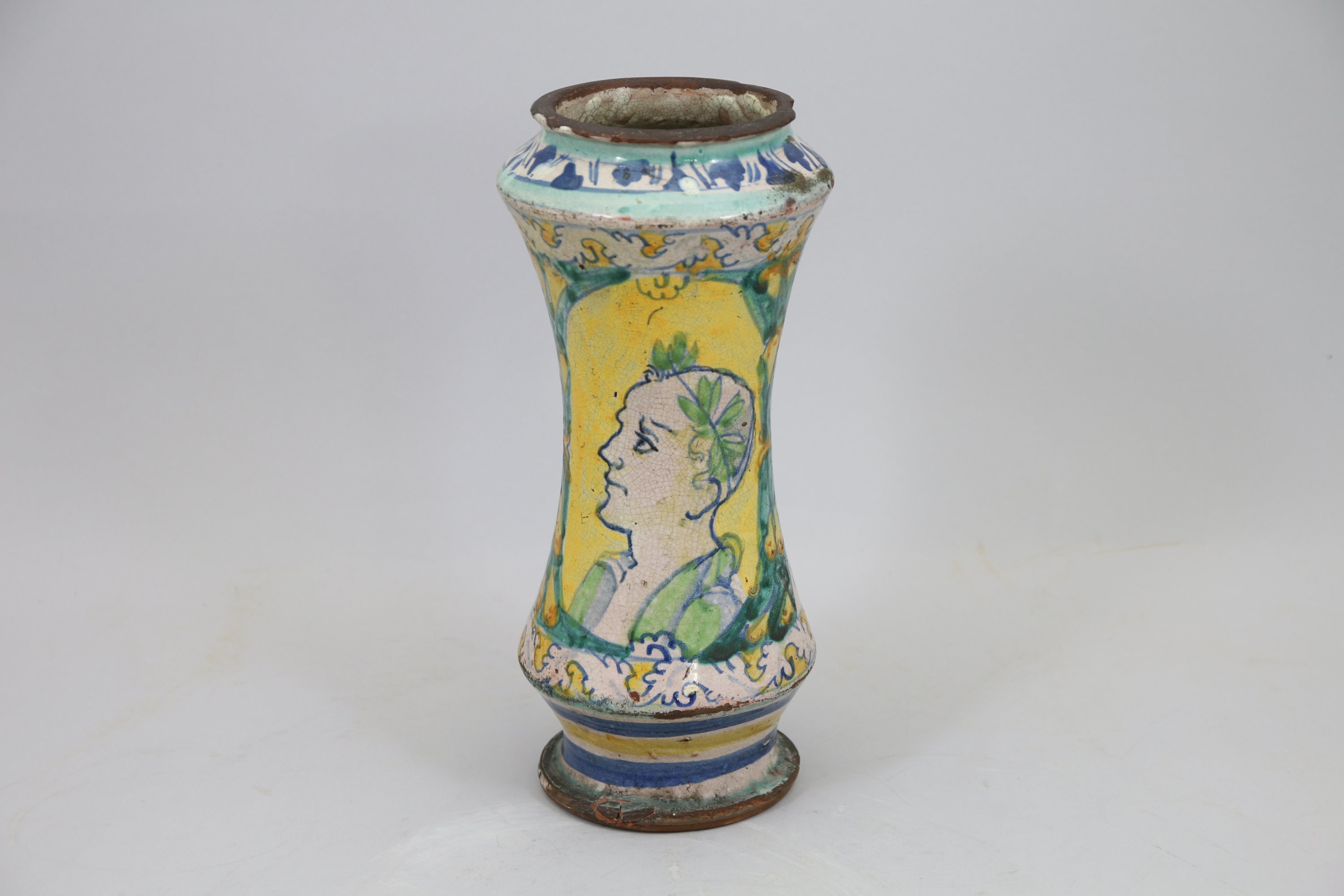 Albarello en majolique à décor d’un portrait d’homme en buste dans un médaillon à fond jaune cerné de fruit et feuillage.