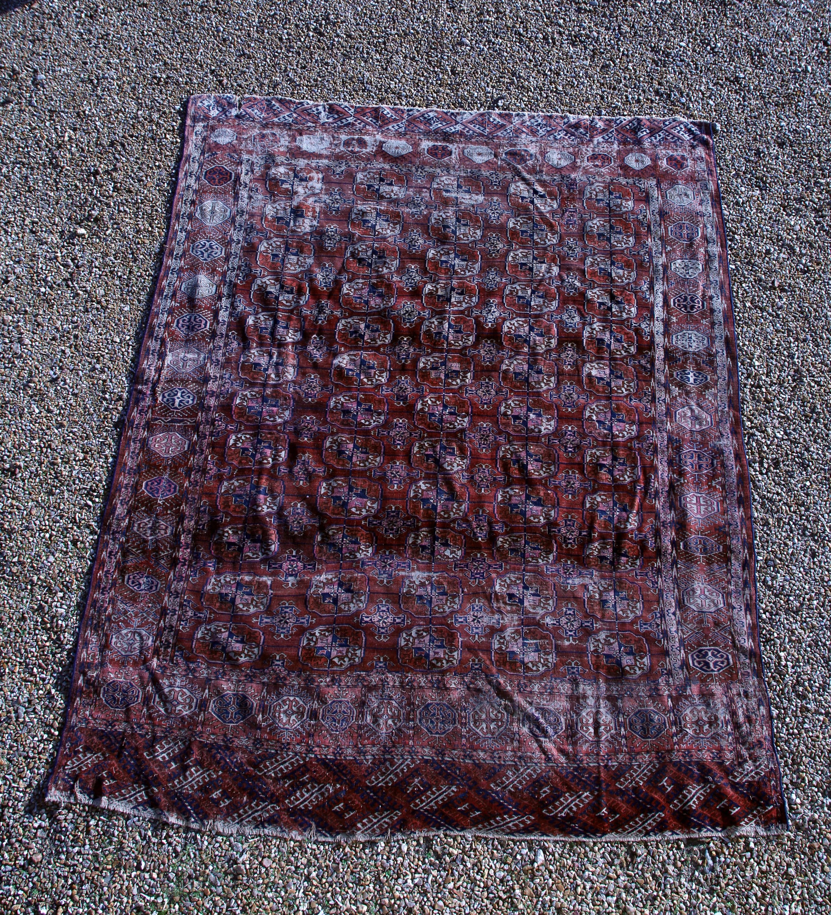 TAPIS BOUKHARA, début XXème siècle, fond rouge, décor de cinq rangées de douze guls, bordure géométrique (importantes usures et déchirures).