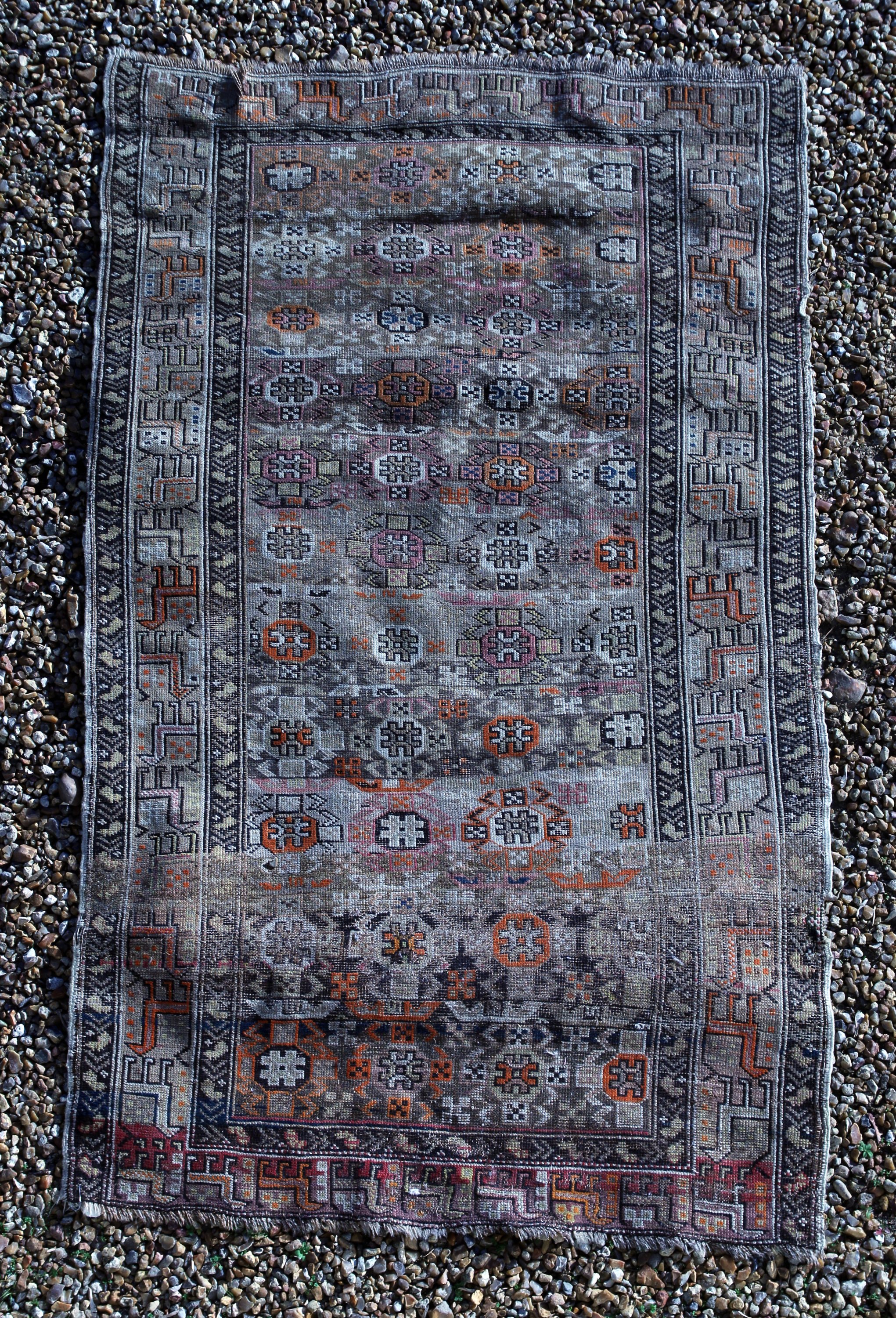 TAPIS ANATOLIE, fond alternativement gris et orange chargé de fleurs et motifs cruciformes, bordure de chiens, galon sur deux côtés (importantes usures, manque aux extrémités).