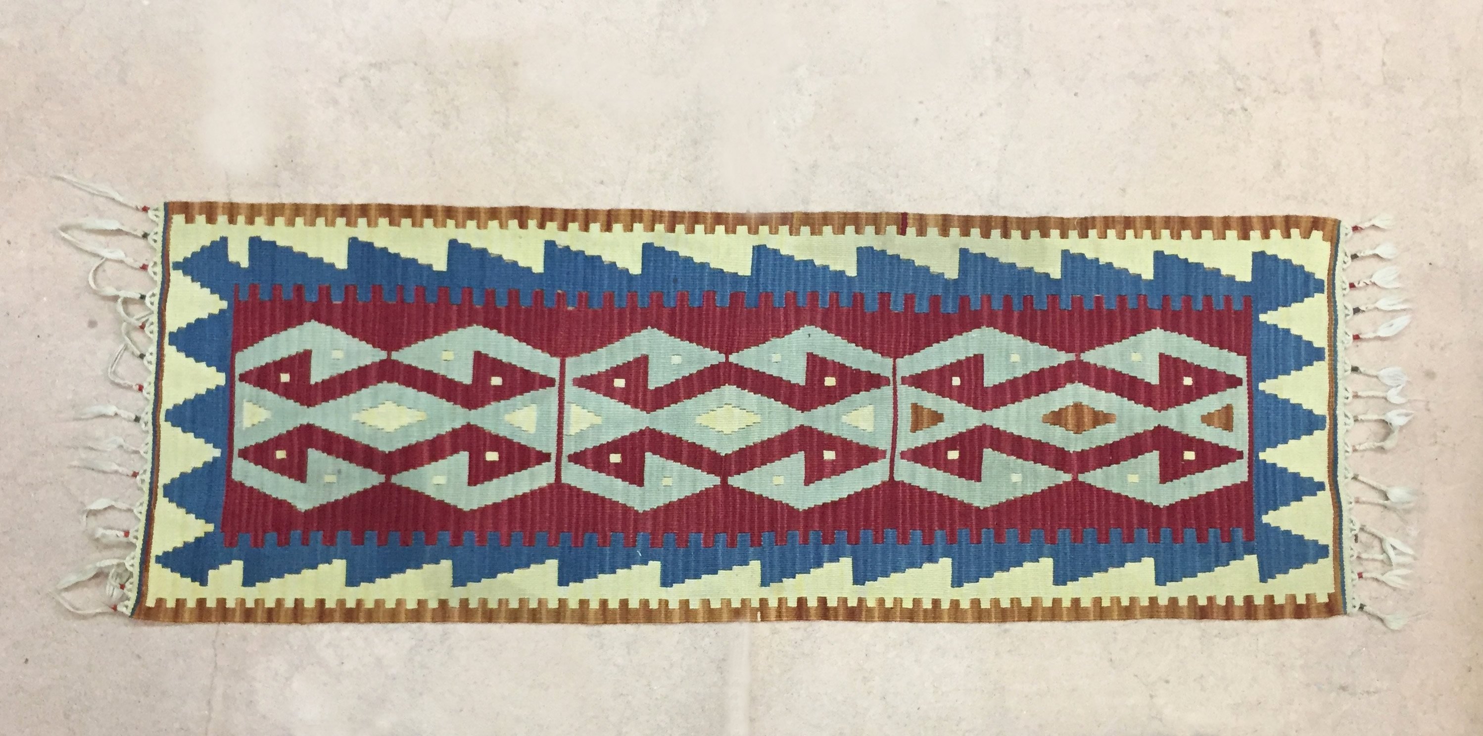 CAUCASE. Petit TAPIS en laine de style caucasien à motif de double médaillon losangique sur fond rayé vert et bleu. Bordure principale rouge.