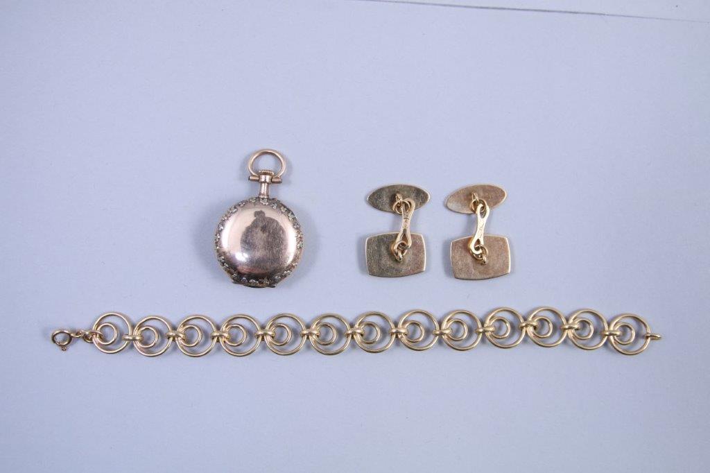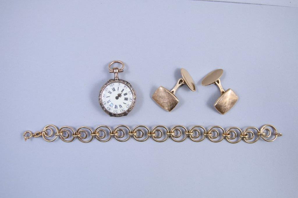 LOT comprenant un BRACELET à mailles à double anneaux mobiles et une paire de BOUTONS de MANCHETTES de forme rectangulaire en or jaune 750 millièmes.