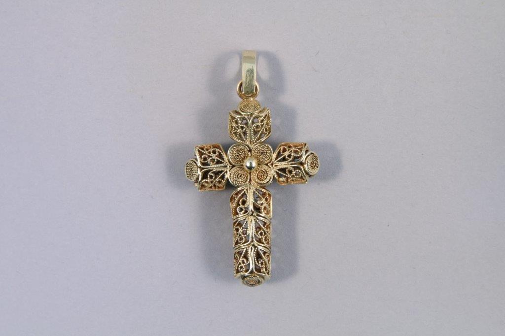 PENDENTIF en forme de CROIX en or jaune 750 millièmes aux motifs filigranés. Elle est ornée de six DIAMANTS.