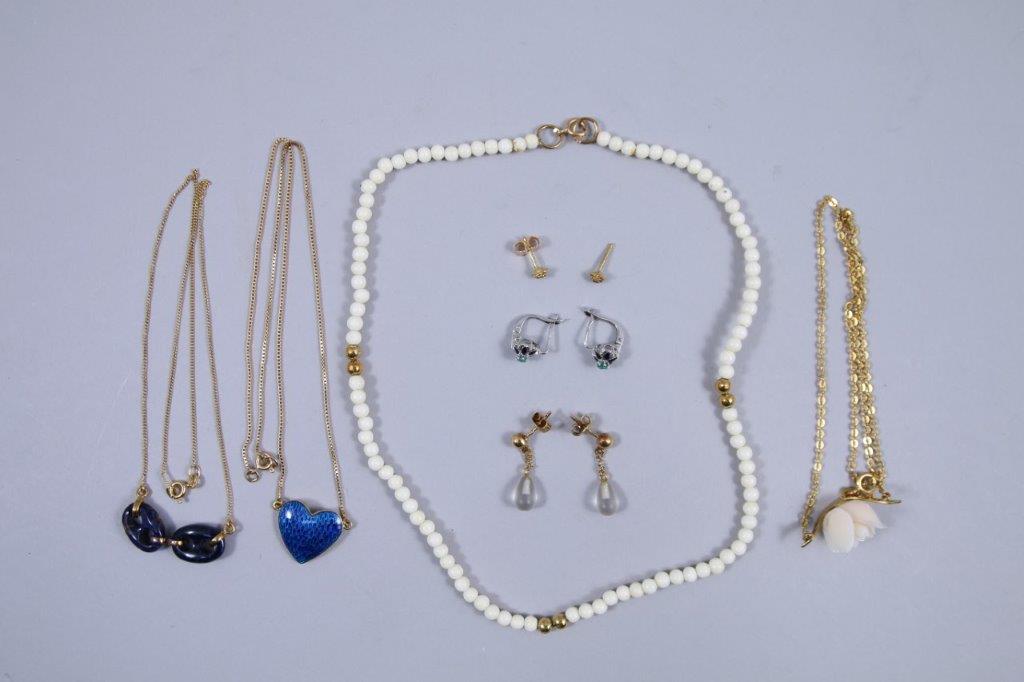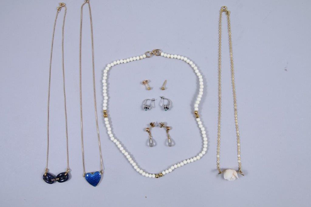 LOT comprenant trois PENDENTIFS et leurs CHAÎNES et trois paires de CLOUS et BOUCLES d'OREILLES en or jaune et gris 750 millièmes. Ornés d'émail et de pierres de couleur.